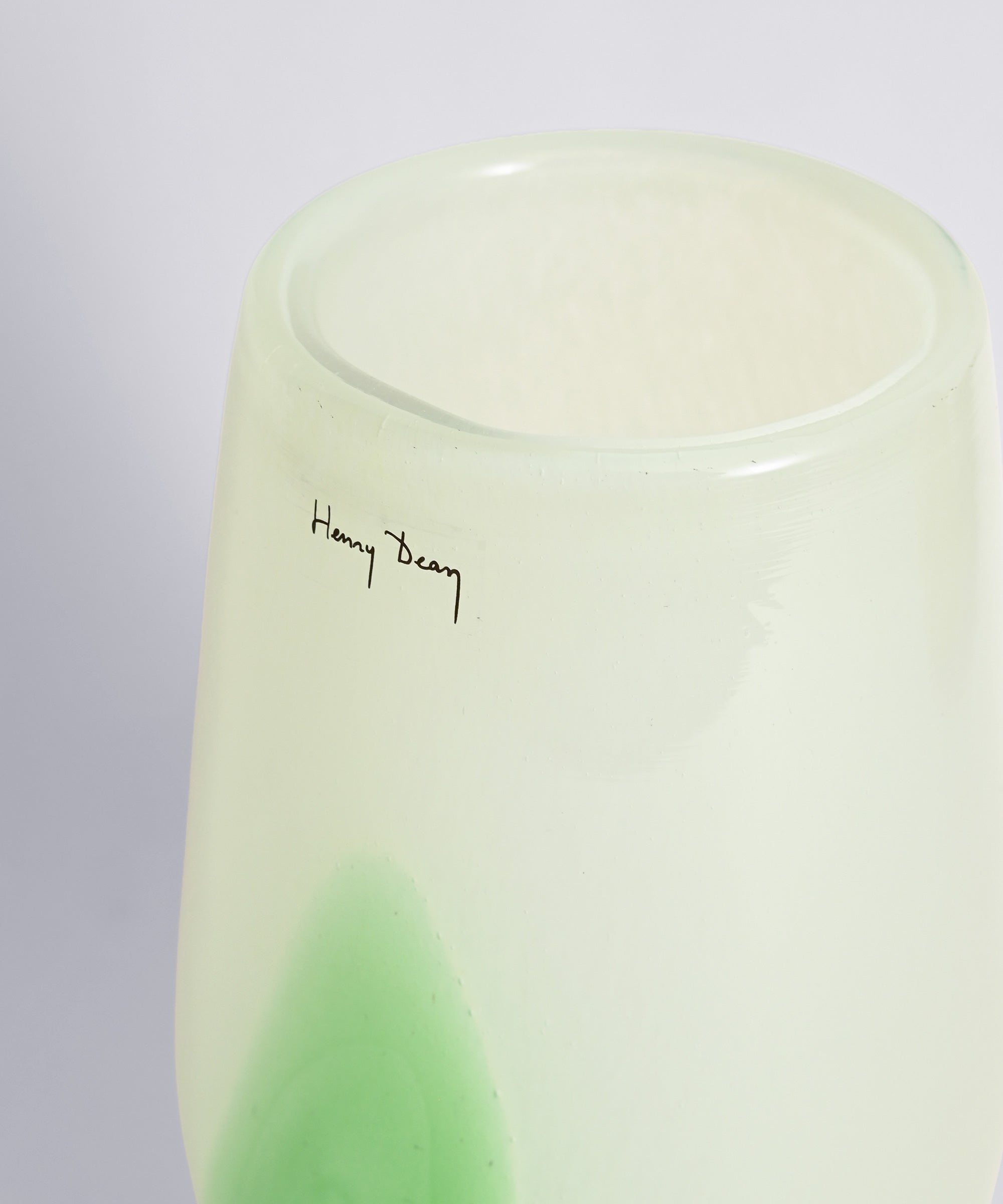 「ステイン」とは、消えることのない痕跡。このカラーは、吹き上げの工程で生まれる、唯一無二の“にじみ”から成ります。淡いベースカラーのガラスに、職人がグリーンまたはローズの色をそっと落とすと、そのステインは吹き上げとともに広がり、形を変えながら器の表情となって現れます。 同じ位置を狙って加えられるステインですが、ガラスのもつ偶然性によって、まったく同じものは二つとして存在しません。届いたその表情との出会いも、一期一会の楽しみです。
