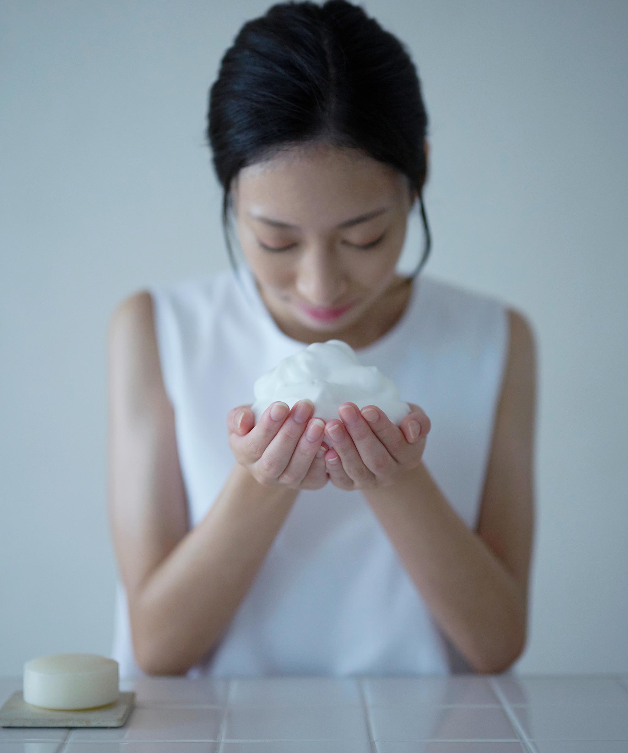 ・少量の水を"泡立てネットに含ませ泡を作り、優しく顔にのせます。