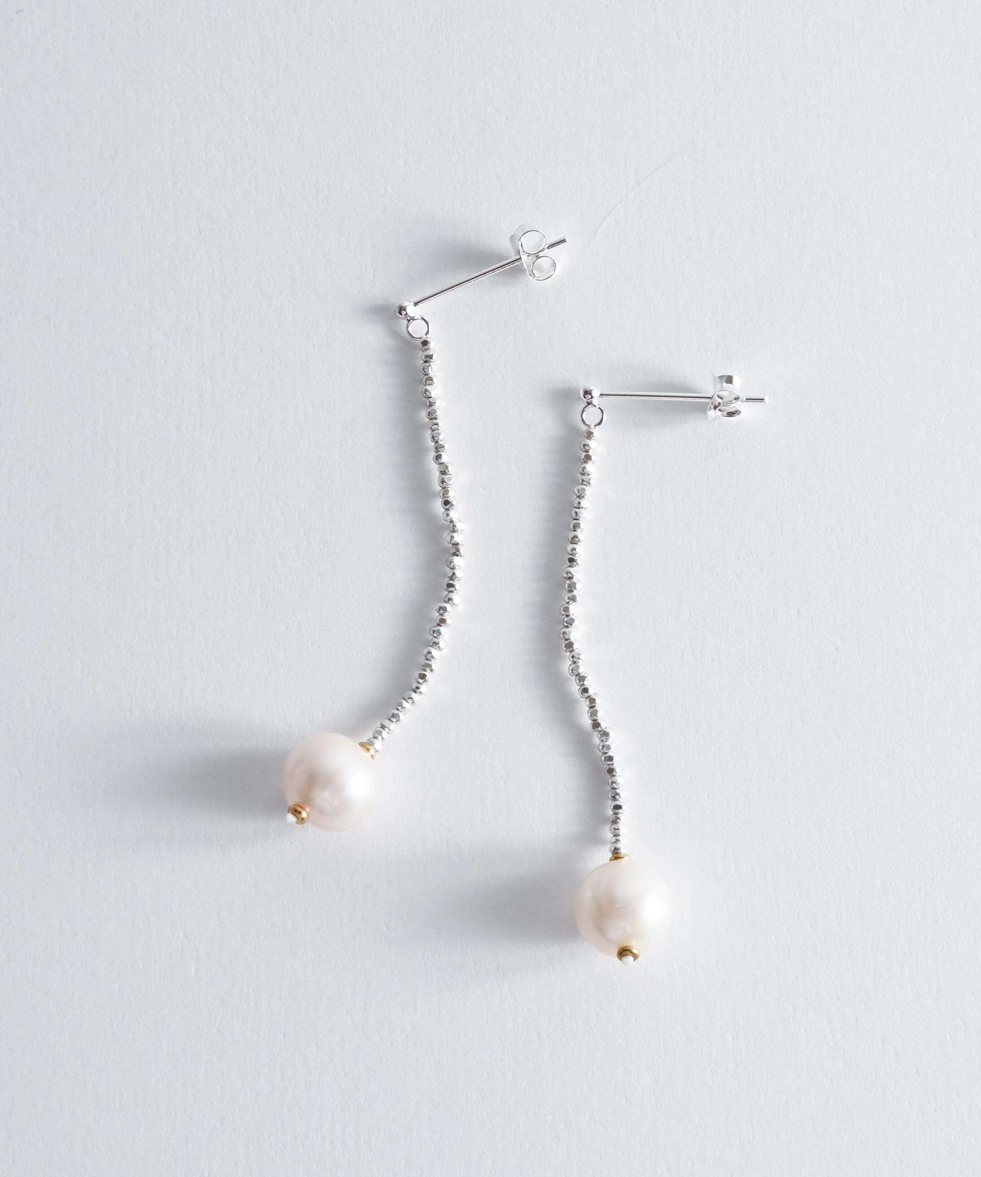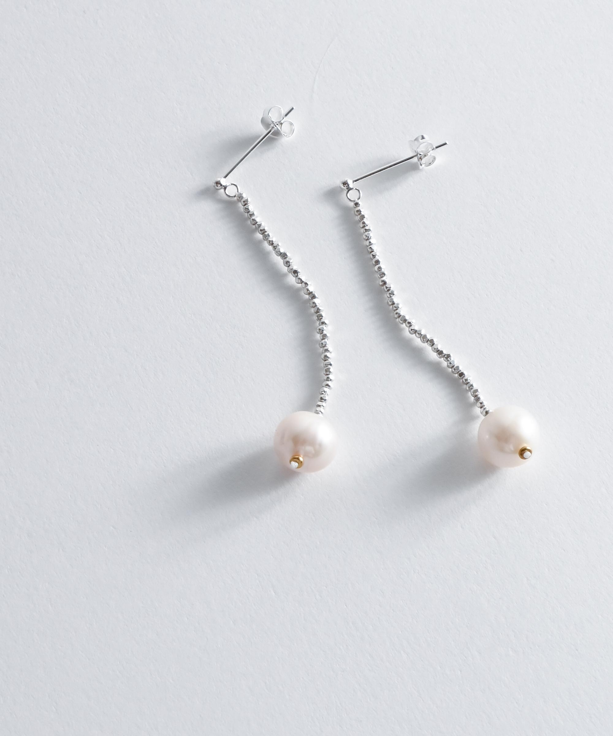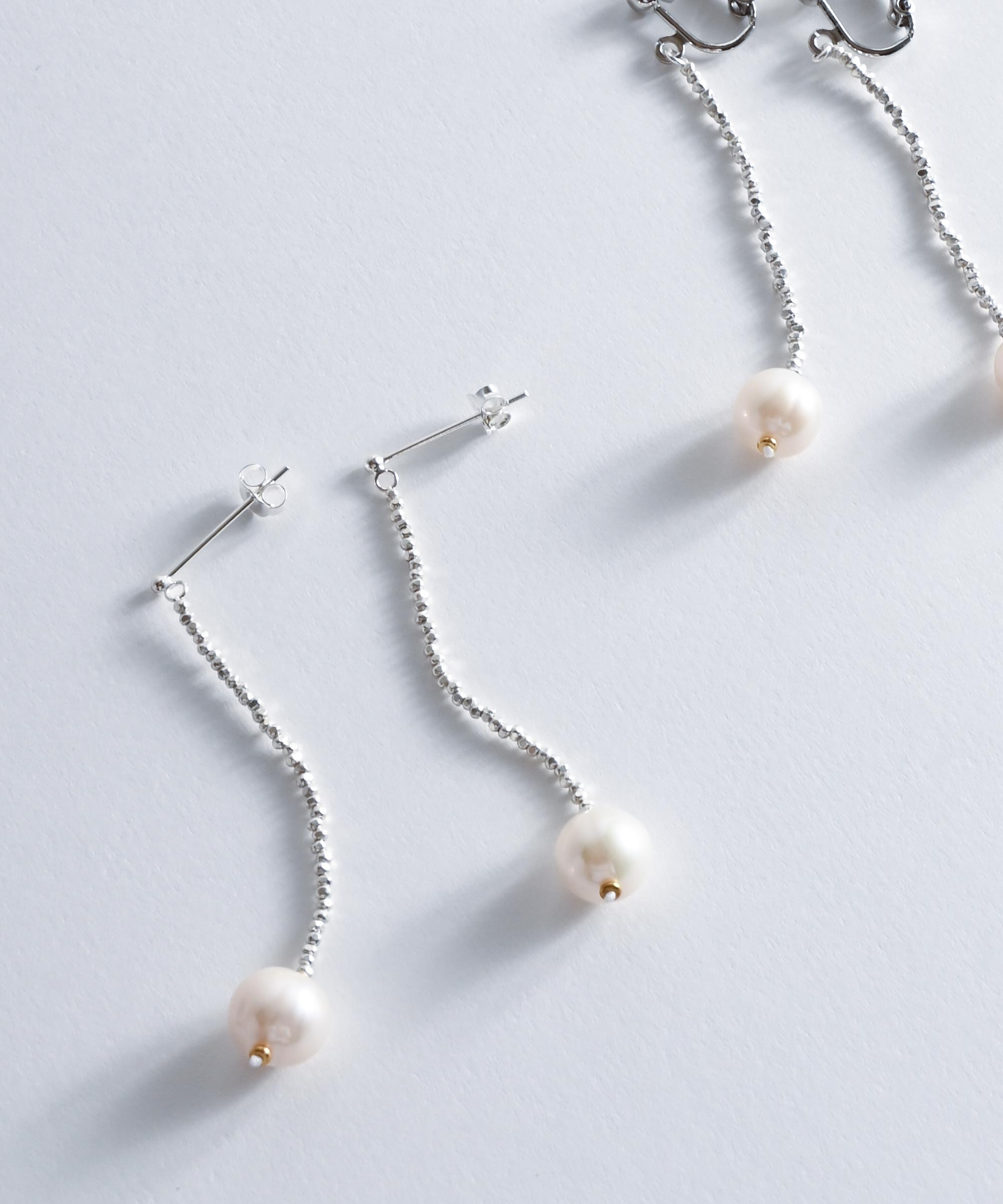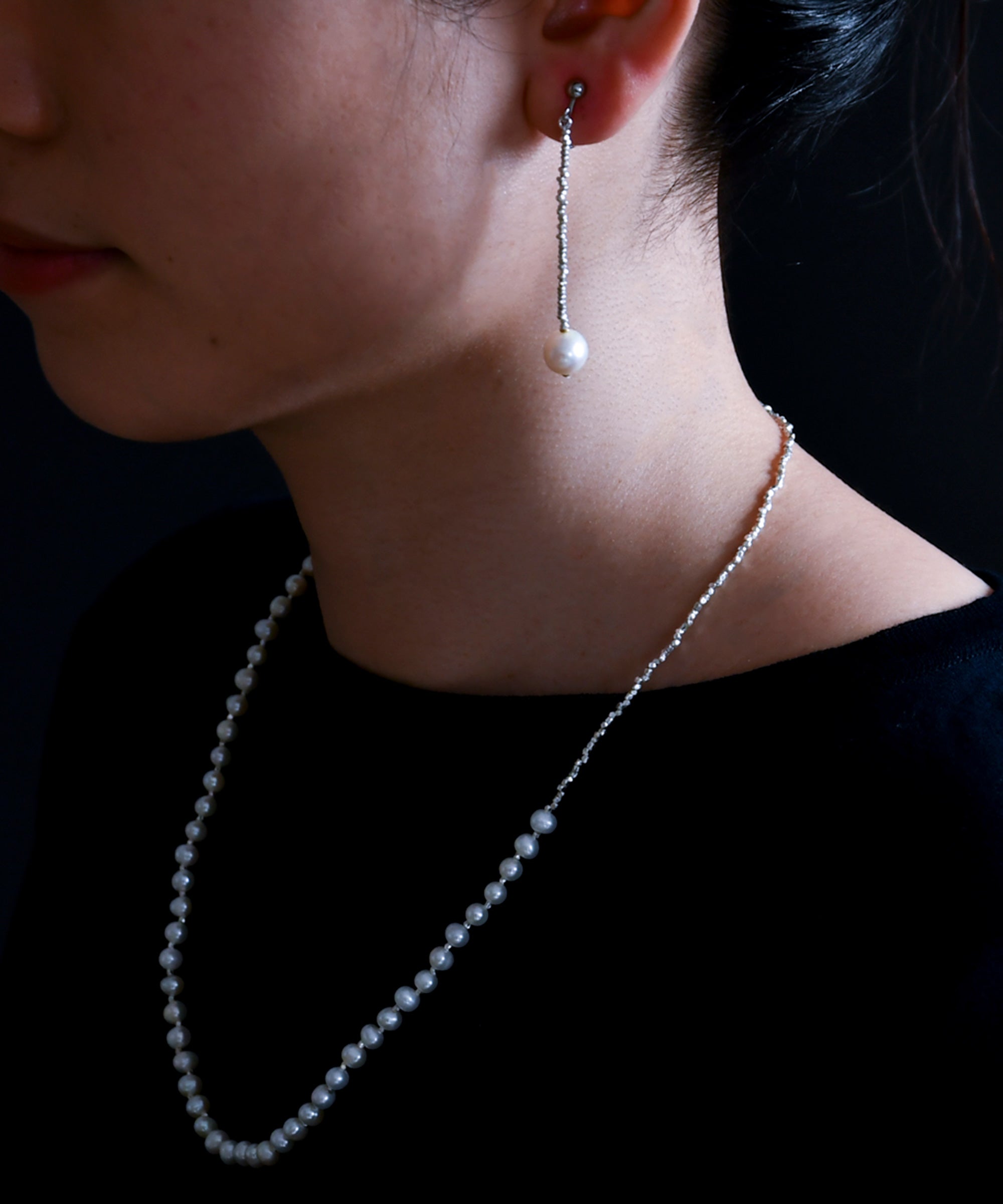 上品にキラッと光るように繊細なカットが施された極小のシルバービーズにゆらゆらと揺れるパールが上品な存在感。