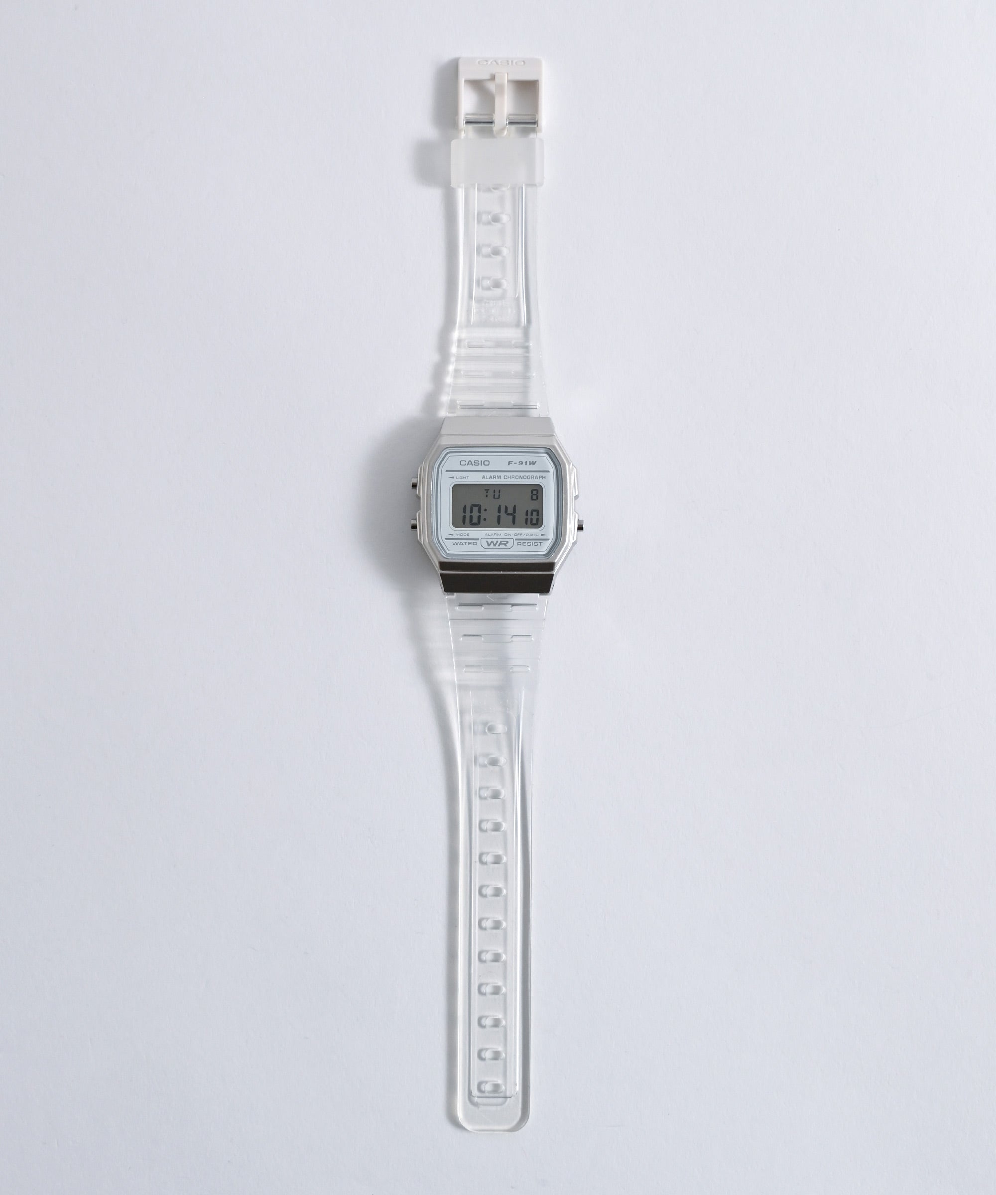 ワントーンにまとめたケースがシンプルながらさりげないアクセントになるクリアカラーベルトの腕時計。