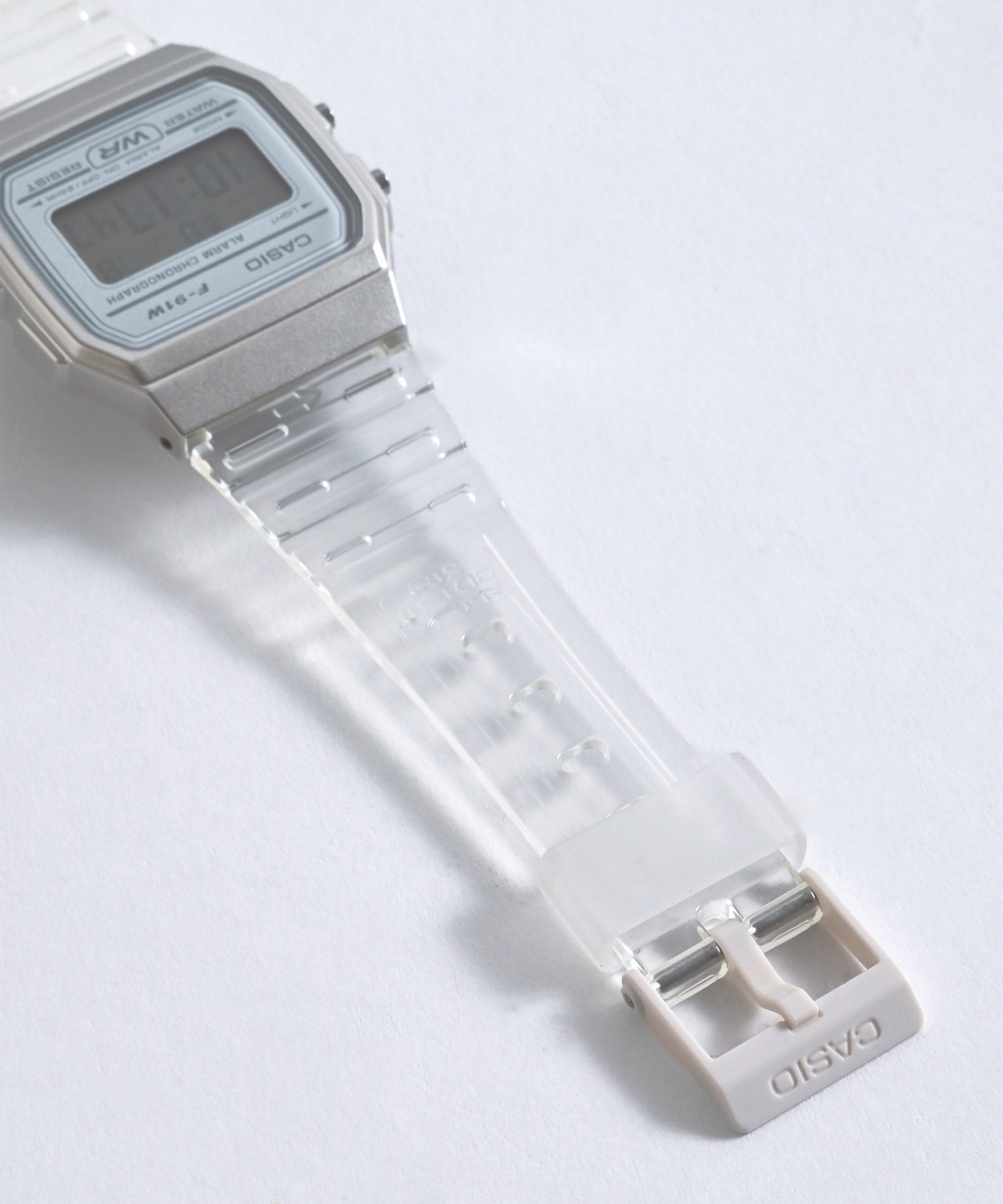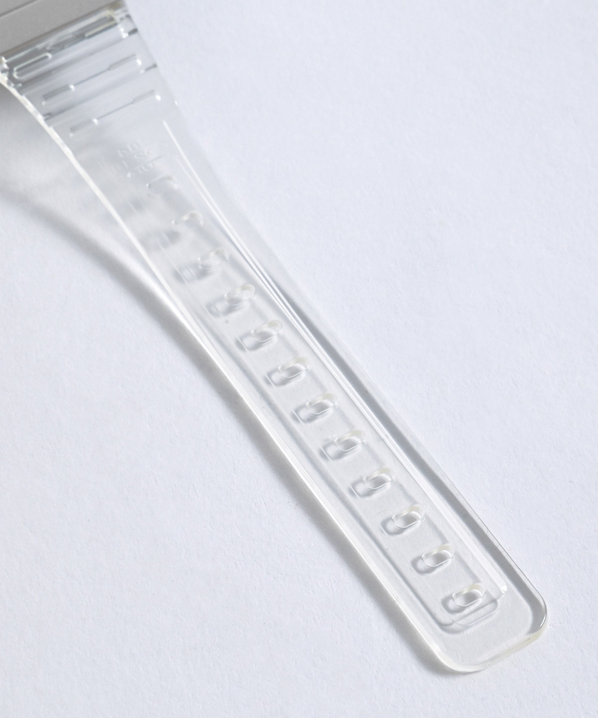 つや消しの金属風塗装が施されたケースは、アルミニウムのような質感で、ベルトは艶のあるトランスルーセント(スケルトン)のクリアーカラーとなっています。