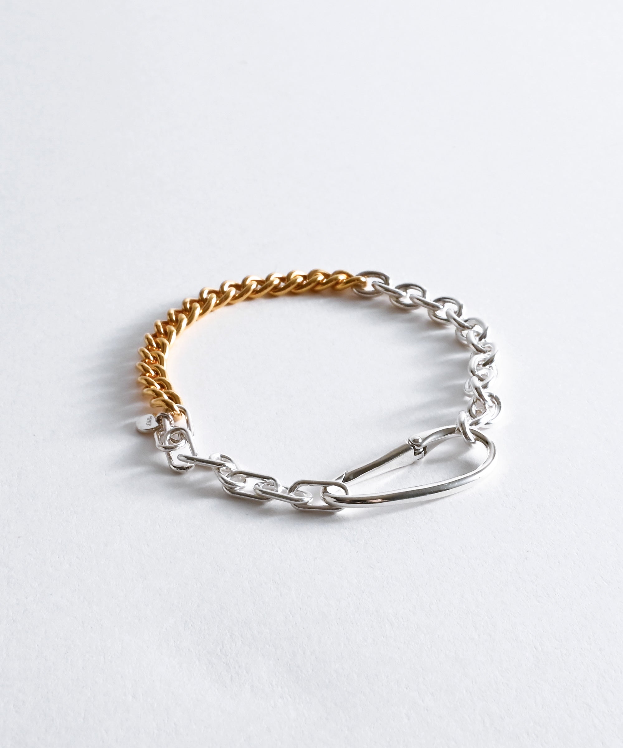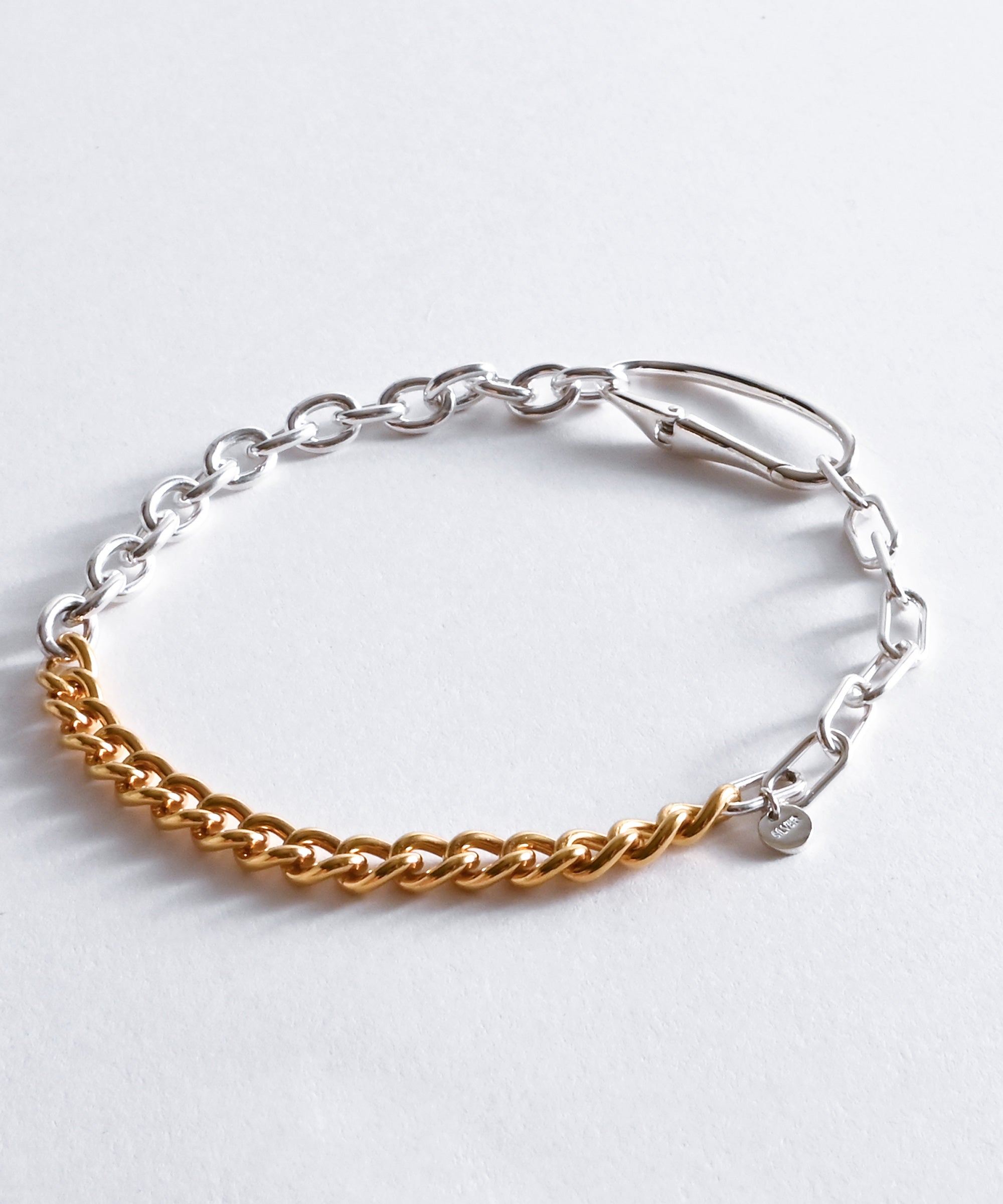 シルバーのあずきチェーンとゴールドの喜平チェーンをミックスしたボリューム感のあるブレスレット。