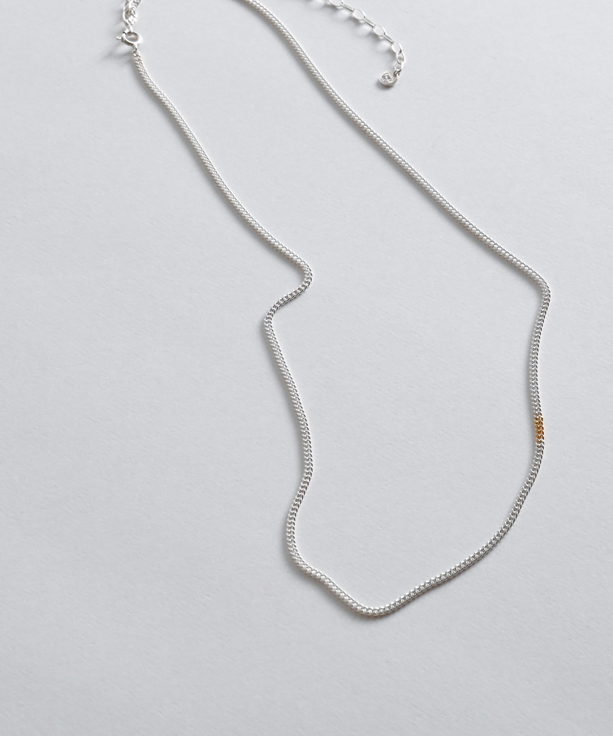 細めのシンプルなシルバーチェーンの中に少しだけゴールドが隠れた55㎝の長めのネックレス。