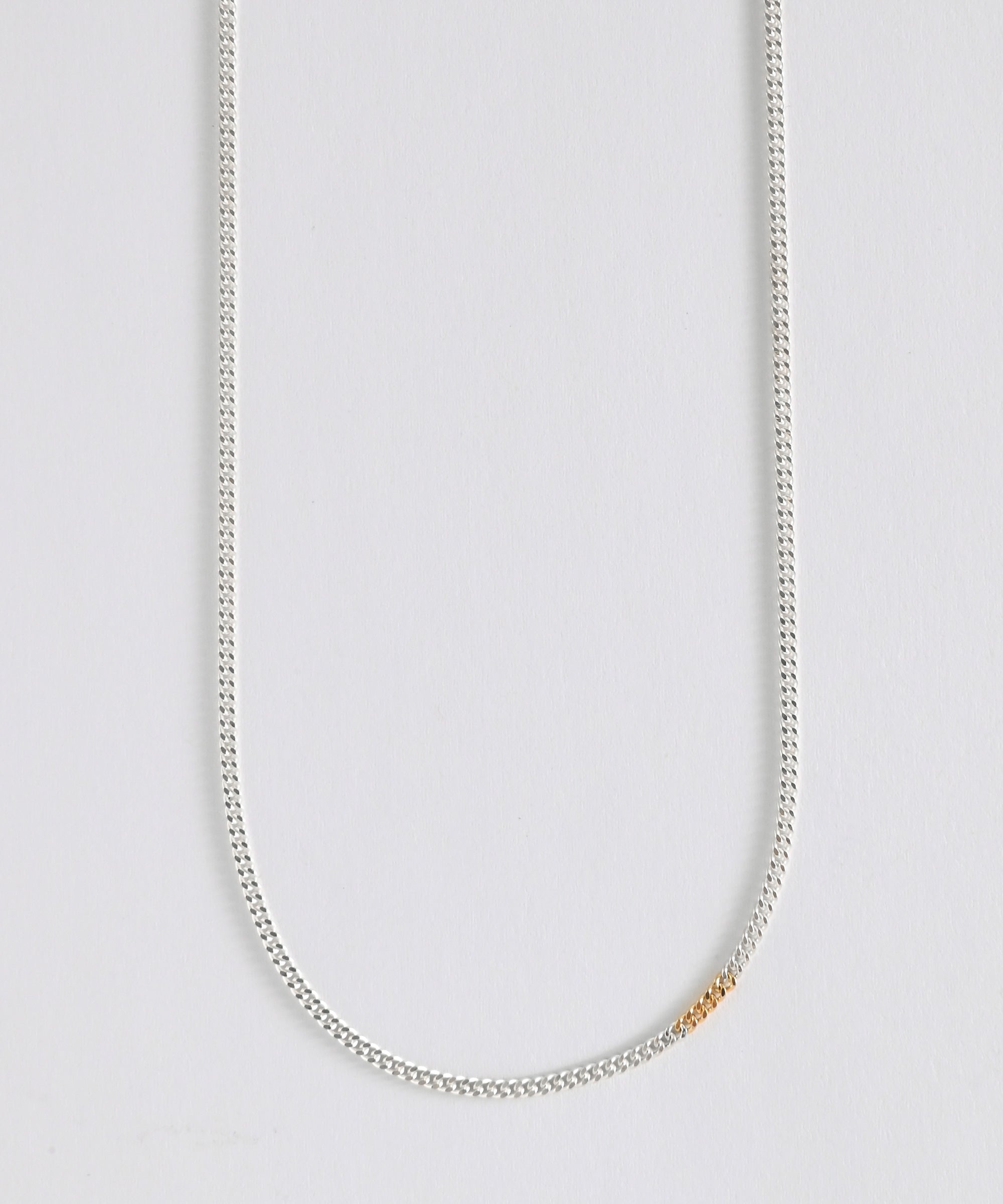 細目の喜平チェーンの中にはさりげなく配置されたイエローゴールドがポイントに。