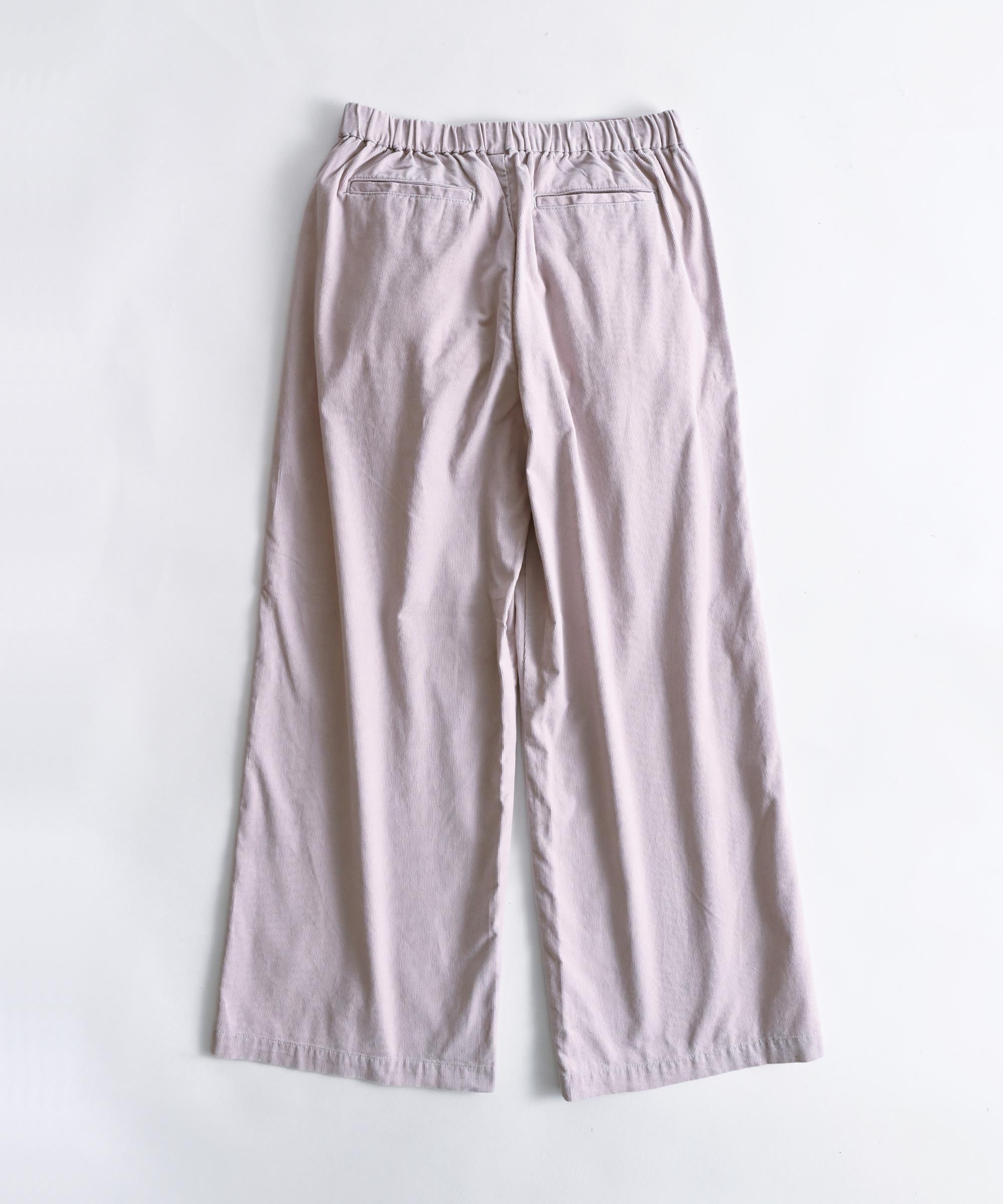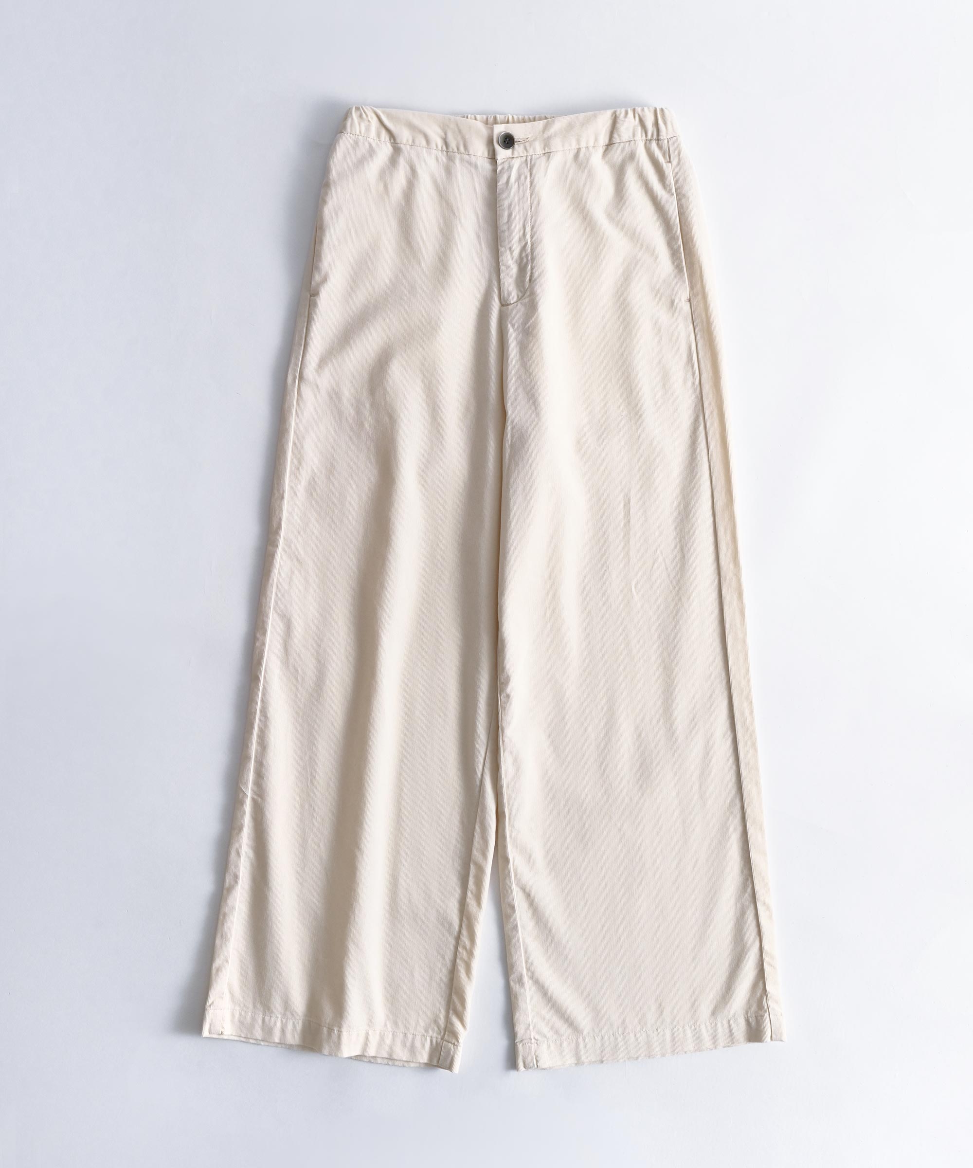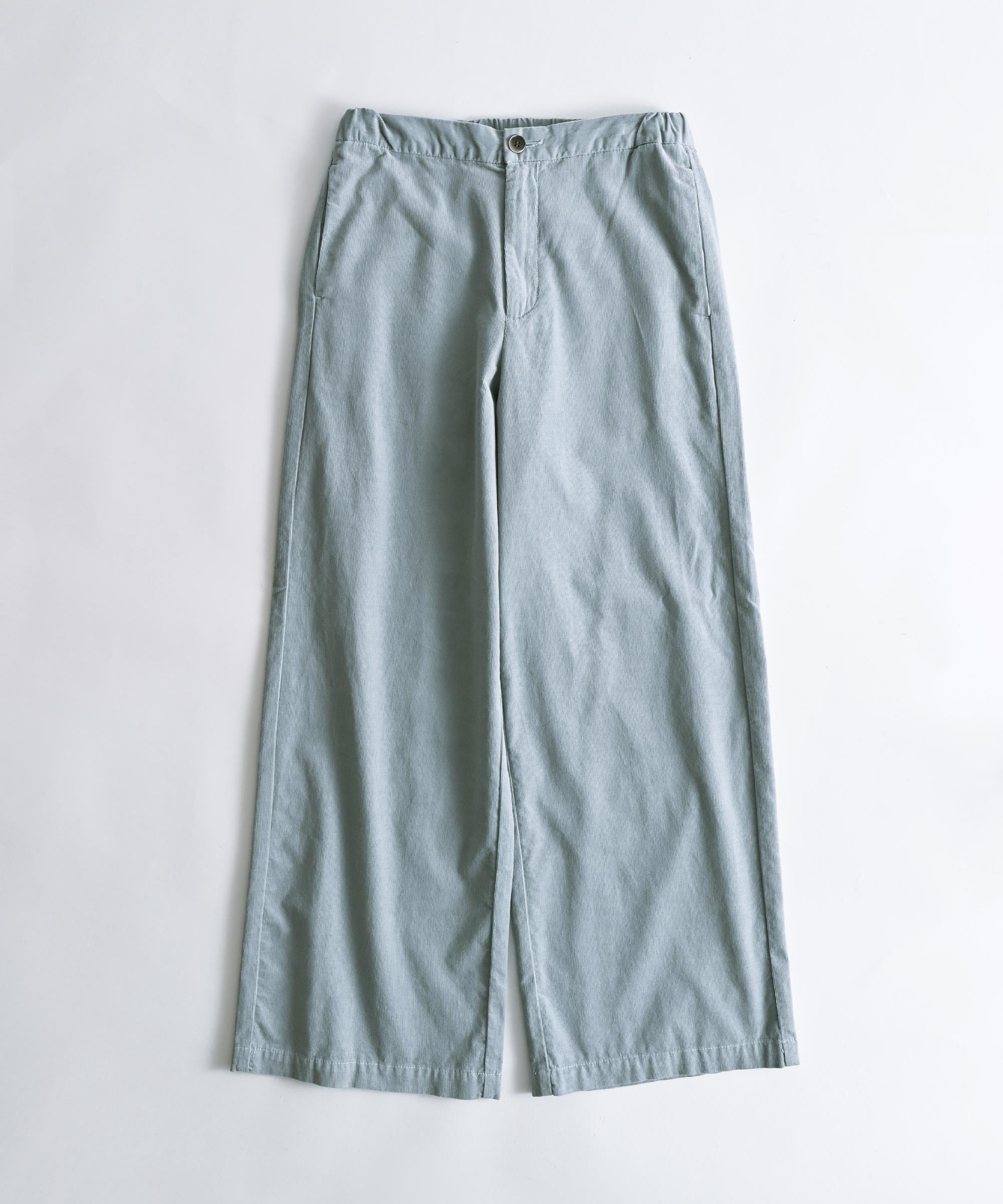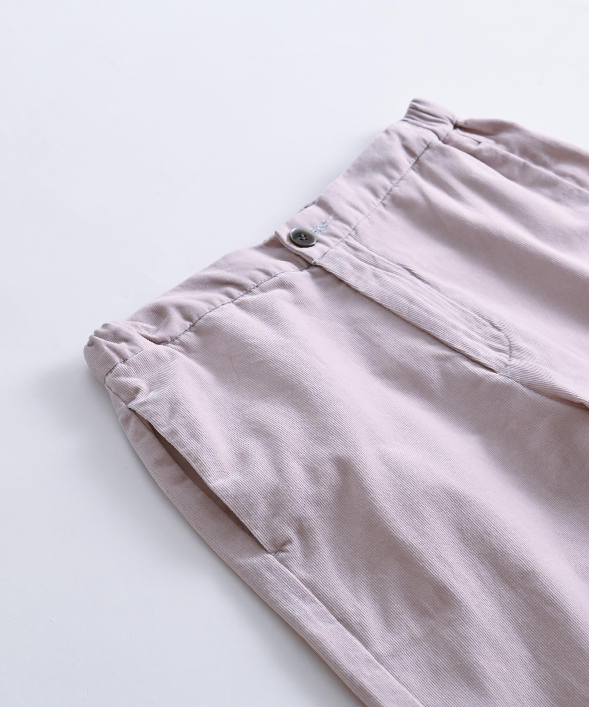 細かい畔コーデュロイならではの落ち感と柔らかさを活かし、裾巾を広めに、丈も眺めにデザイン。