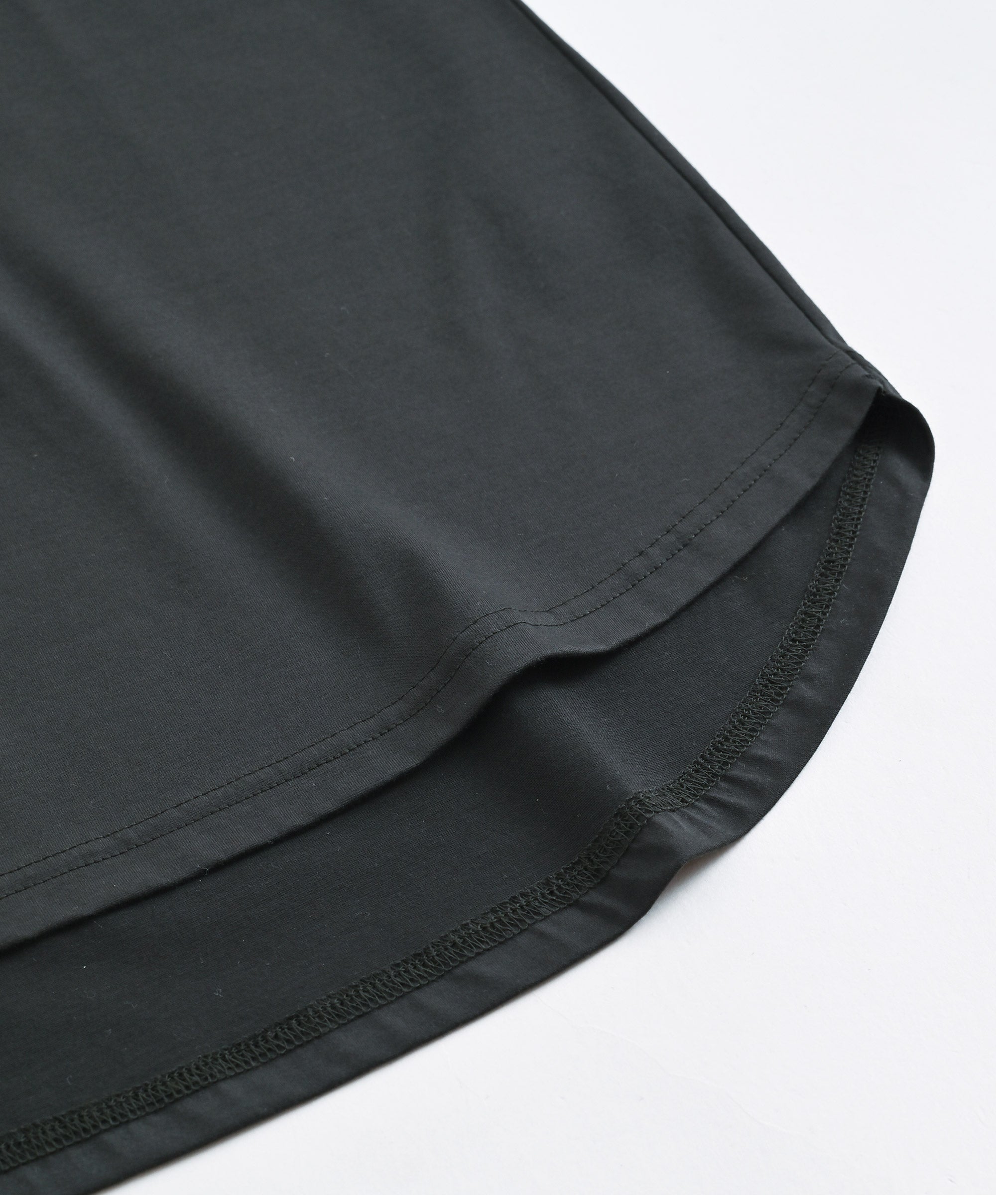 裾はラウンド型にし、お尻まで隠れる長さに。ボトムスを選ばず1枚で様になるアイテムです。
