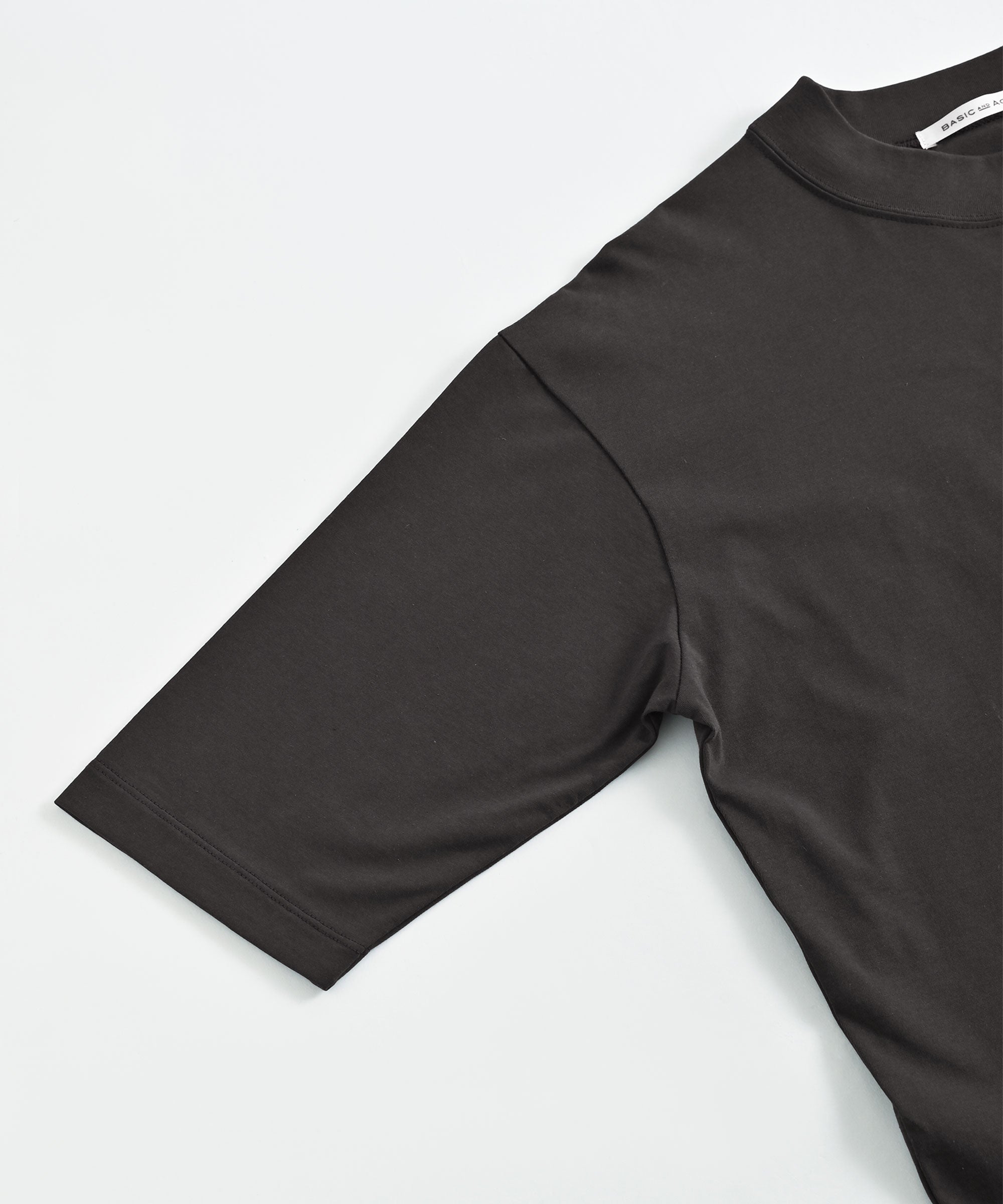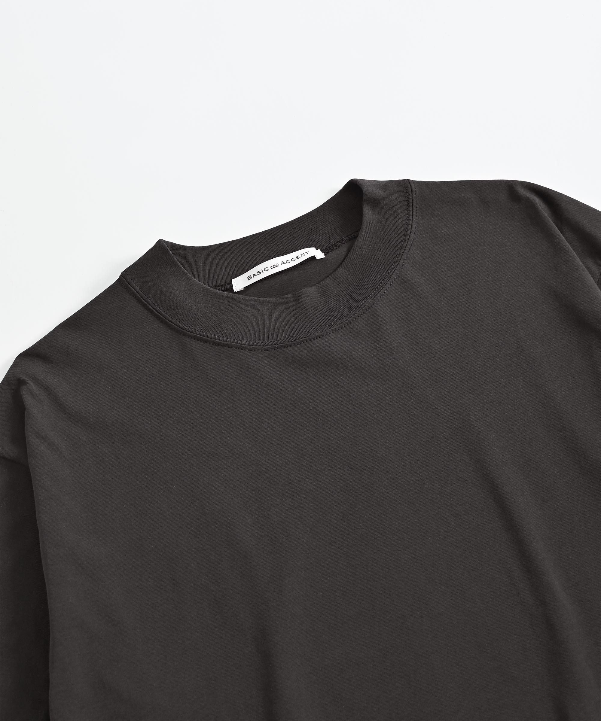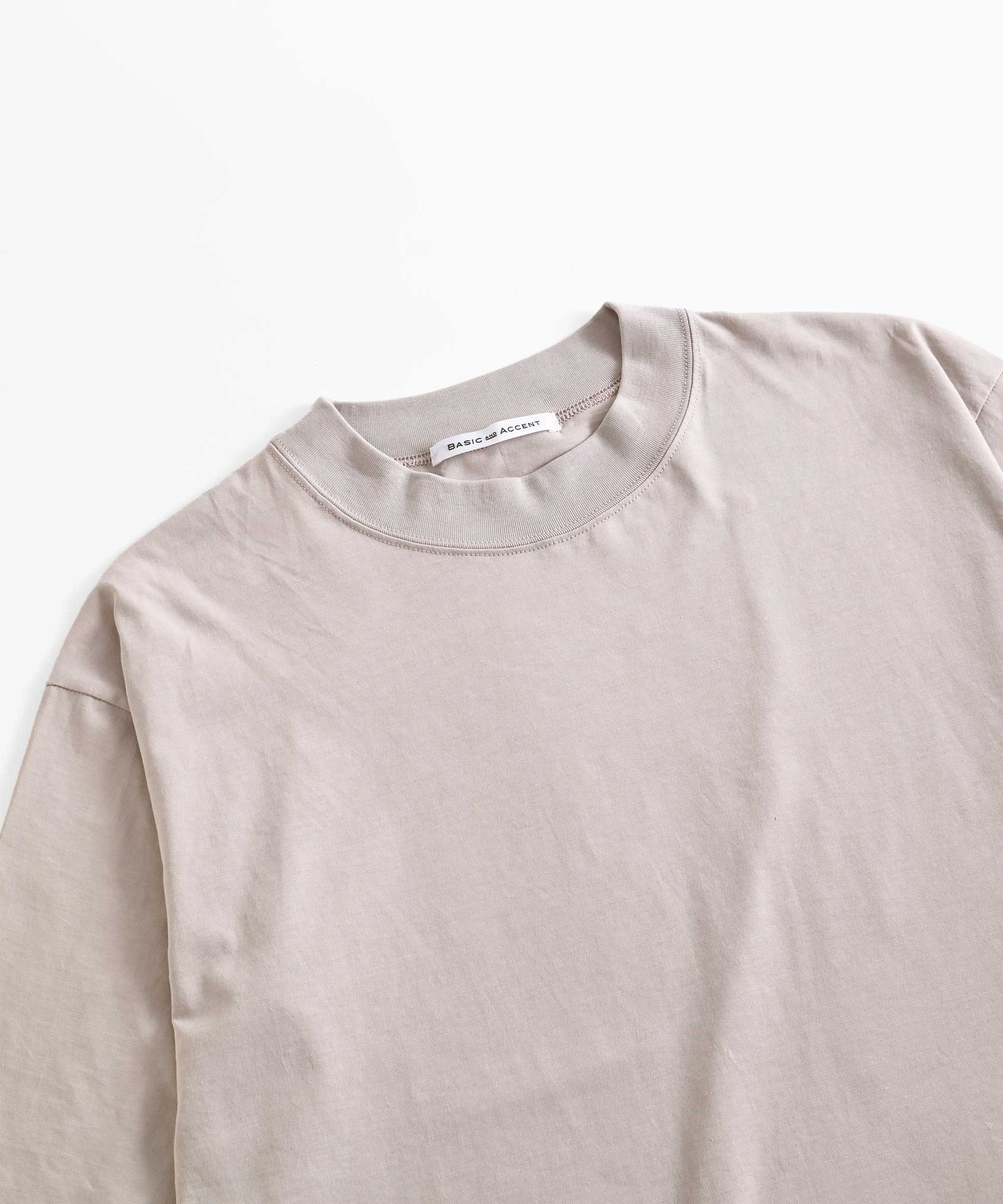 Tシャツのボディの形状にもこだわってデザインしたBASIC AND ACCENTオリジナルのTシャツ。首の開きは小さく、太めのリブがデザインのポイント。そで丈は長めながら細目な幅ですっきりとしたラインに仕立てています。首周りが広すぎず、袖も肘が隠れる程度なので暑さの続く初秋まで着ていただけるデザインです。毛羽立ちが少なく光沢感のある生地もポイント。