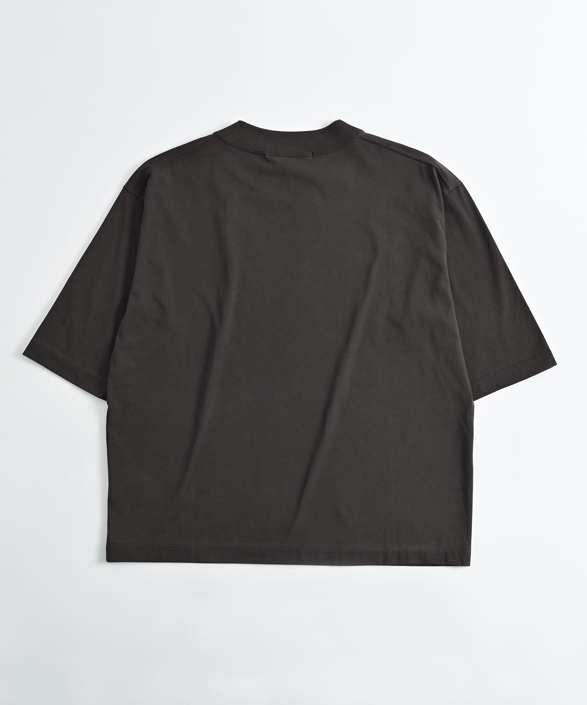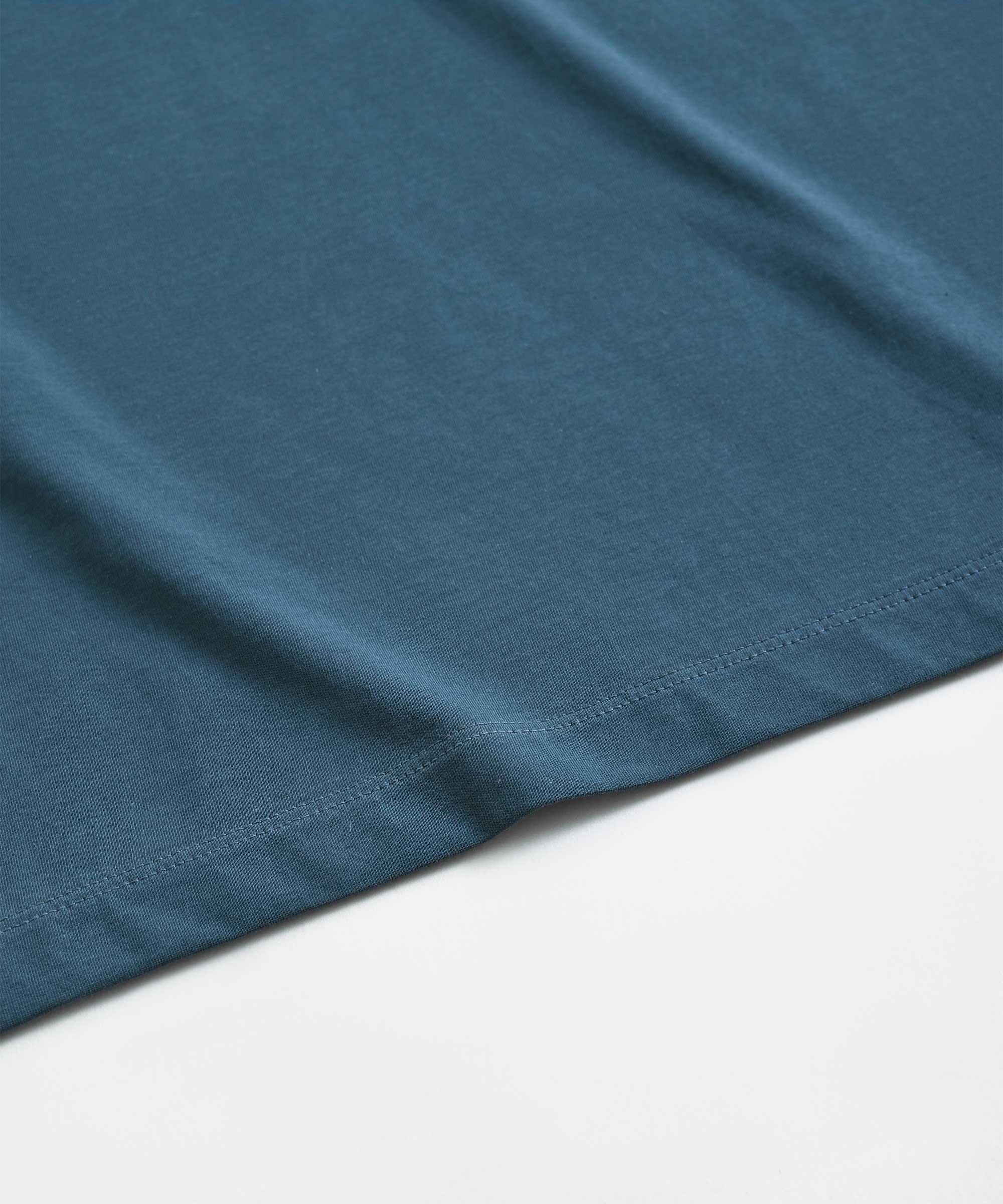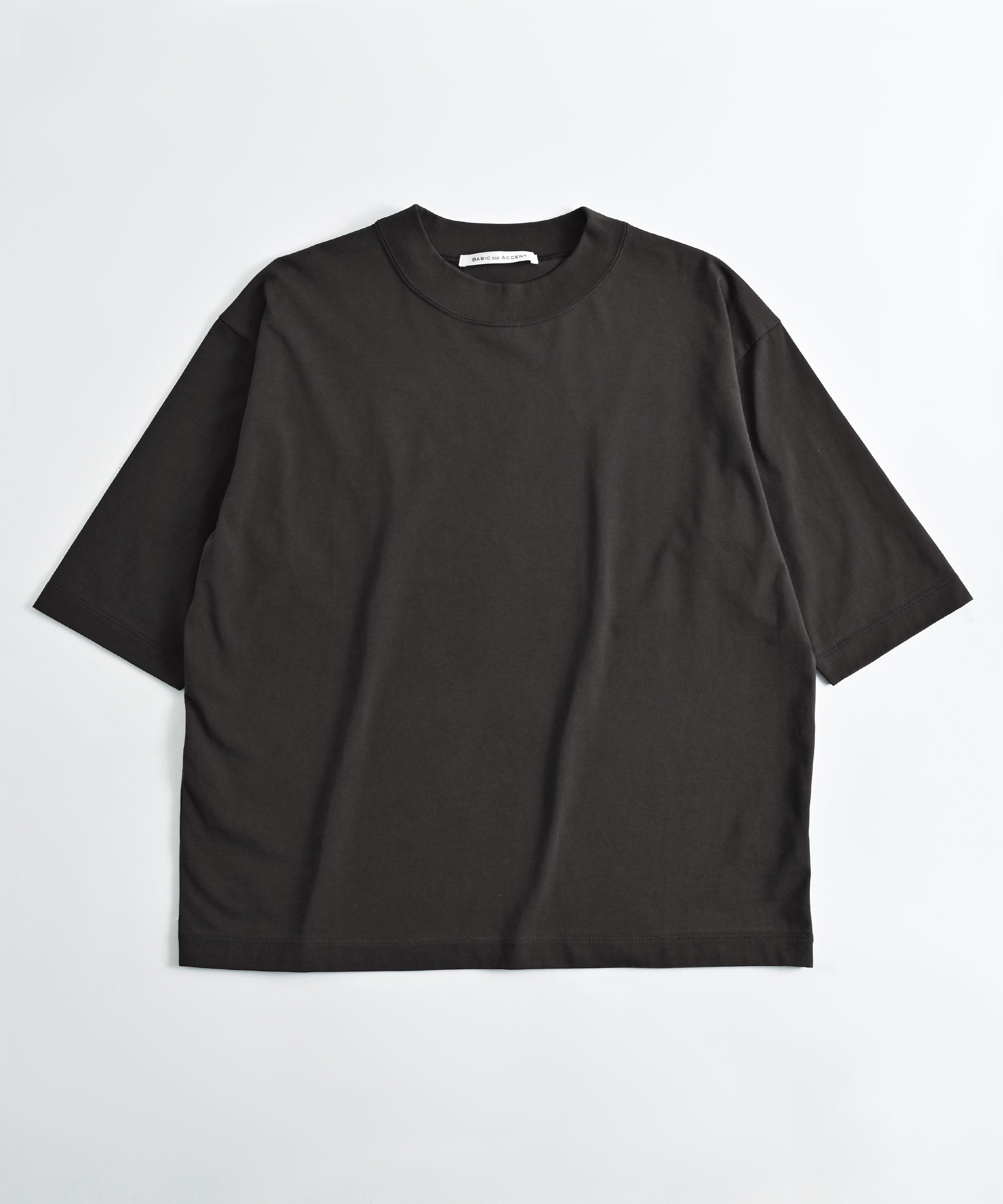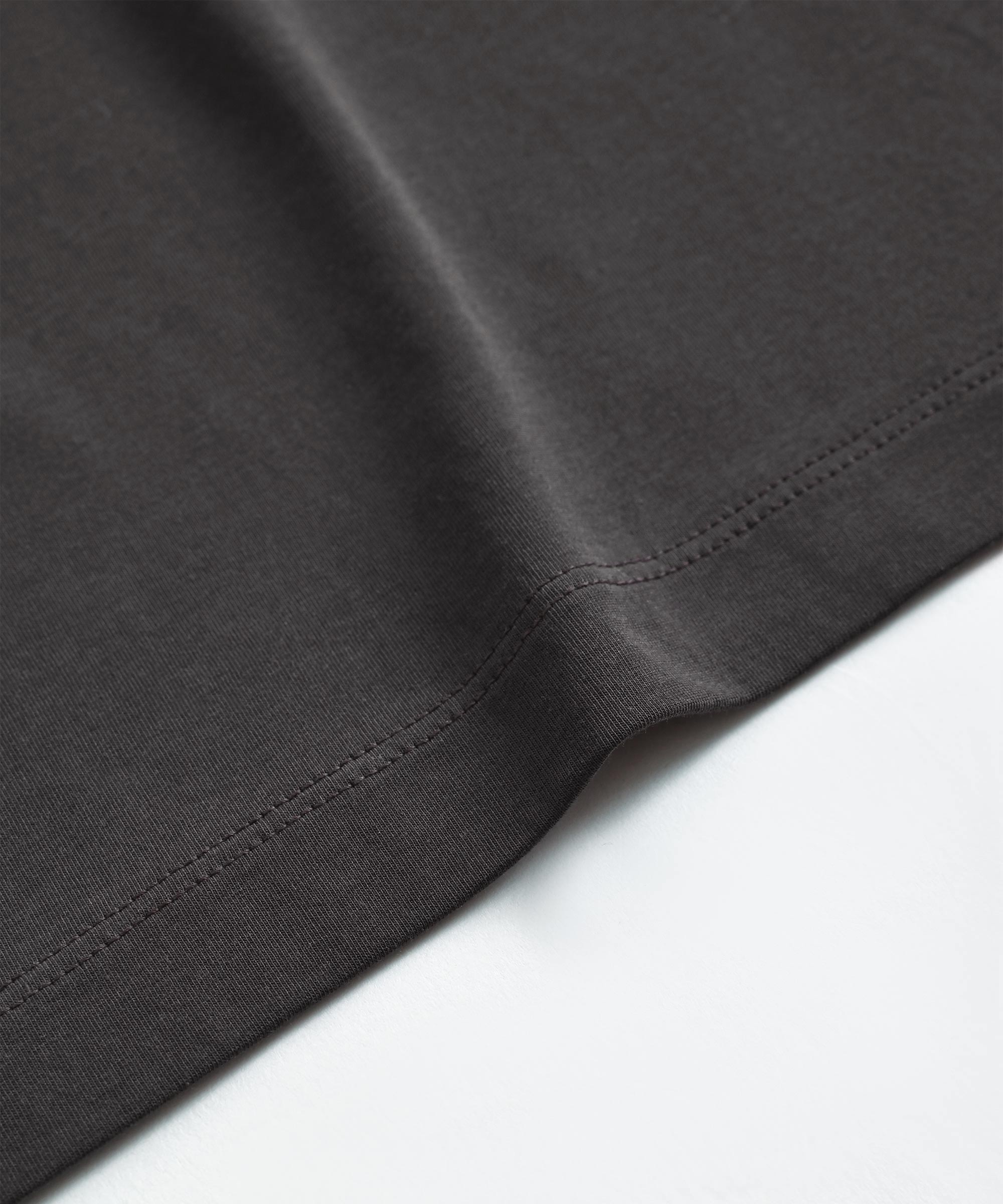 Tシャツのボディの形状にもこだわってデザインしたBASIC AND ACCENTオリジナルのTシャツ。首の開きは小さく、太めのリブがデザインのポイント。そで丈は長めながら細目な幅ですっきりとしたラインに仕立てています。首周りが広すぎず、袖も肘が隠れる程度なので暑さの続く初秋まで着ていただけるデザインです。毛羽立ちが少なく光沢感のある生地もポイント。