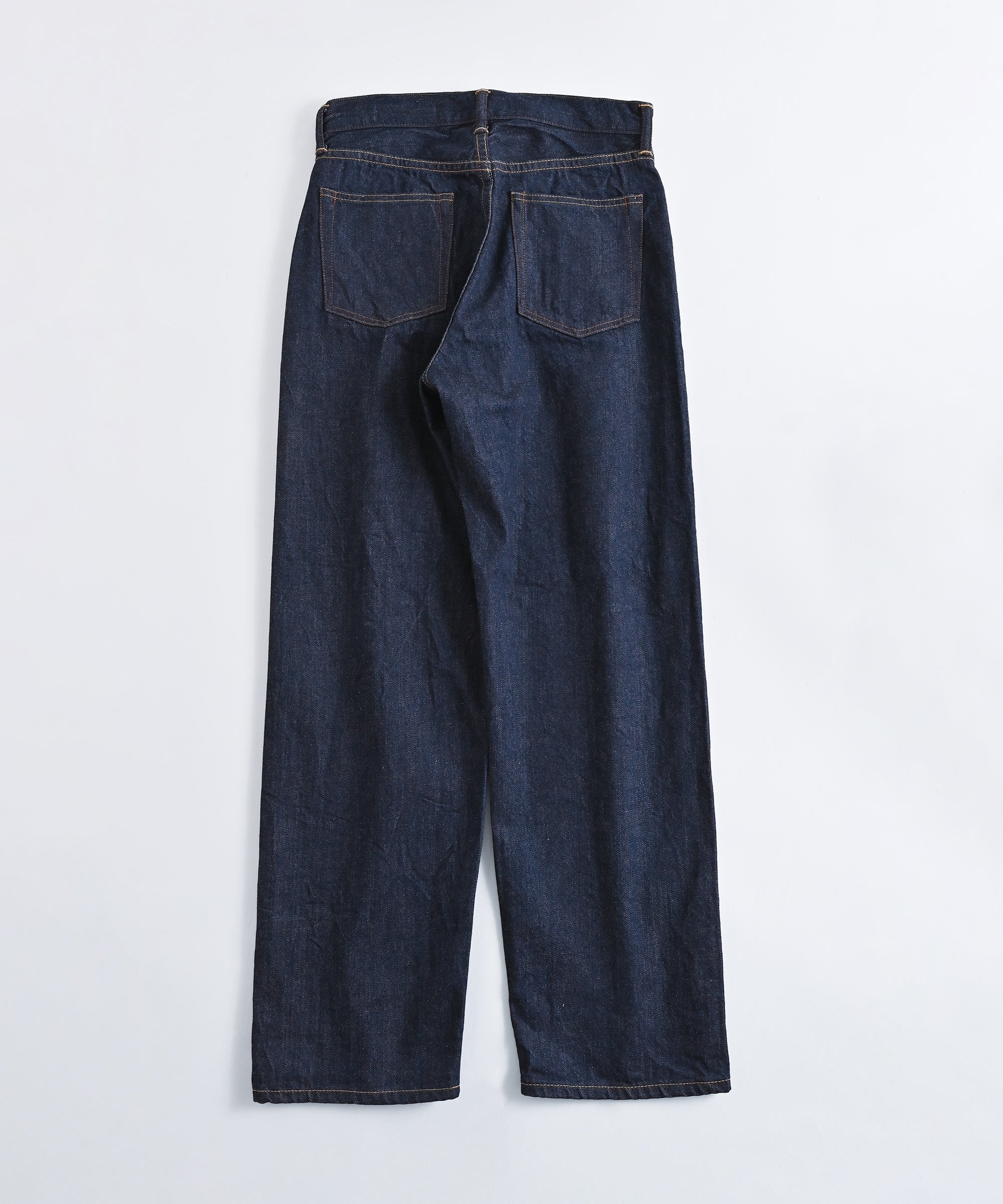 ステッチの番手、カラー、運針など細部にこだわることで、ジーンズでありながらもどこか品のある雰囲気を目指して作製した1本です。ウエストがすっきりと見えるのに、ヒップから太もも回りをカバーしてくれるこだわりのシルエット。程よい太さでストレートなデザインがスタイルアップして見えるのも嬉しいポイント。
