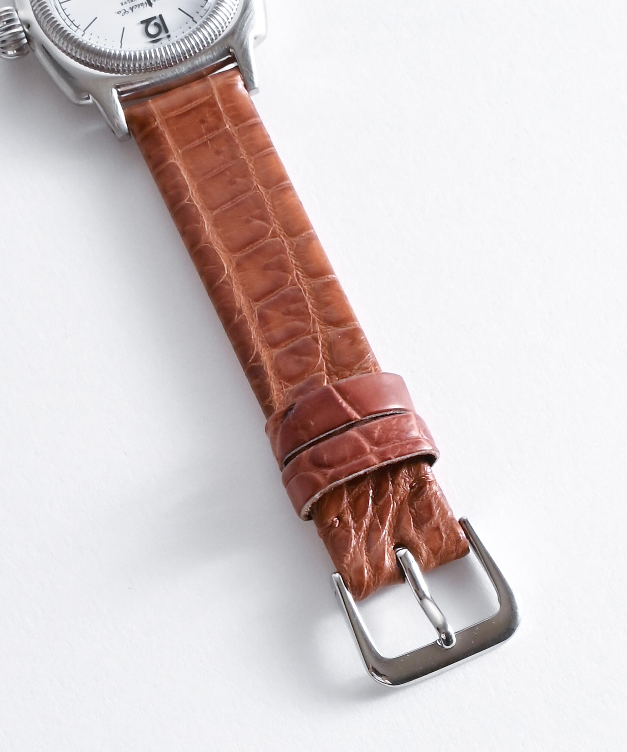 クロコダイルベルトをあしらった大人なモデル、”COUSSIN 12”。 文字盤はモデル名の通り、“12”のみ表示したミニマムなデザイン。 この“12”はよく見るとプリントではなく、立体的な作り(アップライトインデックス)になっているのがポイント。 ベルトは国産のクロコダイルを使用したこだわりの作りで、 シンプルな文字盤デザインと相まって"大人の装い"を演出します。 ブランドの特徴でもあるエージング加工を施した本体ケースは 長い時間を経てきたような風合いを表現しています。 オンオフ問わず、ユニセックスで使っていただけるアイテムです。 ギフトなどにもおすすめです。