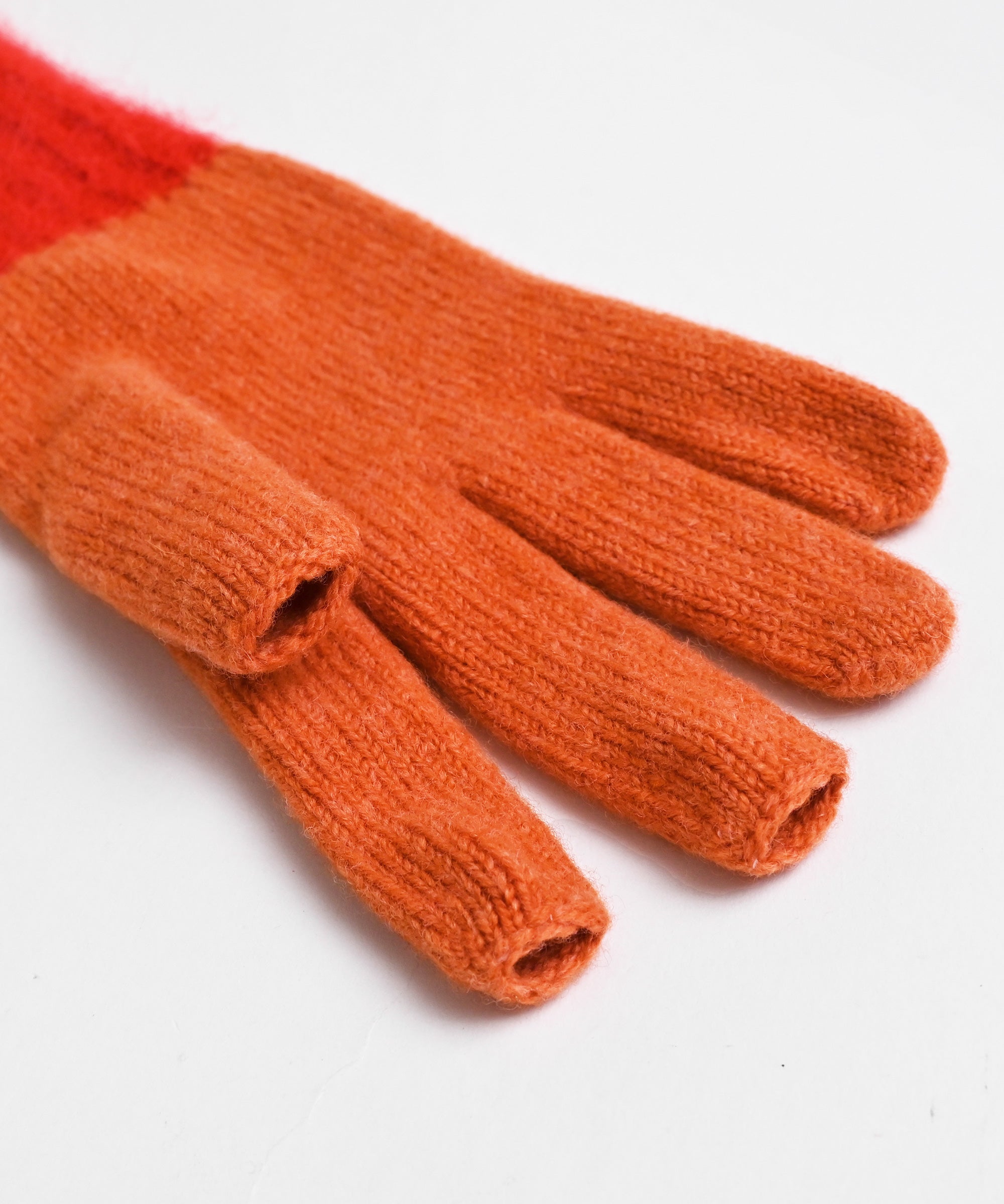 手のひら部分には、あたたかく丈夫なウールを、手首のふわふわ部分には、やわらかな肌ざわりの糸を使用しております。