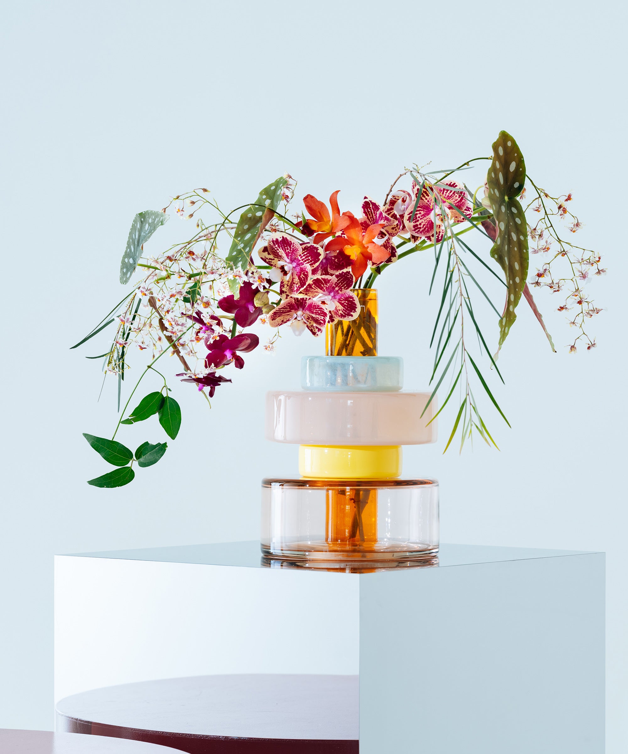 自由にパーツを組み合わせて作れるネックレスやブレスレットから着想を得て生まれた、モジュール式のフラワーベース。リングの配置を変えることで、自分好みにアレンジすることができます。中心はシンプルな円筒状のベースです。