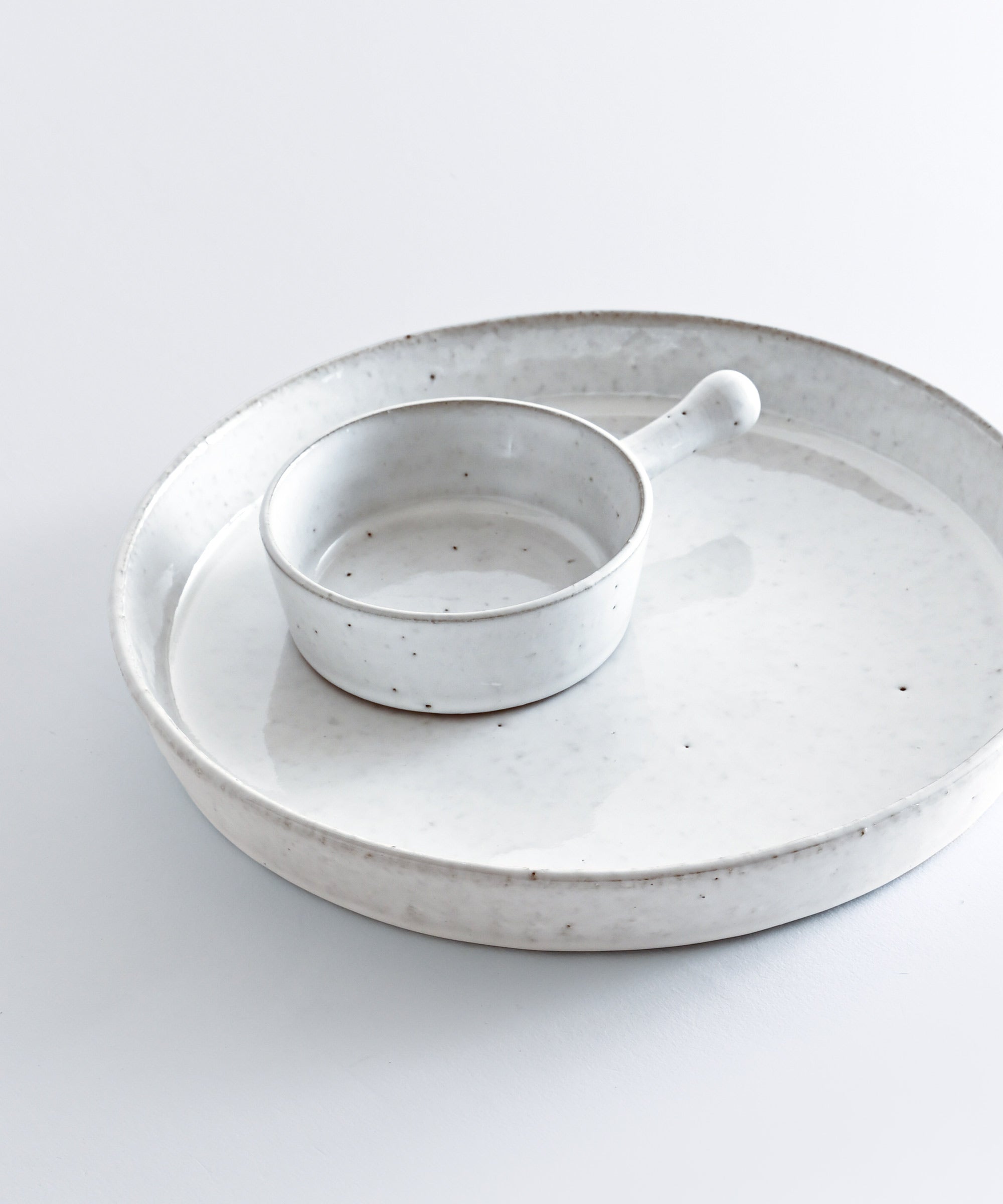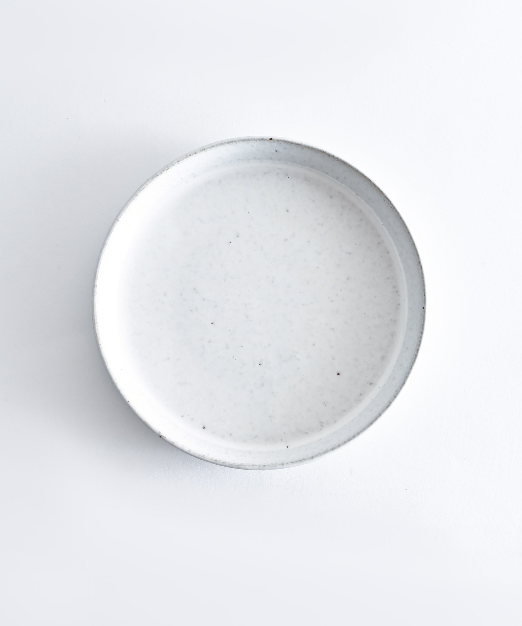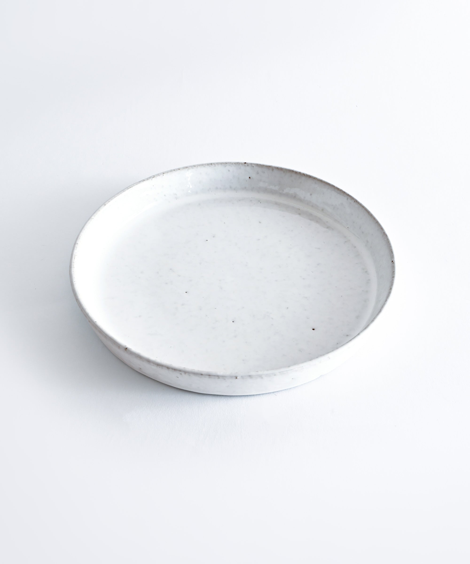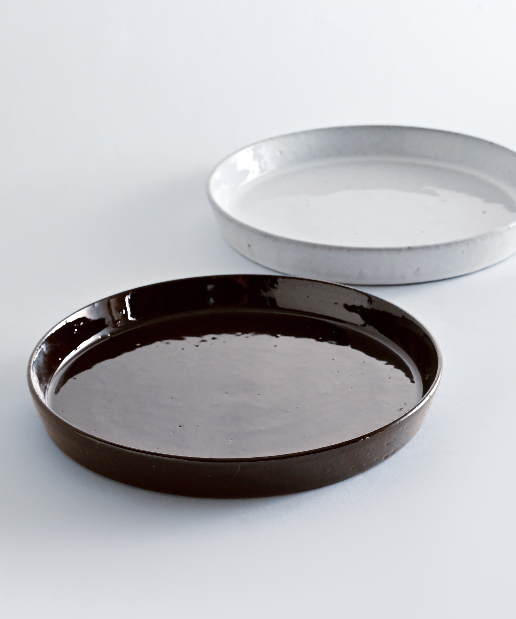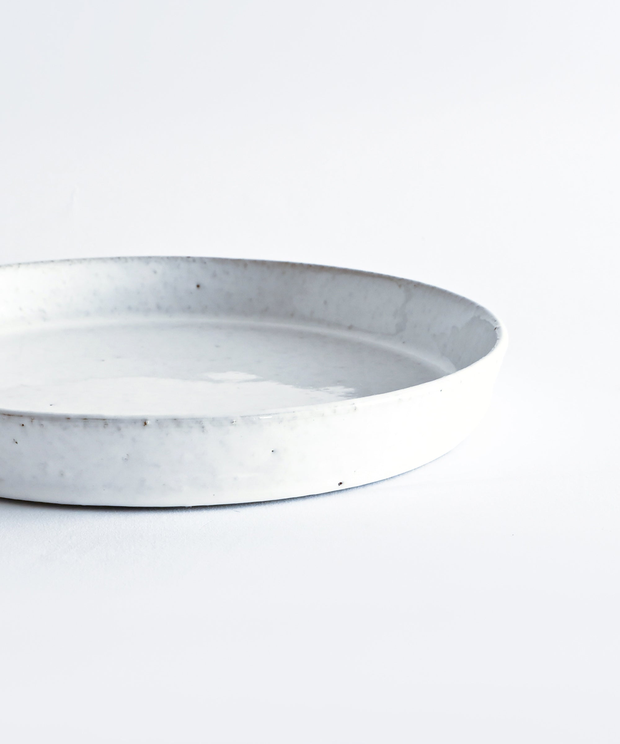 形と使い勝手にこだわって、毎日使いたい器を図面を引いてデザインしたBASIC AND ACCENTの定番の器。ひとつひとつ轆轤(ろくろ)で形にしています。あえてシャモット(石)の入った土を使用しているので、釉薬をかけた時の表情がひとつひとつ異なります。パスタ、オムライス、ハンバーグなどメインを盛る器としてはもちろん、縁が立ち上がったデザインなので、カレーや煮魚など汁気のある料理にもおすすめです。