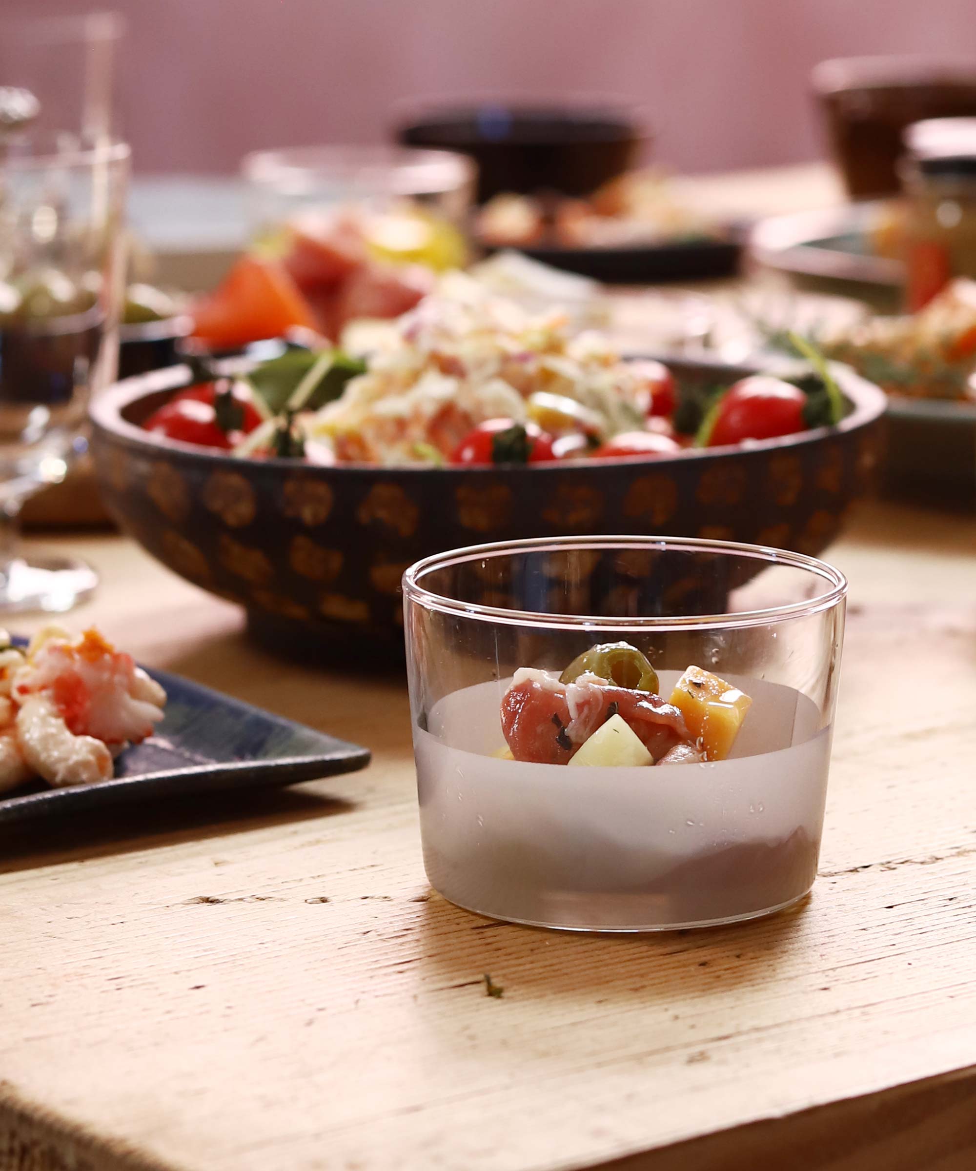 シンプルなデザインだけどもアクセントにもなるBASIC AND ACCENTオリジナルのグラス。切り立ちのグラスは小鉢としても、飲み物を入れても使い勝手の良い形です。