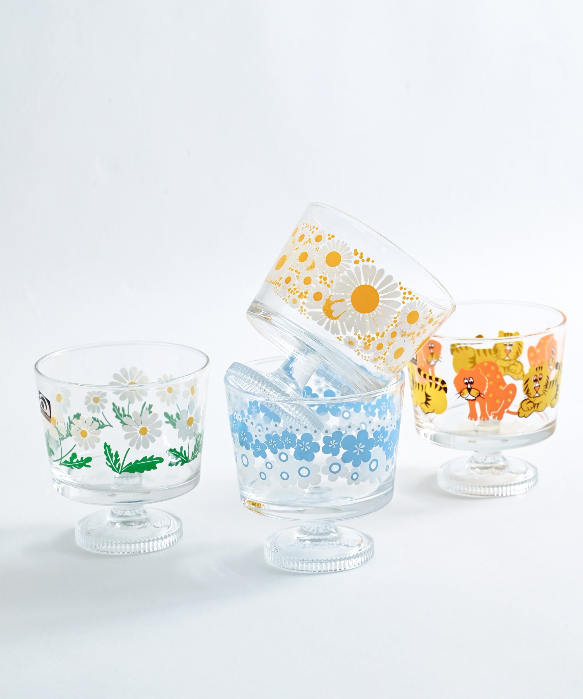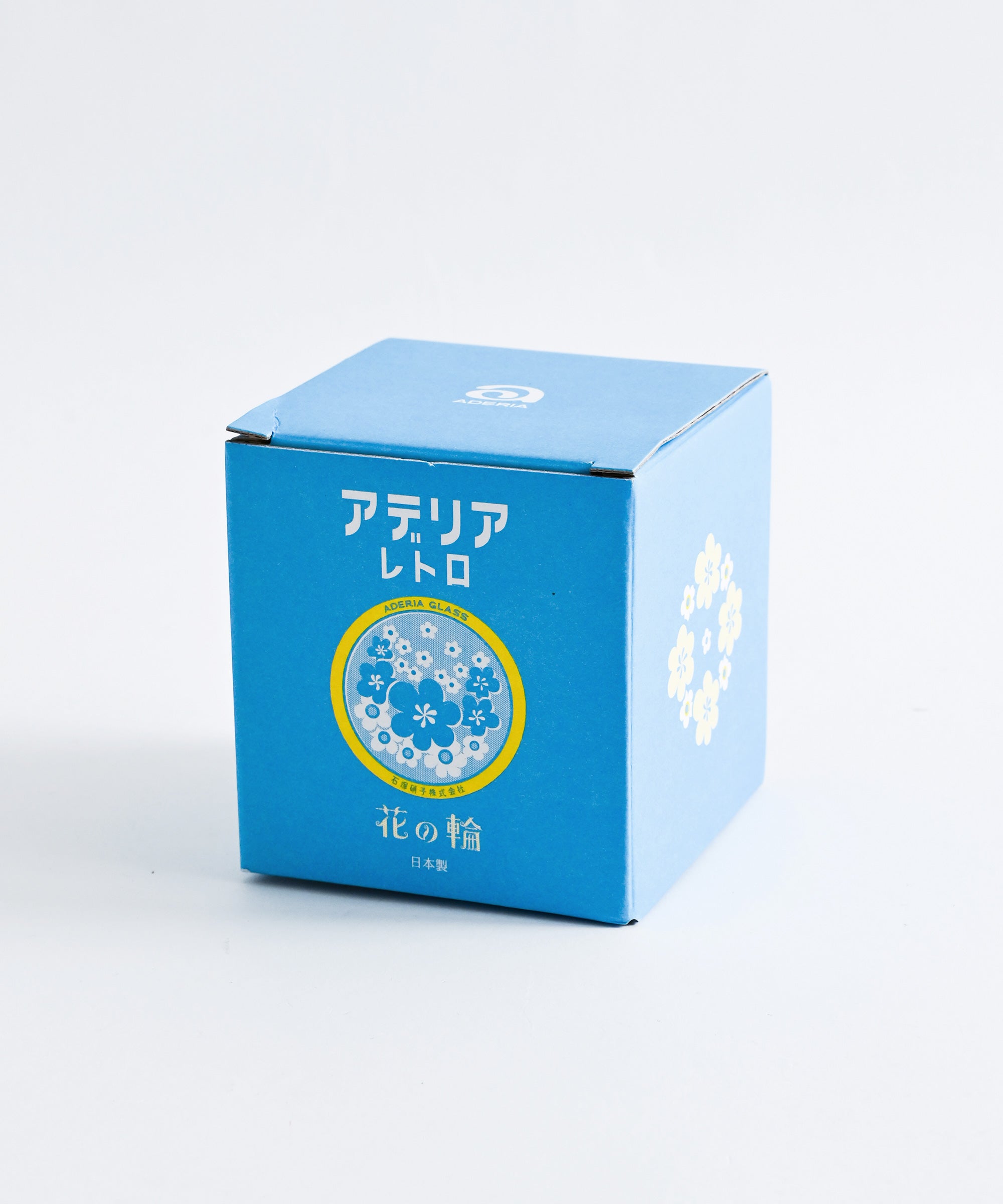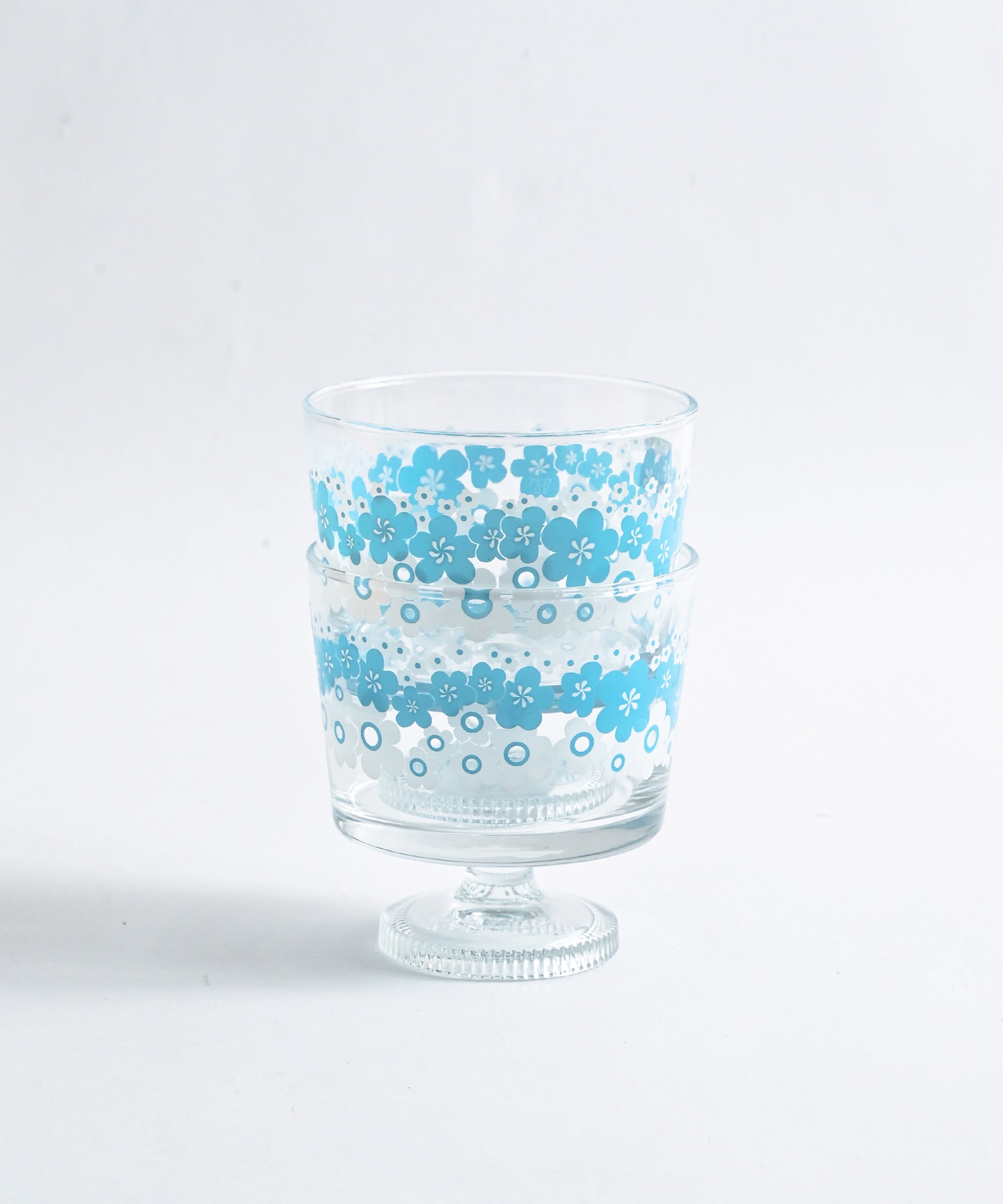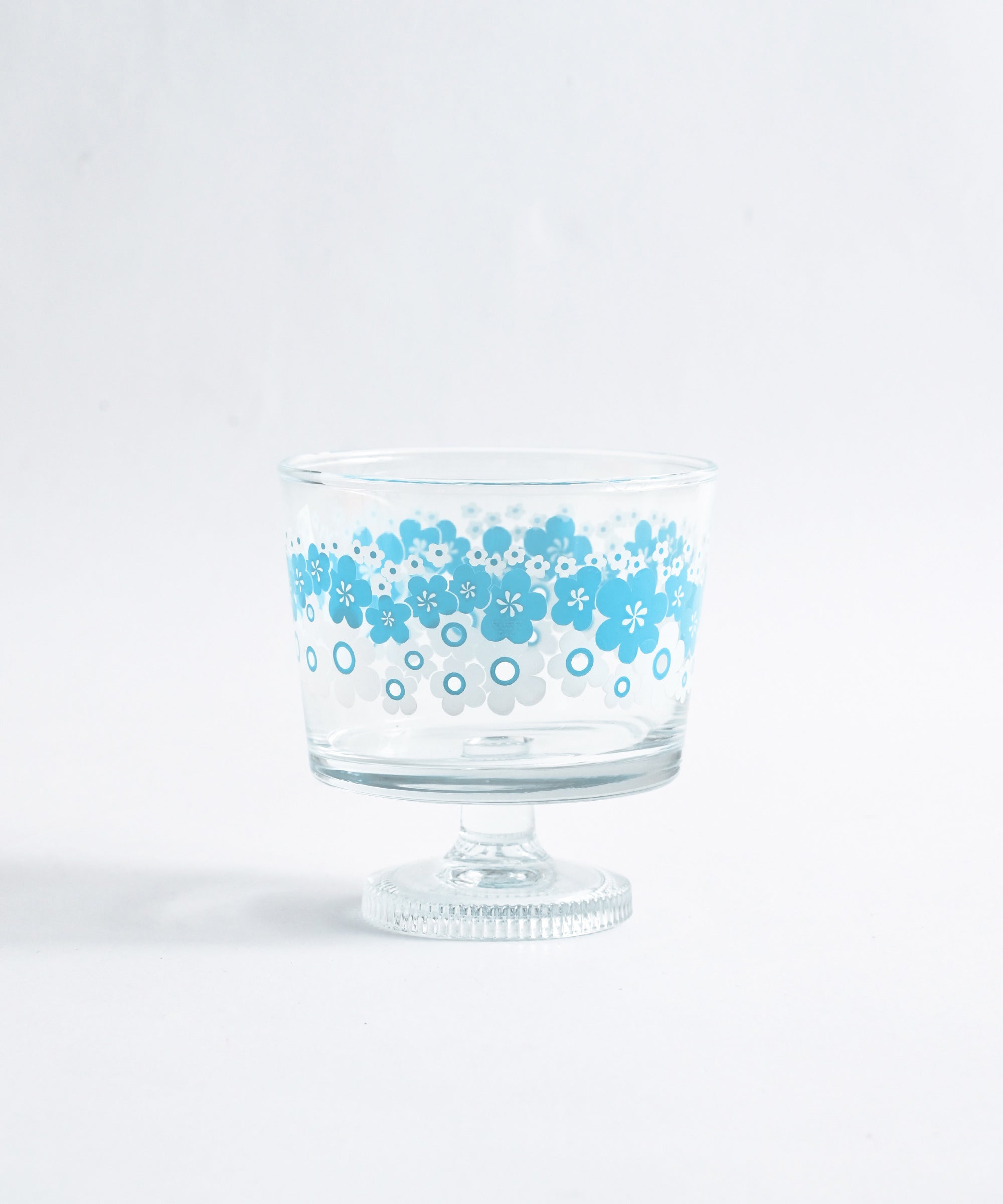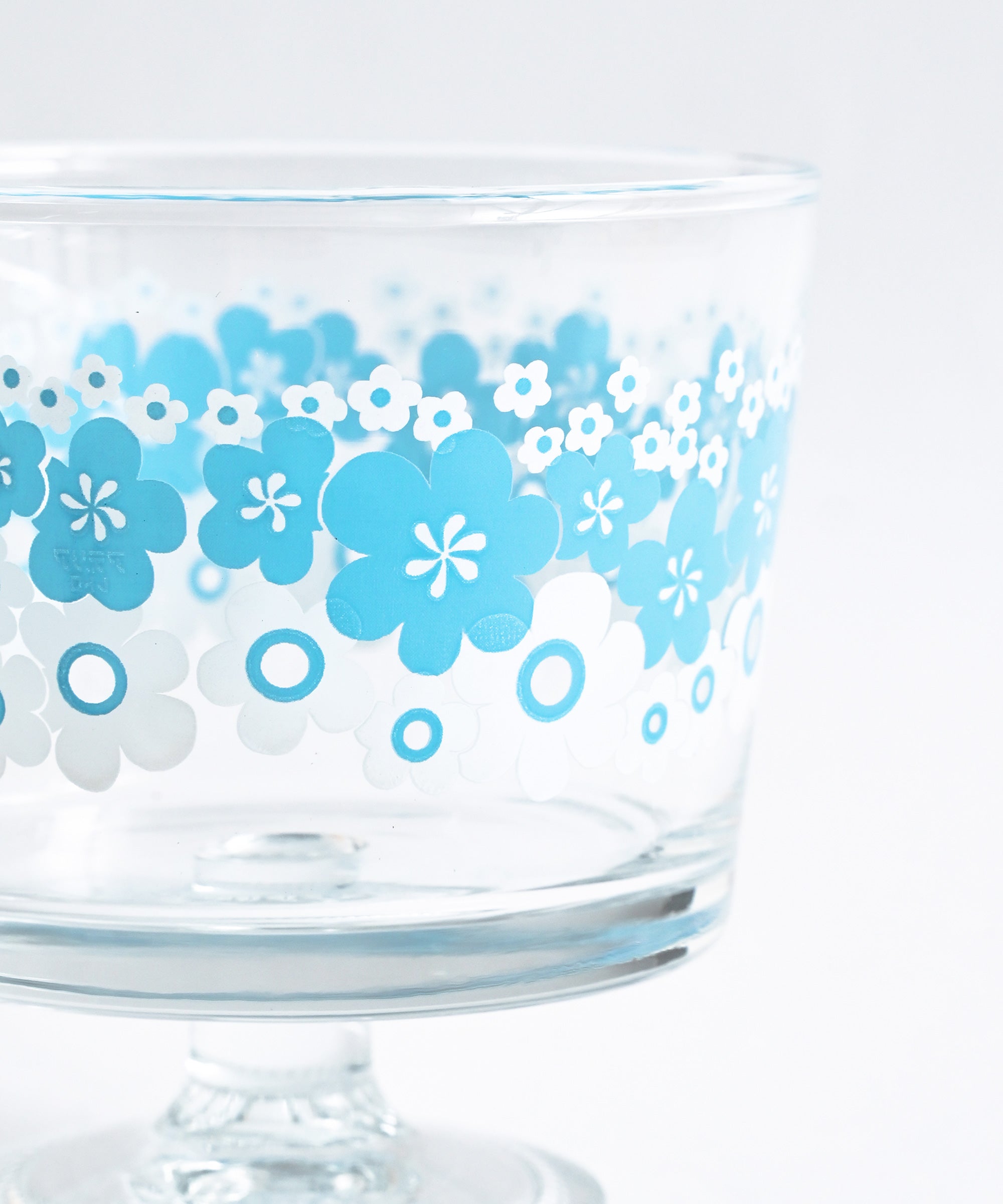 ・「花の輪」:白と水色の組み合わせが爽やかな、1976年に発売された柄。当時はクリアブルーのグラスにプリントされていました。大小のポップなお花が咲きこぼれた、動きのあるデザインが印象的。涼やかな色合いのお花が何輪も重なり合うように描かれ、可憐で優しい雰囲気が漂っています。