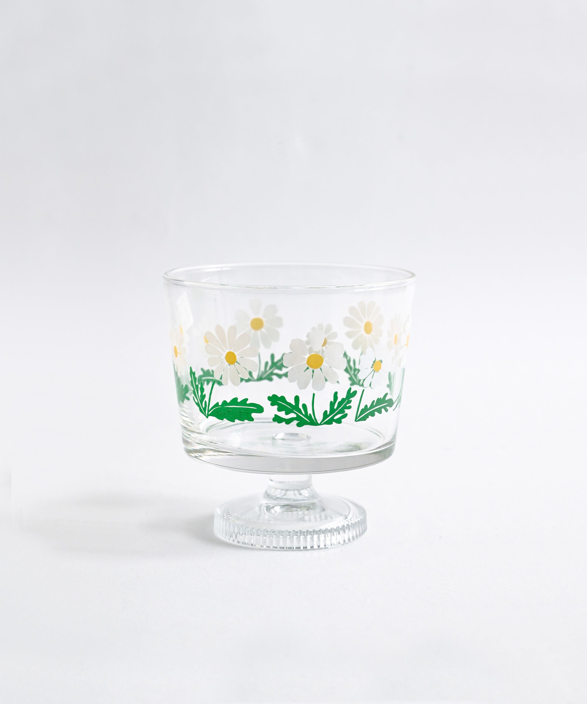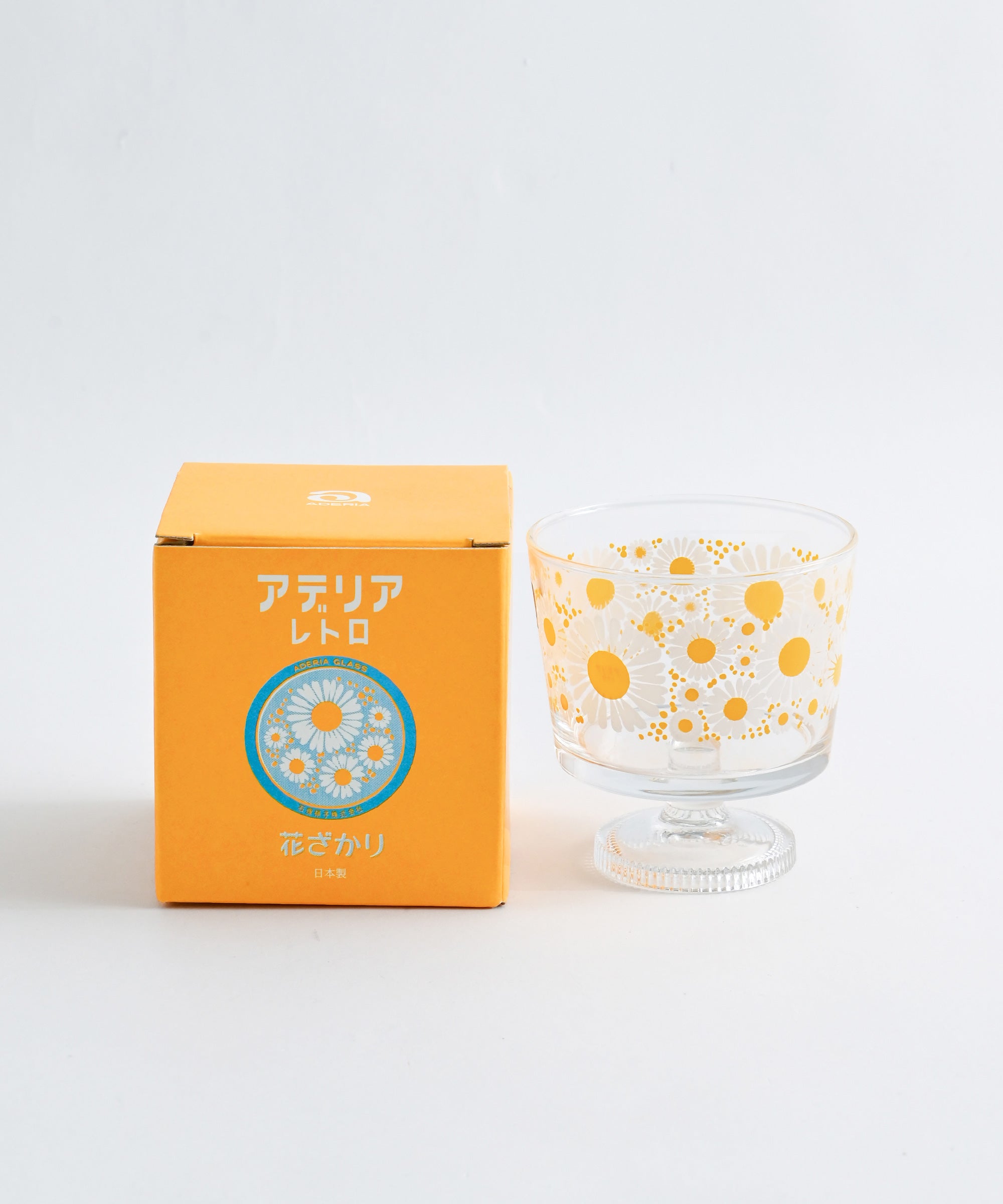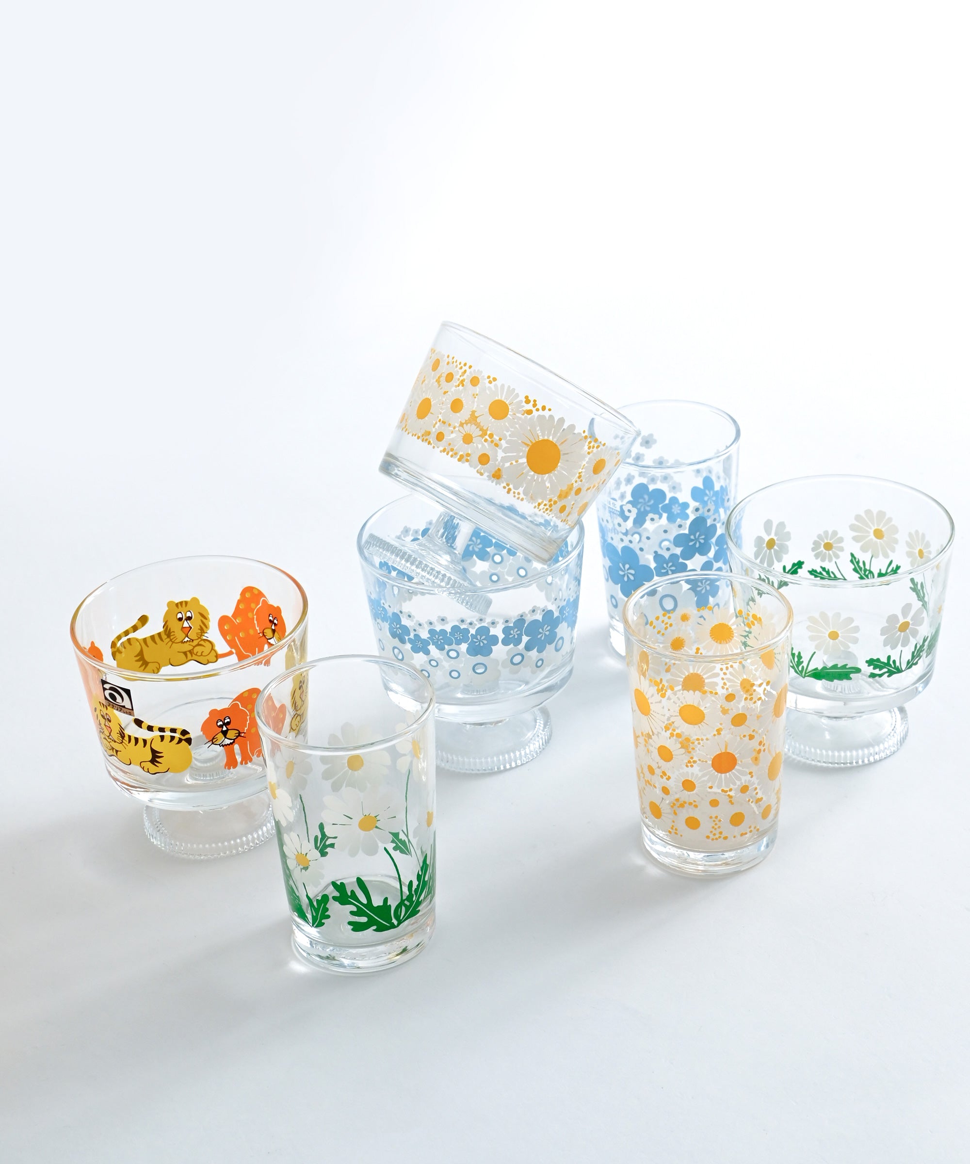 ・「花ざかり」:グラス一面に咲きこぼれたマーガレットが華やかなシリーズ。お花畑のような柄はテーブルに置くだけで明るく華やかに。発売は1971年。当時は琥珀色(アンバー)のグラスと、無色透明のグラスにプリントされた2種類が生産されていました。その時代の流行であった花柄を目一杯取り入れた、存在感のあるデザインです。