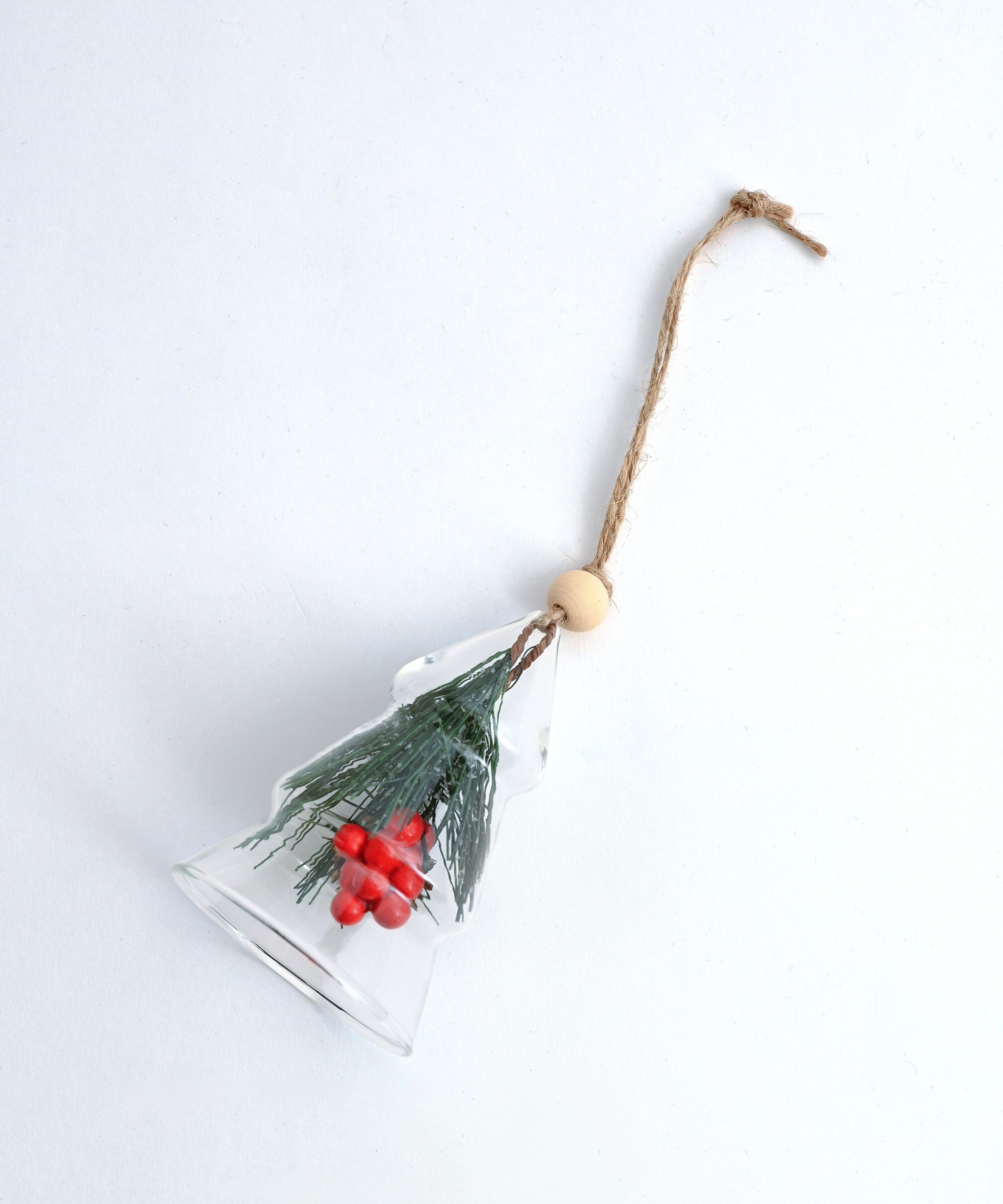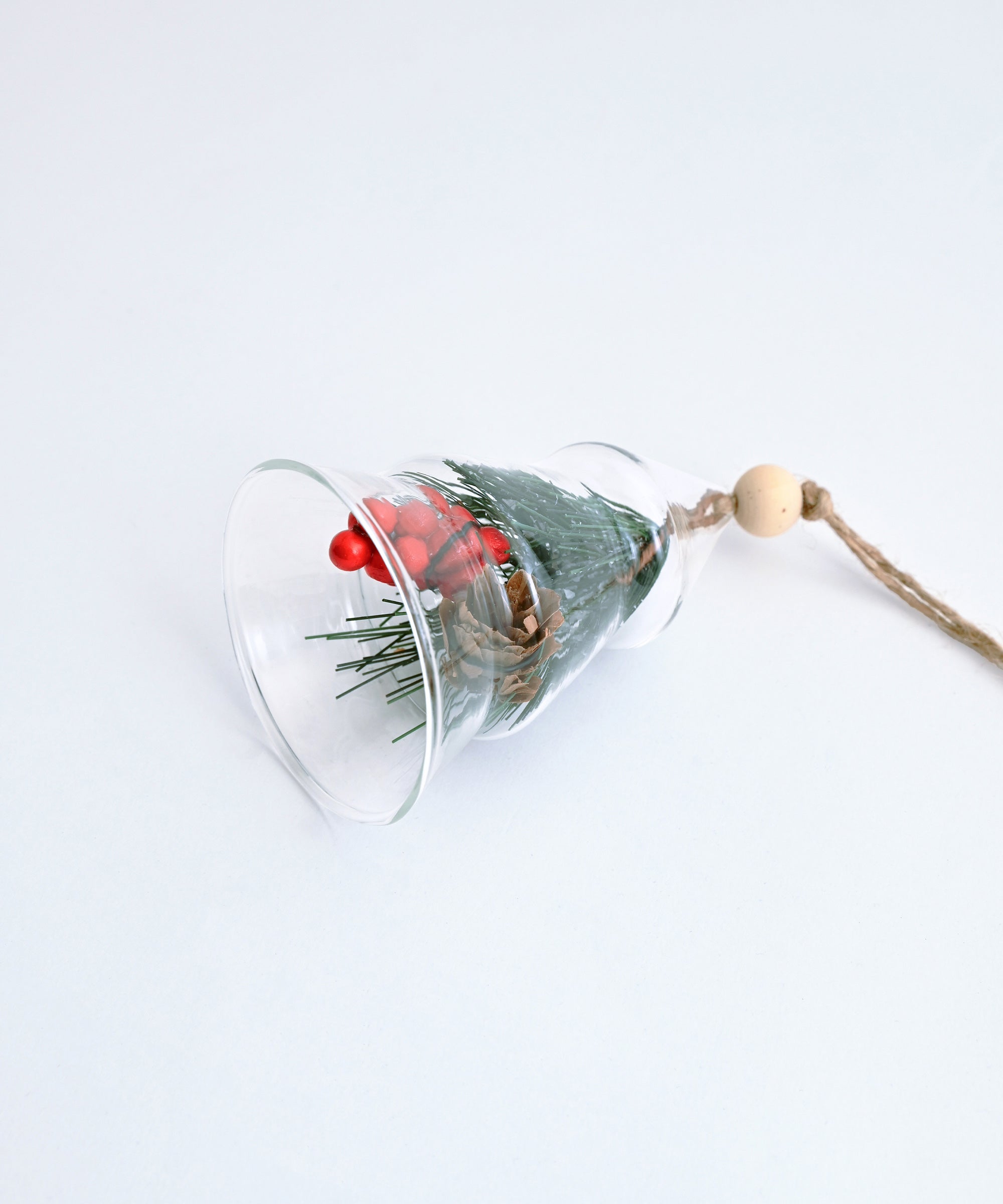 繊細なガラスで形作られたツリー型のオーナメント。松ぼっくりや赤い実、小さな針葉樹の枝が丁寧に収められており、まるで森の中のクリスマスを閉じ込めたかのようなデザインです。