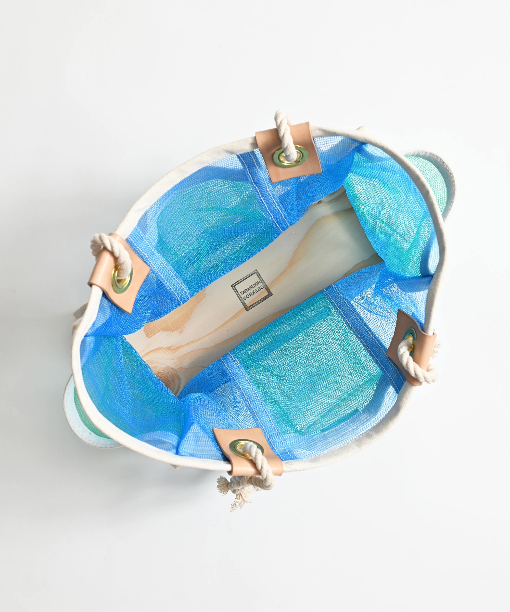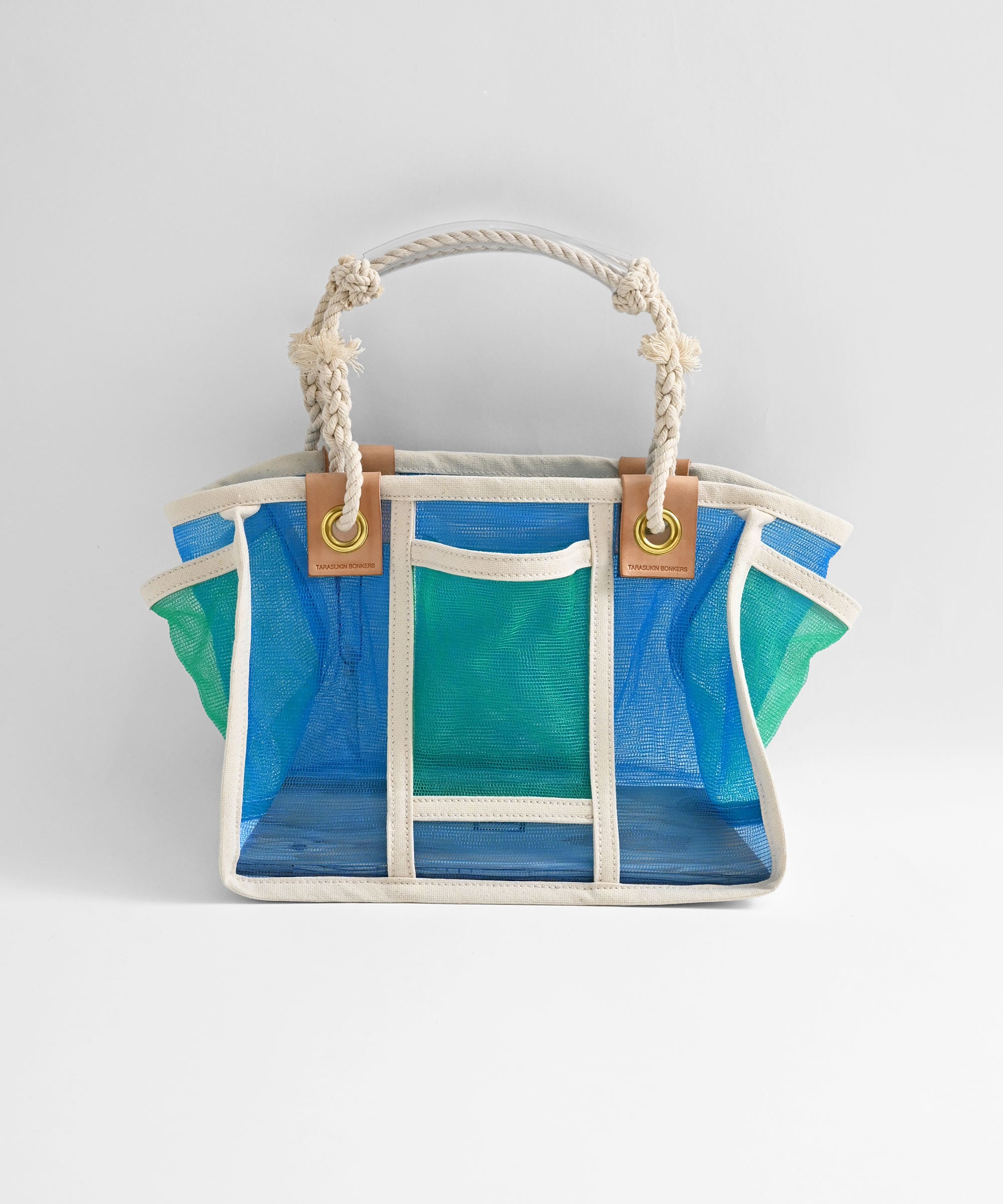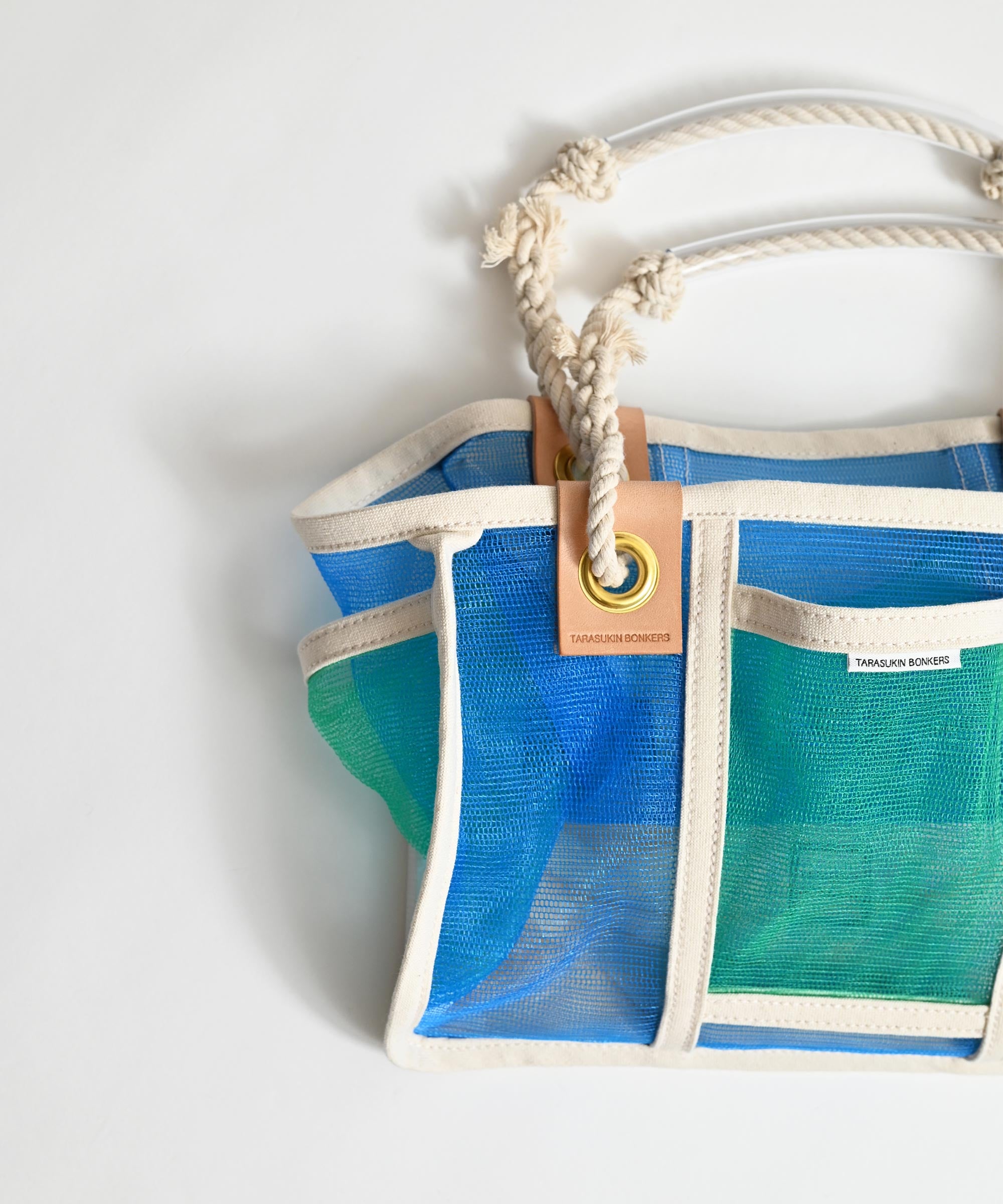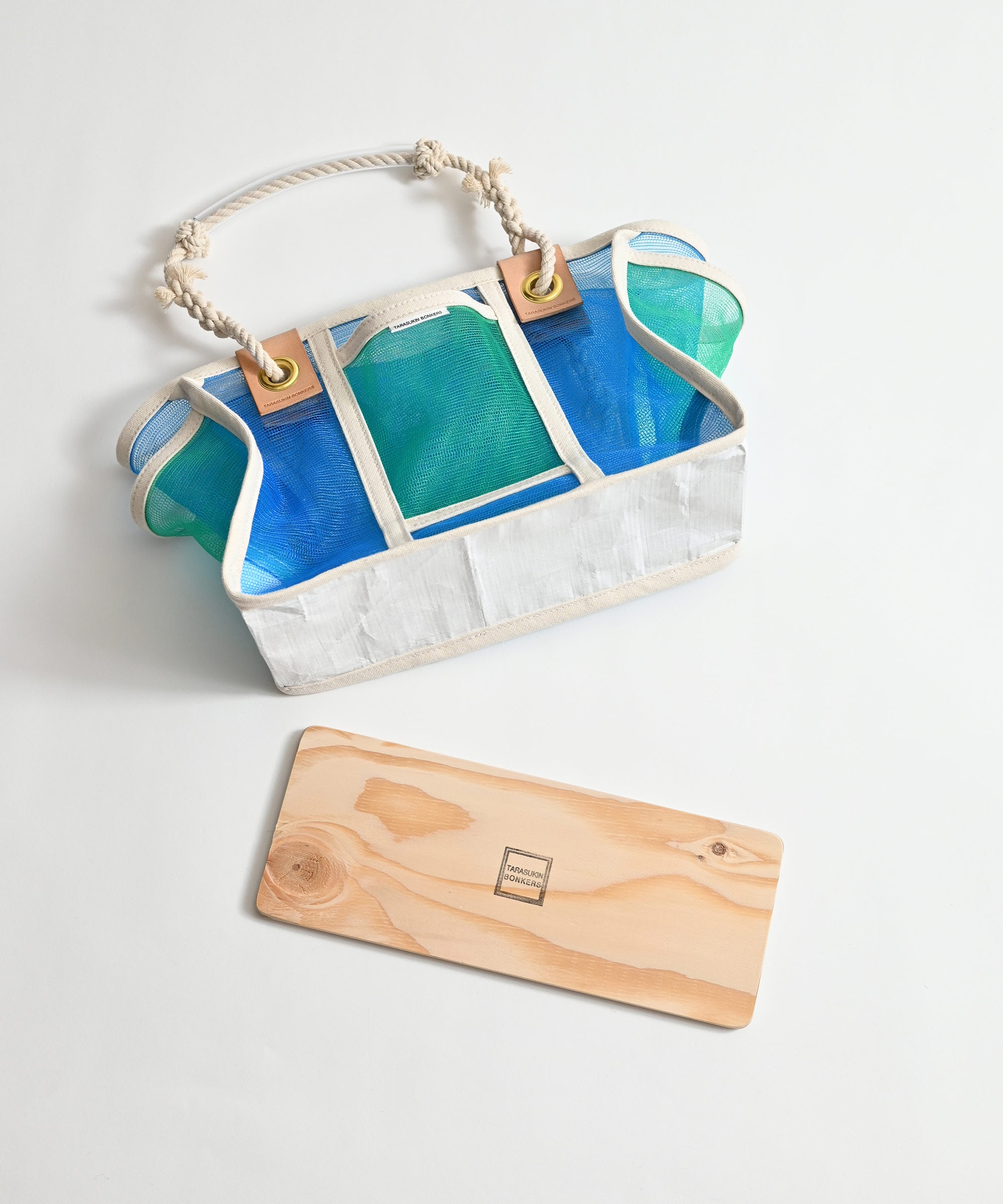 南伊豆の暮らしの中で見つけた汎用的な素材の輝きをデザインに取り込んでいます。例えば、畑でみかんの収穫用に使われる網や、農業用の網、波止場で見かけるロープワークなど、そのどれもが地域で生き生きと使われているものたちです。都会では気づくことのなかった汎用的な素材の輝きを詰め込み、TARASUKIN BONKERSの独特な視線で仕上げられた愛らしいアイテムをお楽しみください。