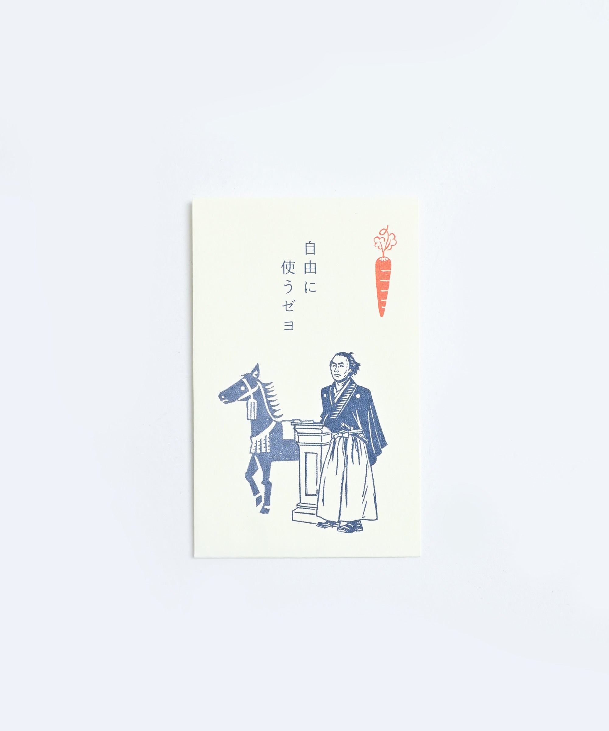 手づくりはんこ作家「史緒シリーズ」のクスっと笑えるデザインのぽち袋です。坂本龍馬の「馬」にちなんだ、2026年午年におすすめのデザインです。