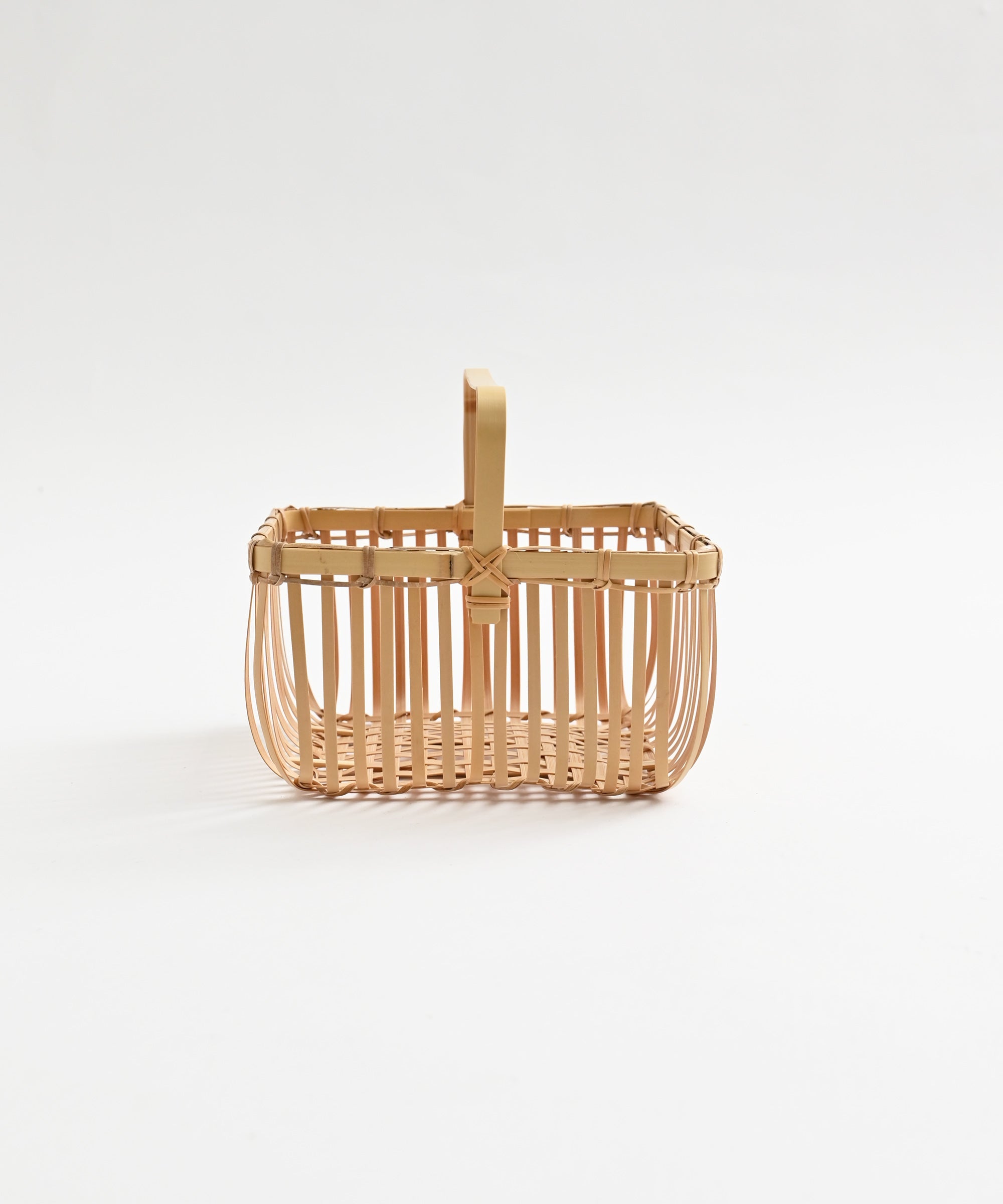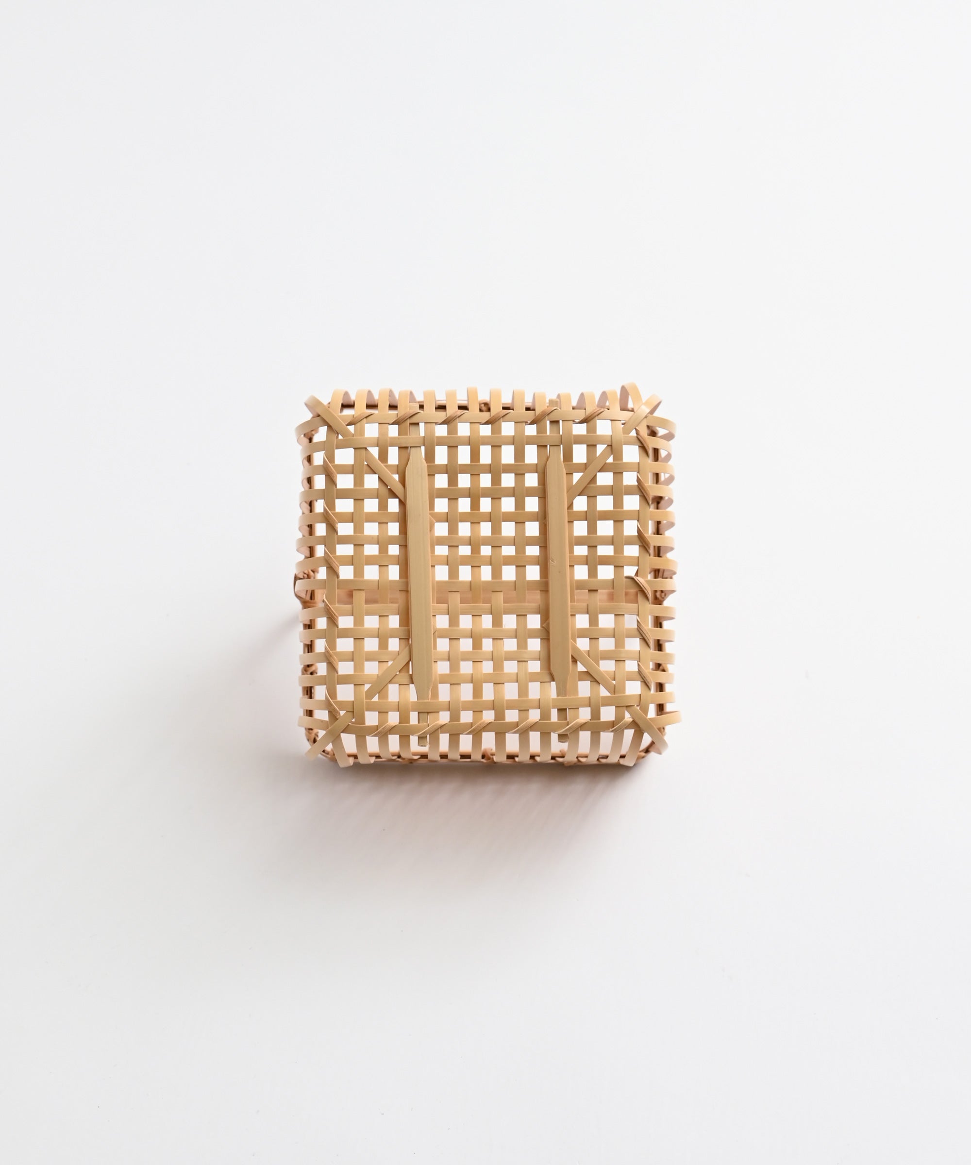 等間隔にまっすぐに揃った櫛目が上品な正角かご。卓上調味料や、コンパクトなコスメ・ケア用品などの収納にも。