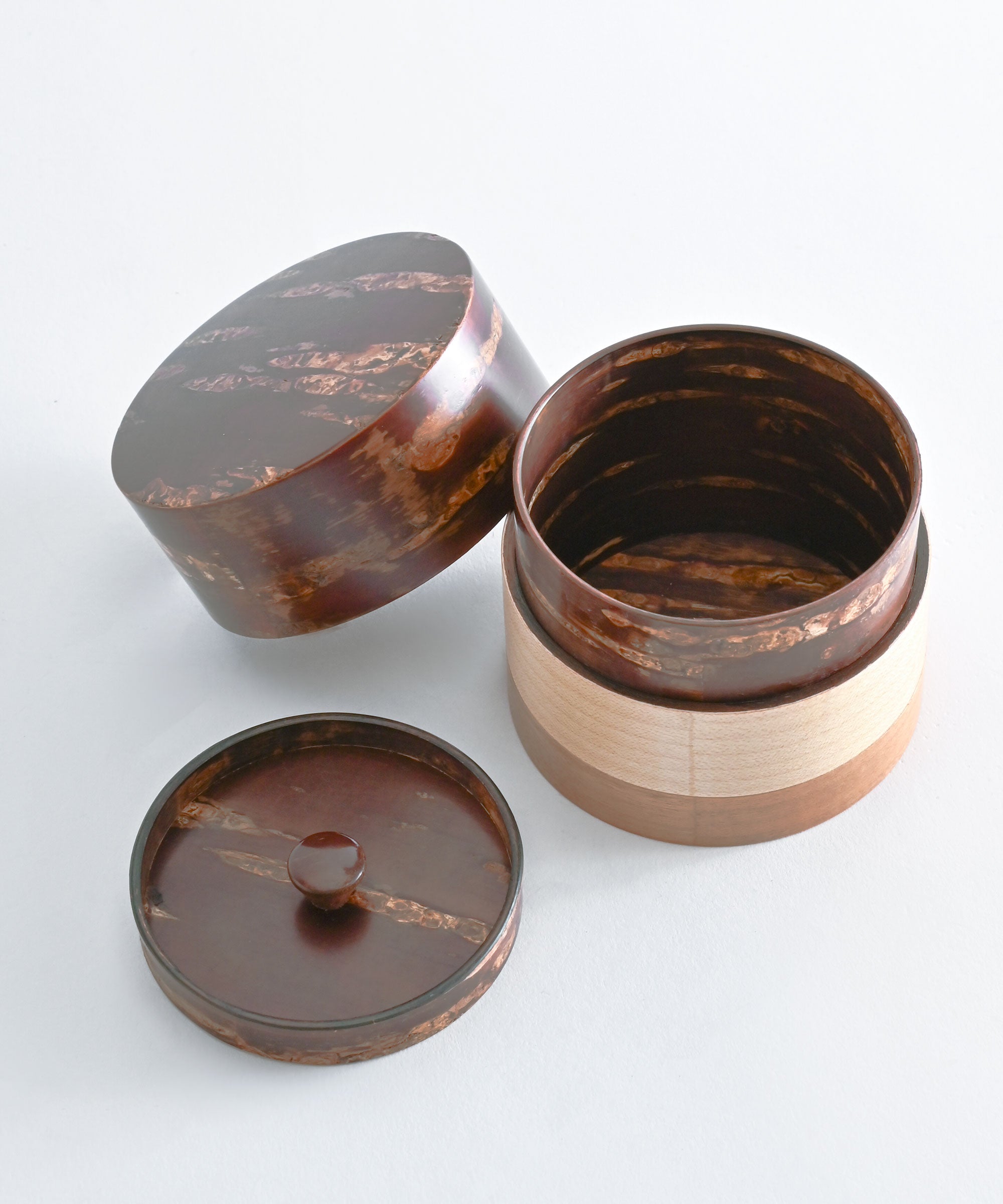 外筒と内筒で作られる「型もの」技法の特性を活かしつつ、新しい製法を用いた藤木伝四郎商店オリジナルの茶筒です。