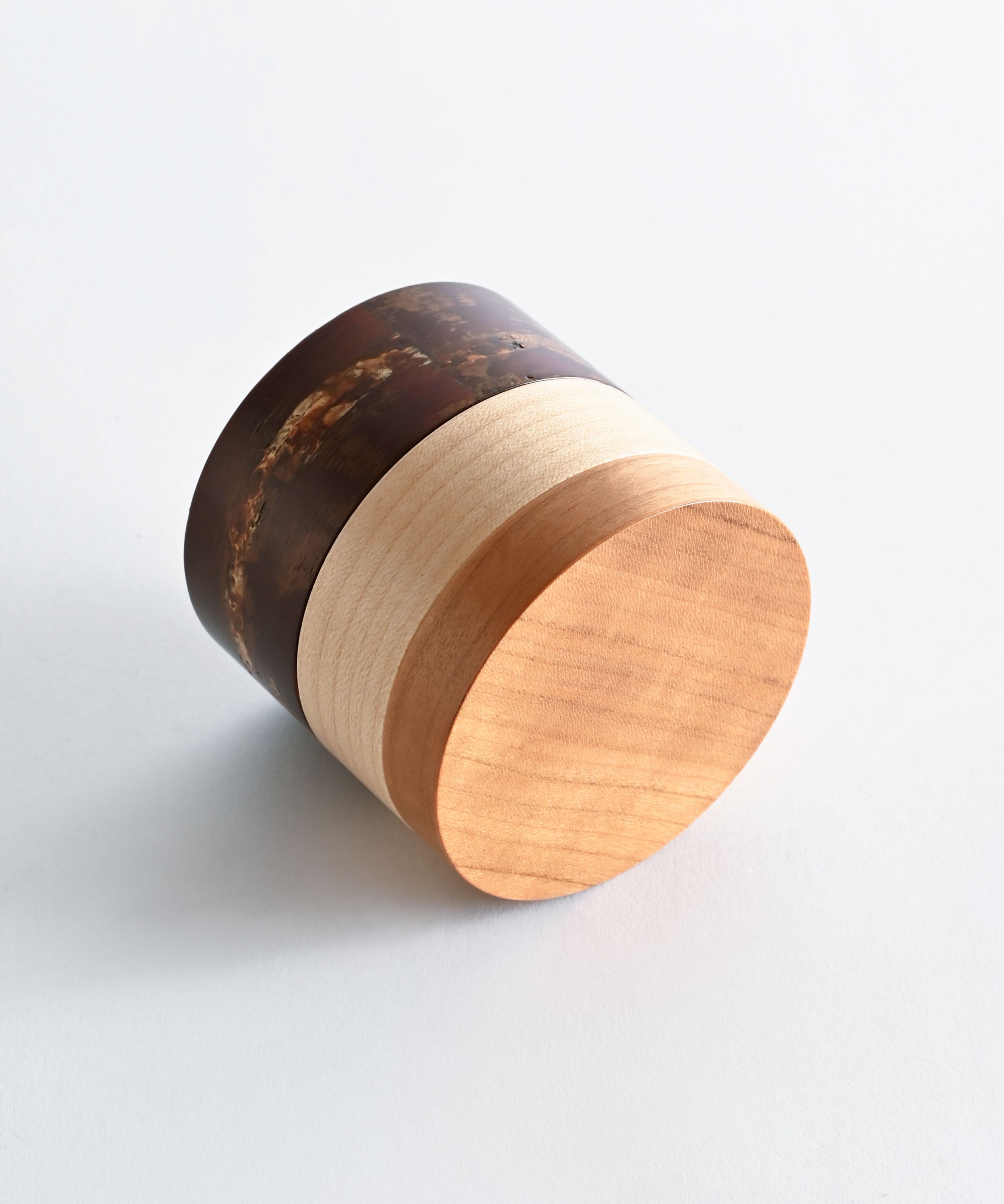 桜皮、さくら、かえでの各外筒を3つに輪切りにしたものを組み替え、内筒にかぶせました。