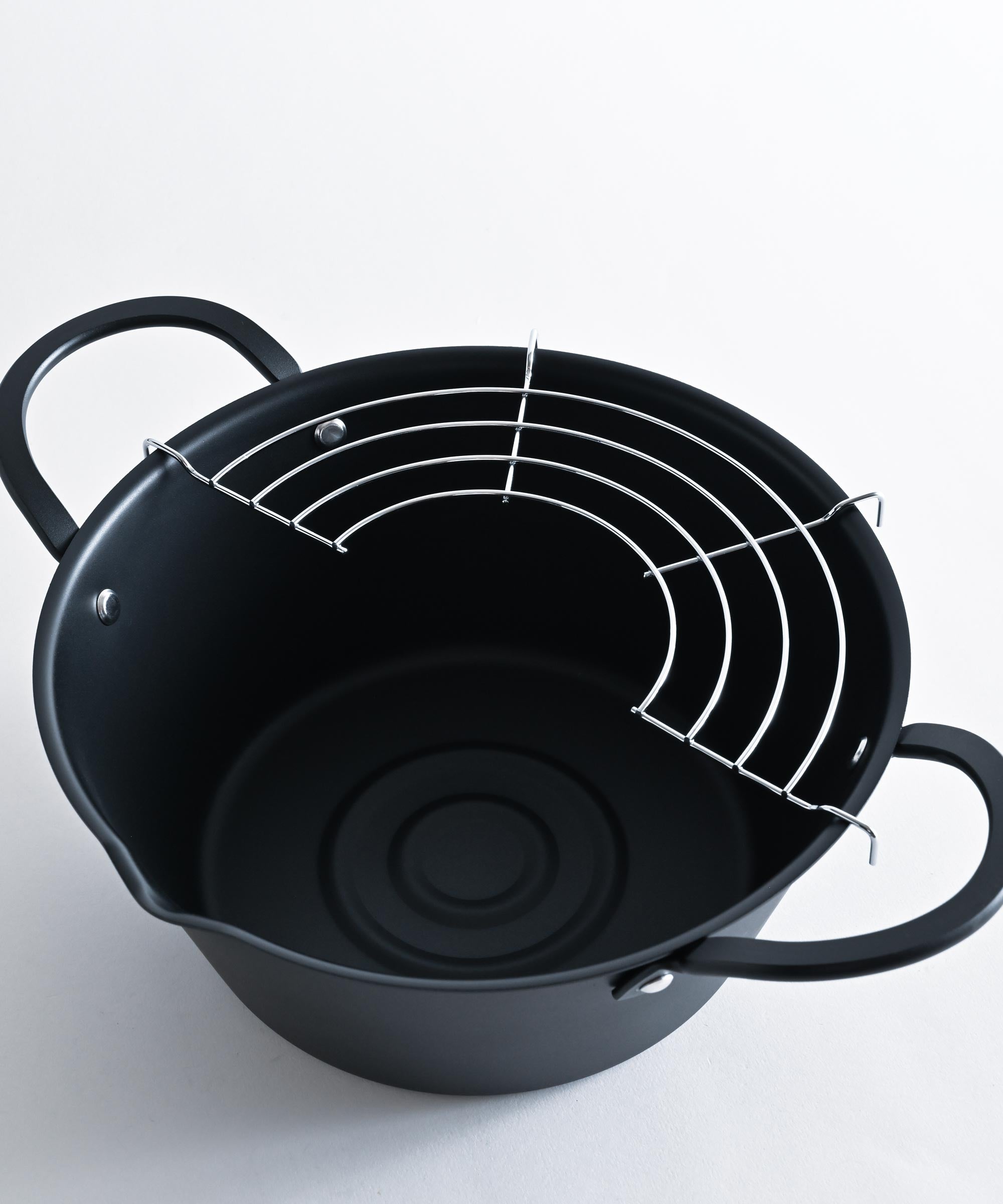油の移し替えがしやすい注ぎ口と、油きりに便利なアミ付き。