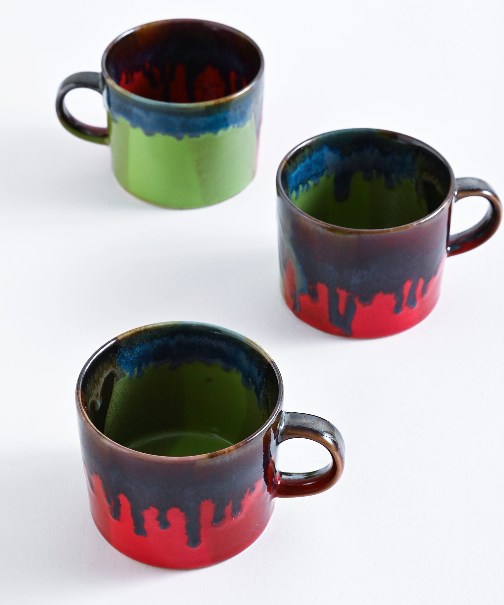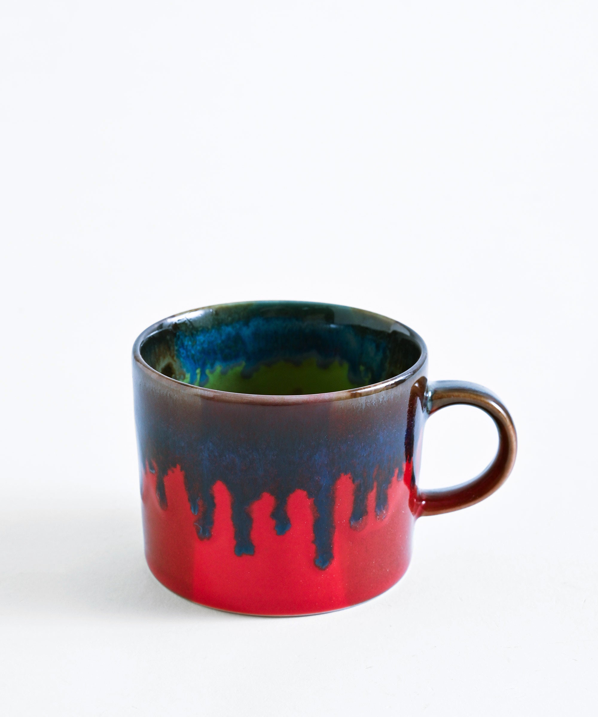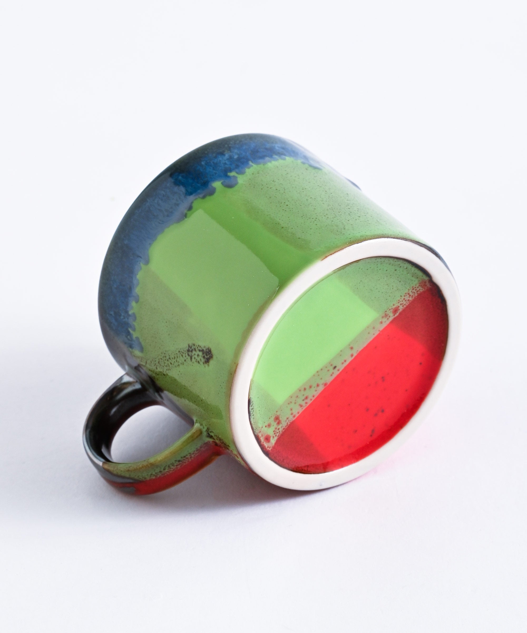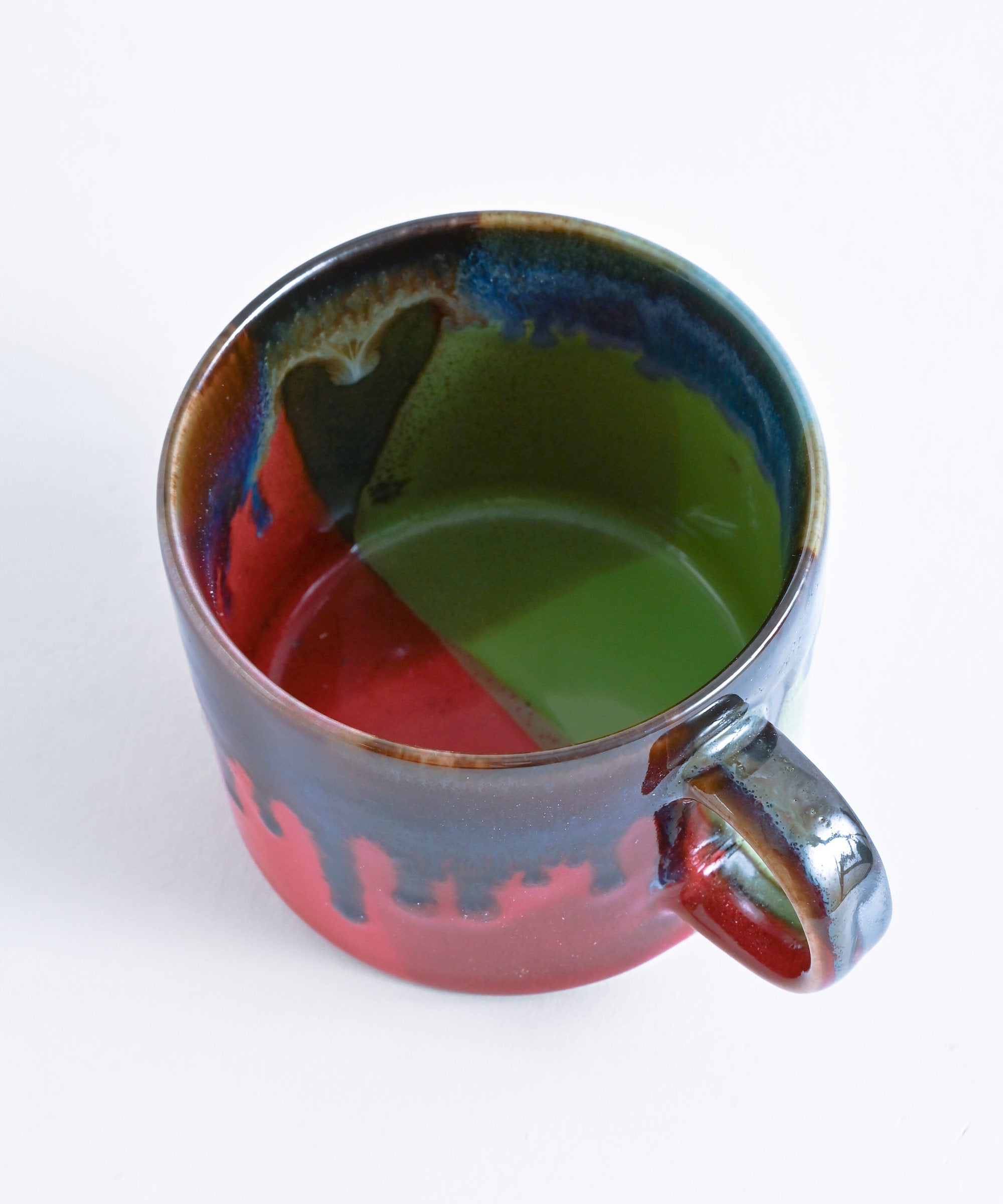 発色の良い釉薬を上下左右でかけ分けたポップなカラーリングのマグカップに仕上がりました。