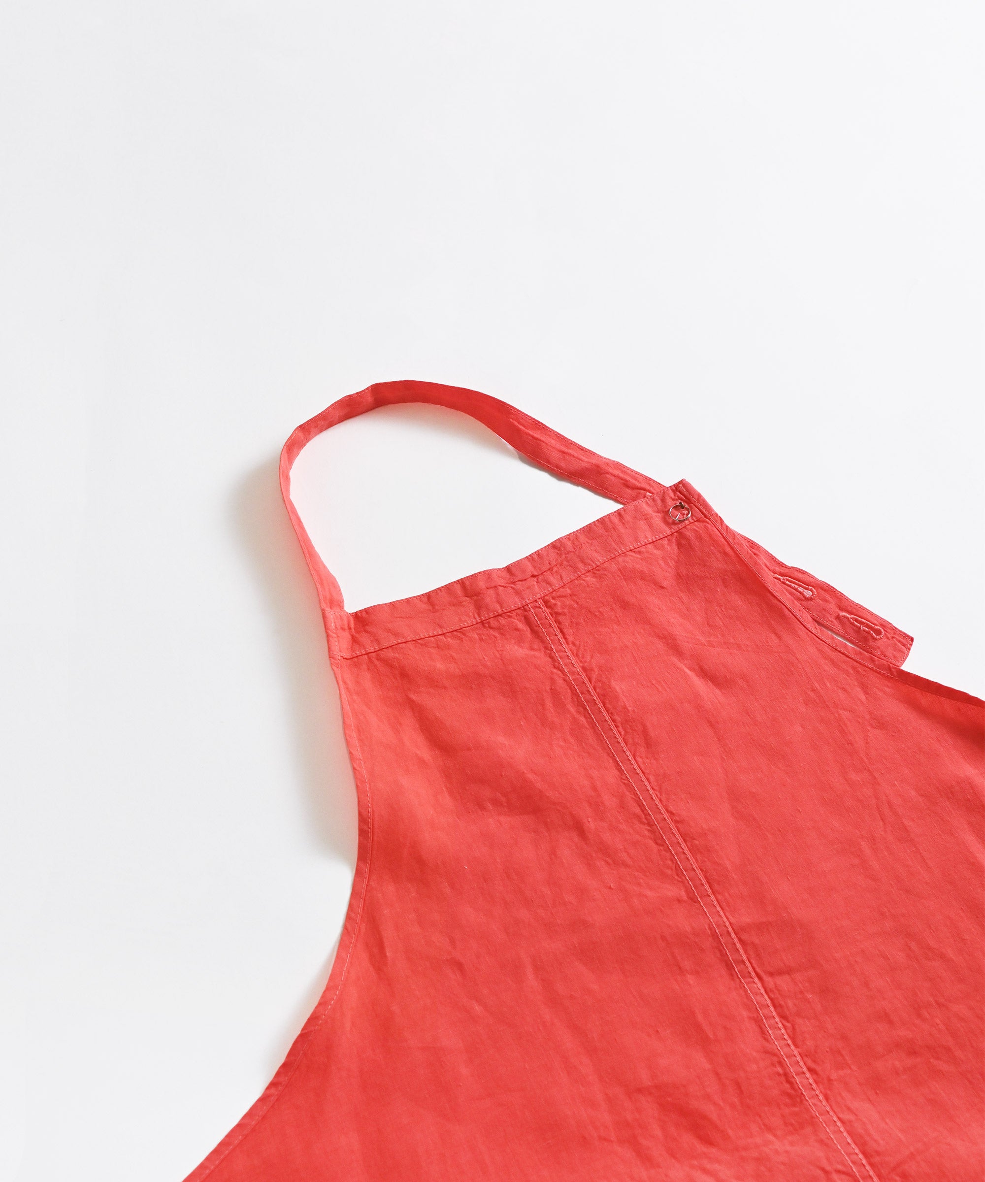 素材と縫製にこだわったエプロンを中心としたアイテムを展開しているブランド“CUMO”さんとのコラボエプロン。BASIC AND ACCENTの別注カラーとなっています。ヨーロッパのワークスタイルのエプロンをもとにデザインしていて、腰の大きなポケットが特徴です。打ち込みの良い贅沢なリネンの生地を使用し、ガーメントダイ(製品染め)を施しているので生地の表情も大変豊かです。丈が長いので男性でも着用頂けます。首紐は4段階で調節可能。ボタンは、1950年代のヨーロッパで洗濯板で洗いやすいようにと生まれたチェンジボタン仕様。洗濯時にはエプロン本体からボタンを取り外して洗えます。洋服感覚で、纏ってみたくなるエプロンです。