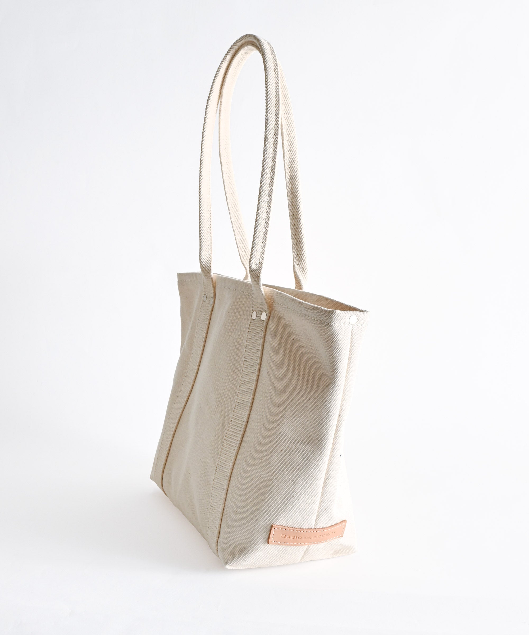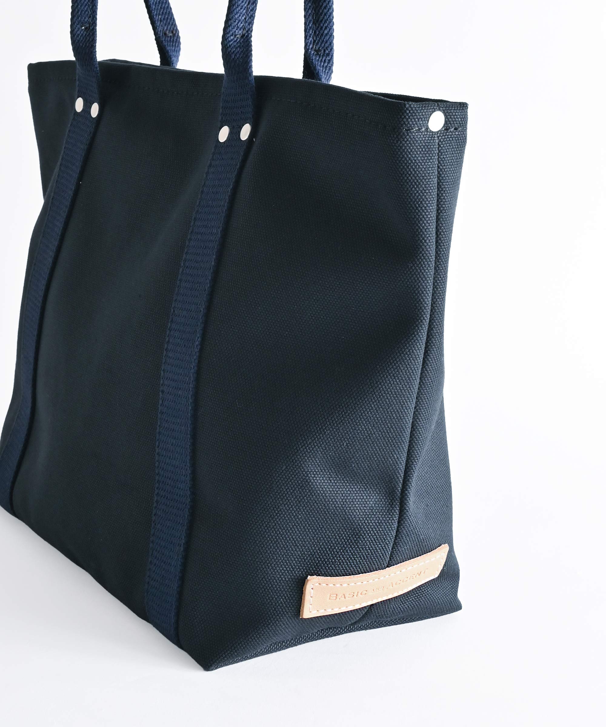 大分の佐藤防水店さんに作っていただいているオリジナルのトートバック。国産4号帆布を使用したしっかりとした素材感。持ち手にはG.Iベルトに使われるテープを使用し、栃木レザーにBASIC AND ACCENTのロゴをエンボス加工したネームタグもデザインポイント。S/Lサイズもあります。