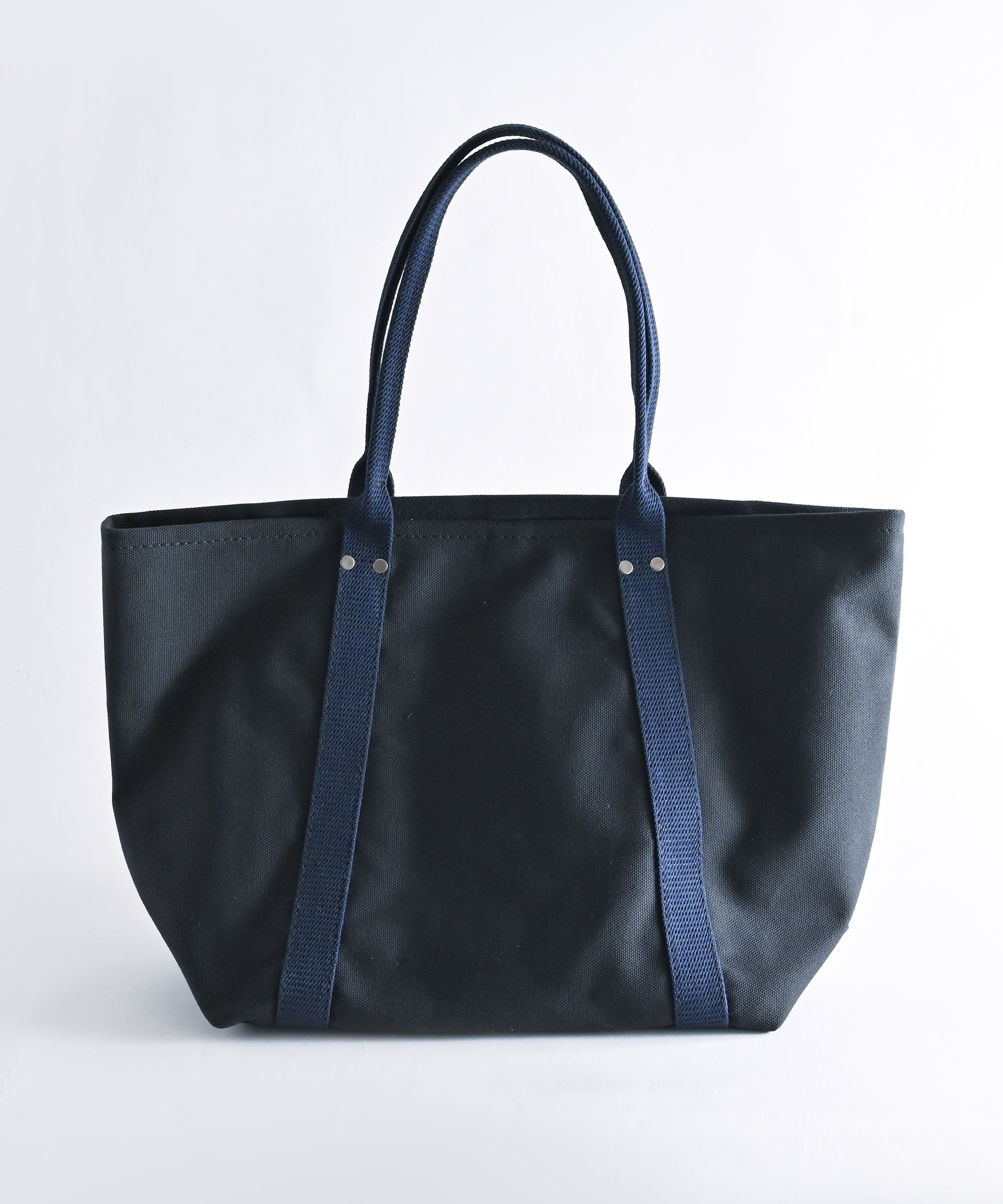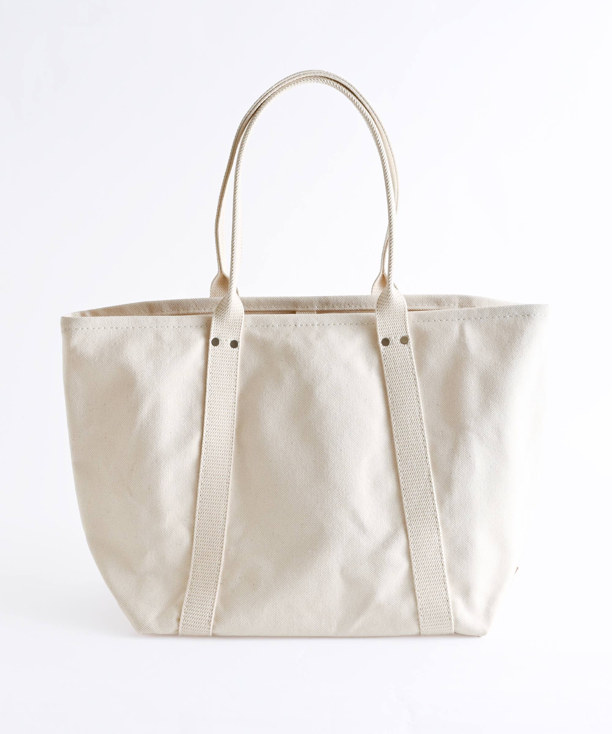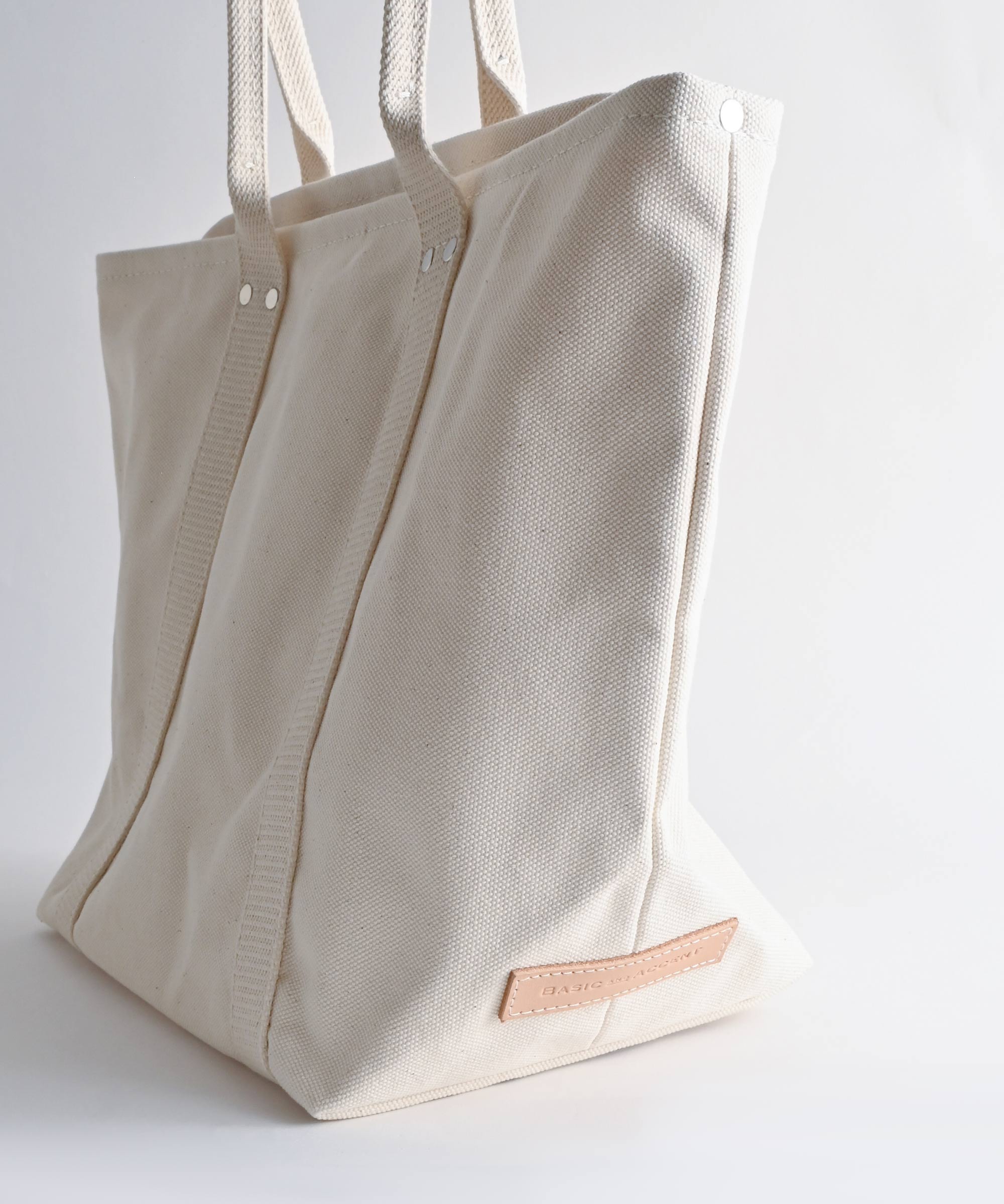 大分の佐藤防水店さんに作っていただいているオリジナルのトートバック。国産4号帆布を使用したしっかりとした素材感。持ち手にはG.Iベルトに使われるテープを使用し、栃木レザーにBASIC AND ACCENTのロゴをエンボス加工したネームタグもデザインポイント。S/Mサイズもあります。