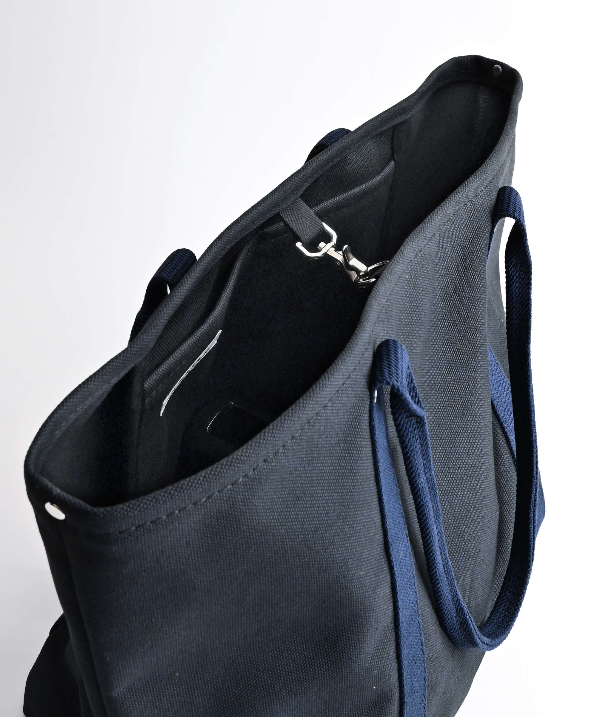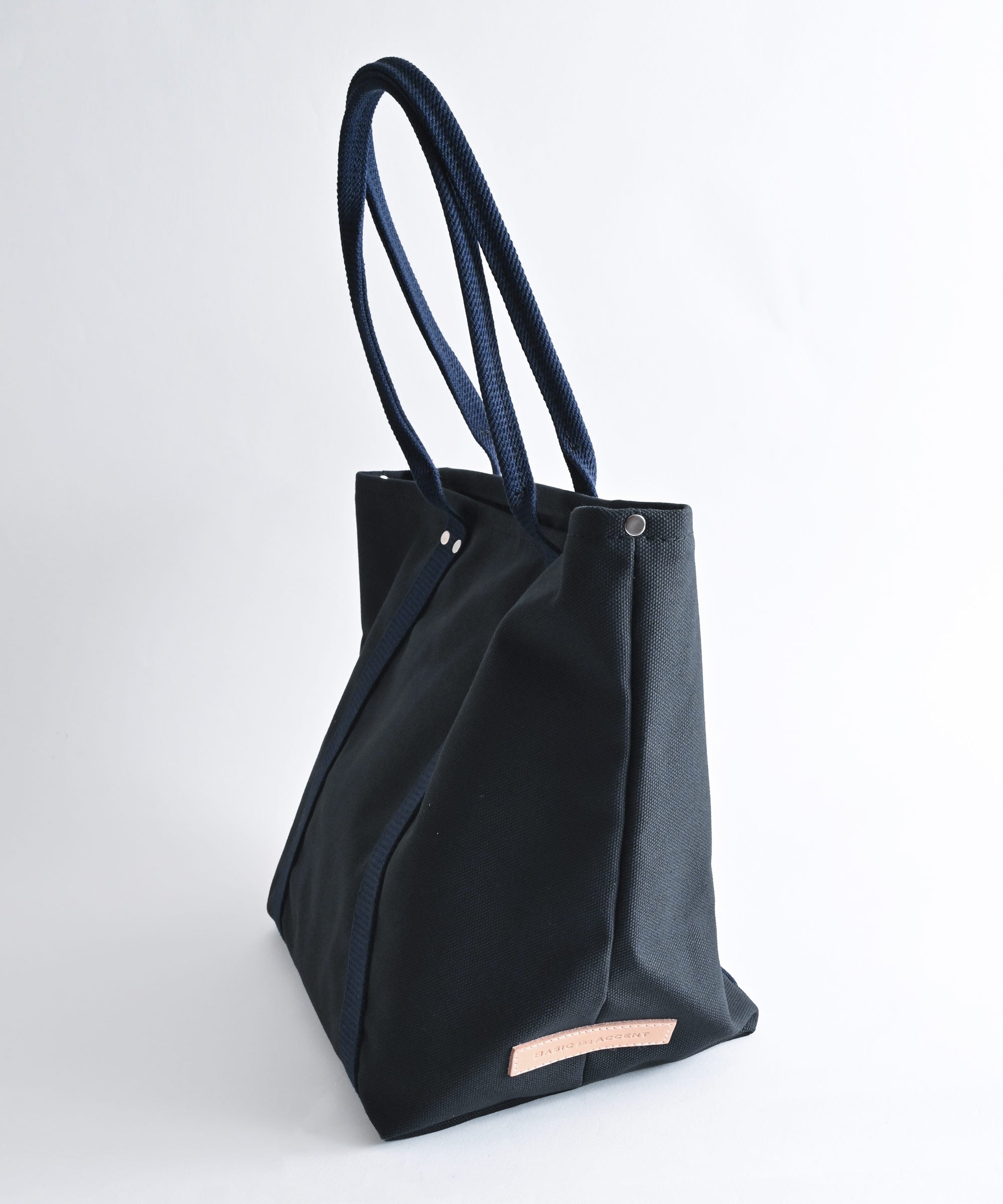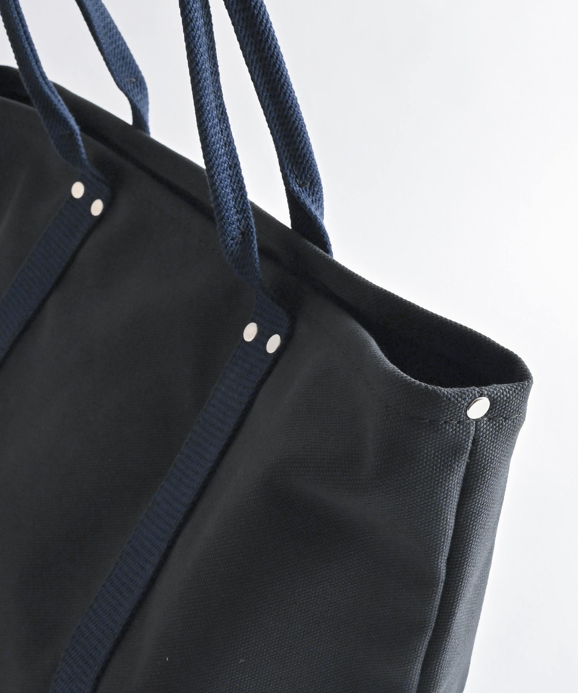 大分の佐藤防水店さんに作っていただいているオリジナルのトートバック。国産4号帆布を使用したしっかりとした素材感。持ち手にはG.Iベルトに使われるテープを使用し、栃木レザーにBASIC AND ACCENTのロゴをエンボス加工したネームタグもデザインポイント。S/Mサイズもあります。