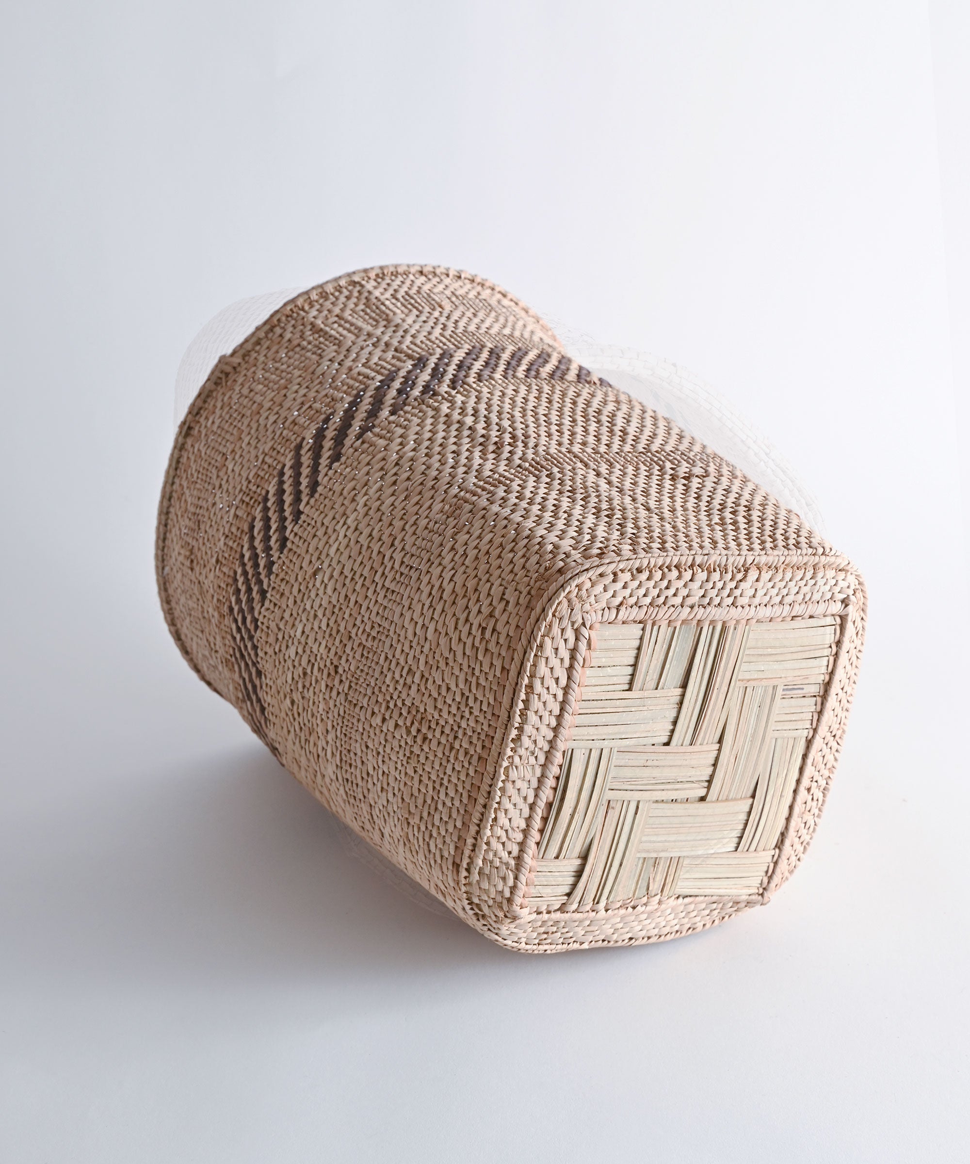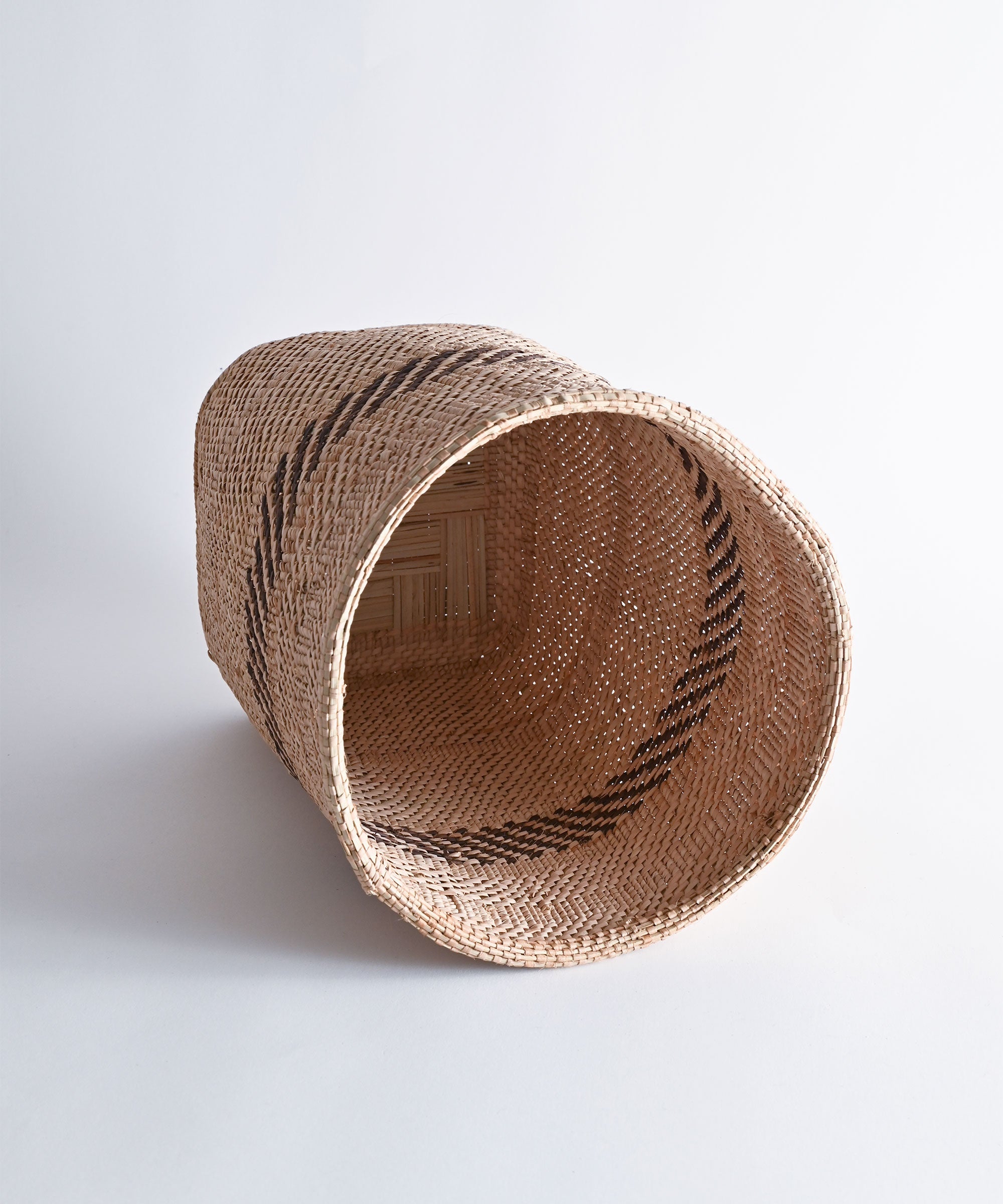 放射状の葛に、ナチュラルなイララの葉と、樹皮や根、泥で染色を繰り返したブラウンの葉の二色が編み込まれ、