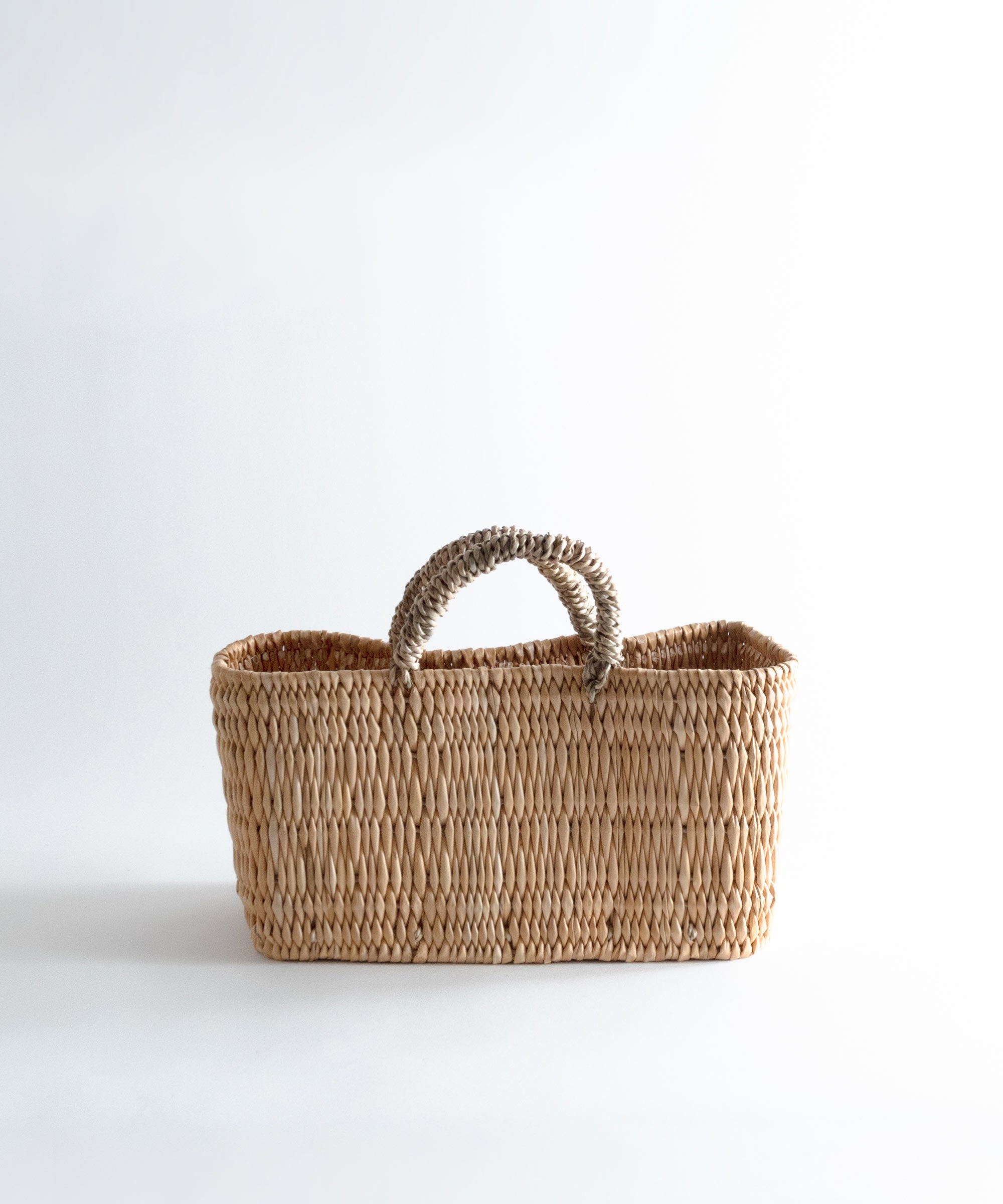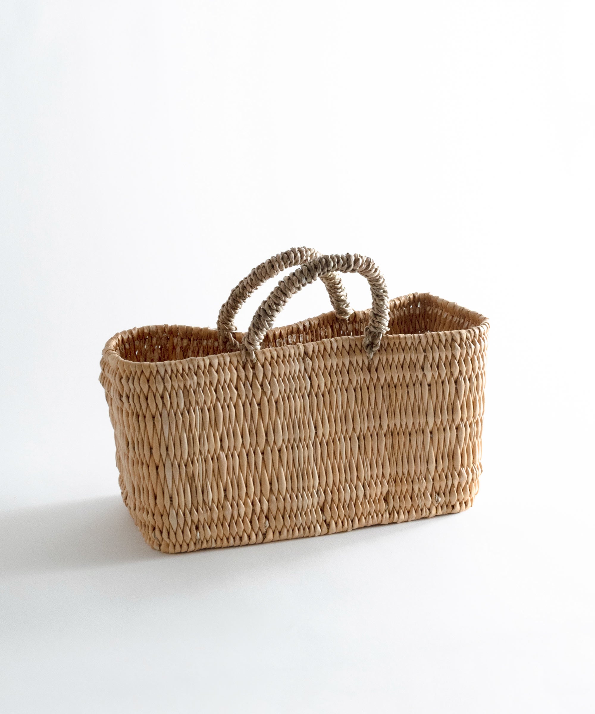 ストロー状の水草で編んだ、横長タイプの四角かごバッグ(バスケット)です。