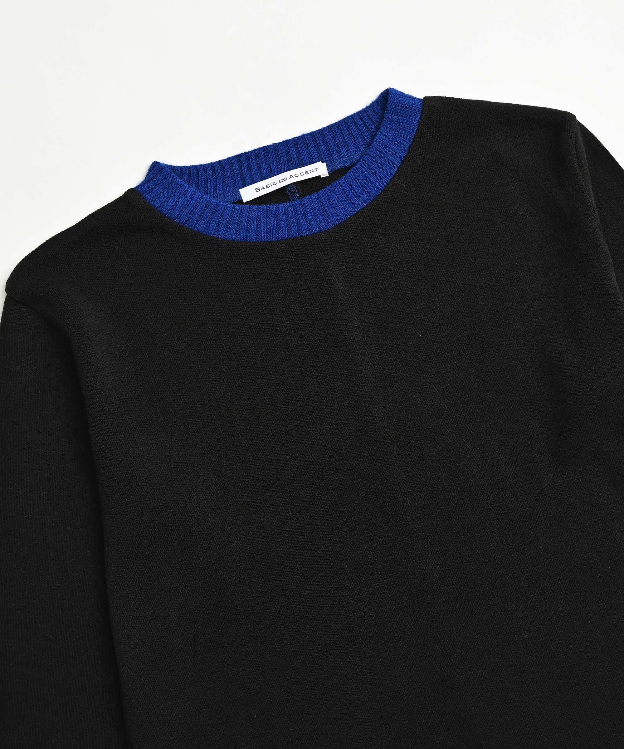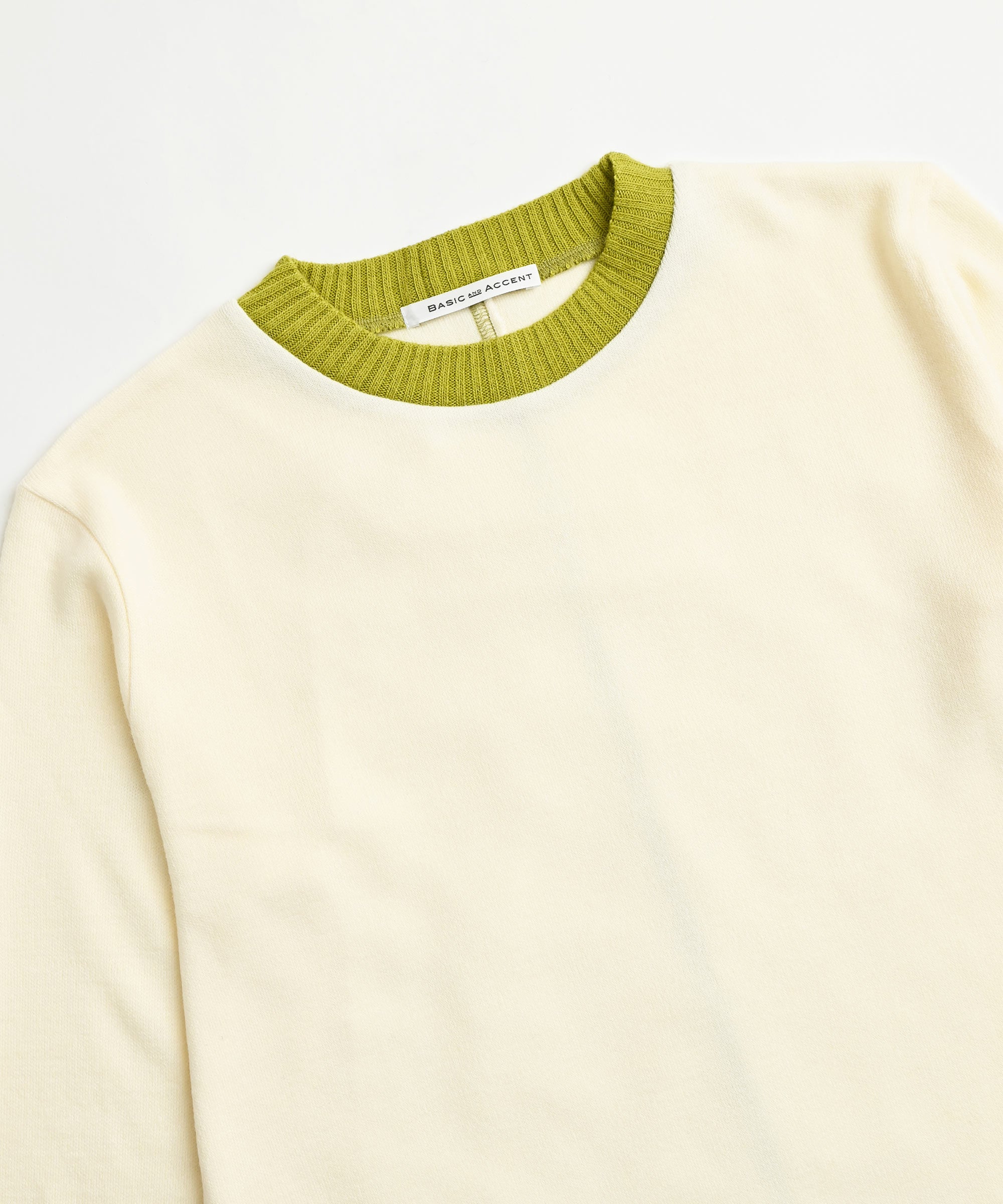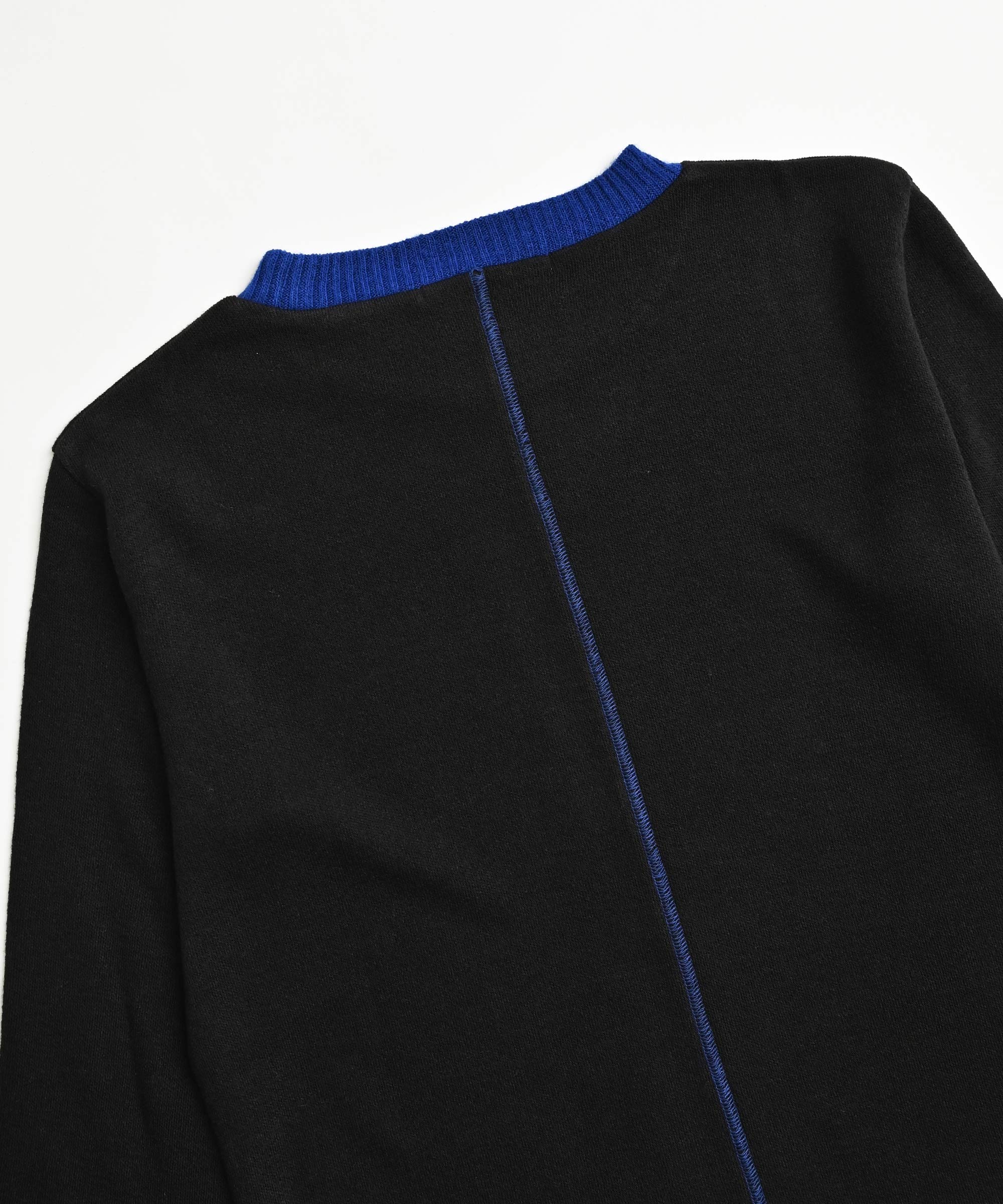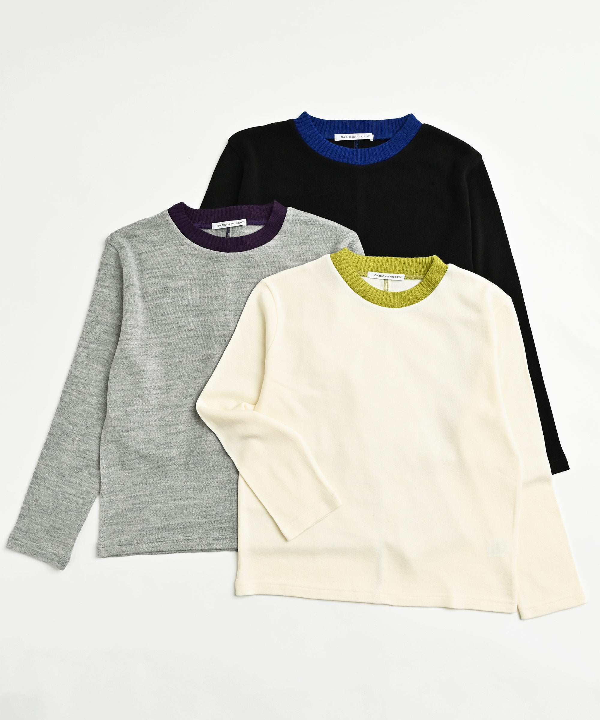 リブの配色と、バッグステッチがアクセントになった、軽く程よいボリューム感のあるニットソー。