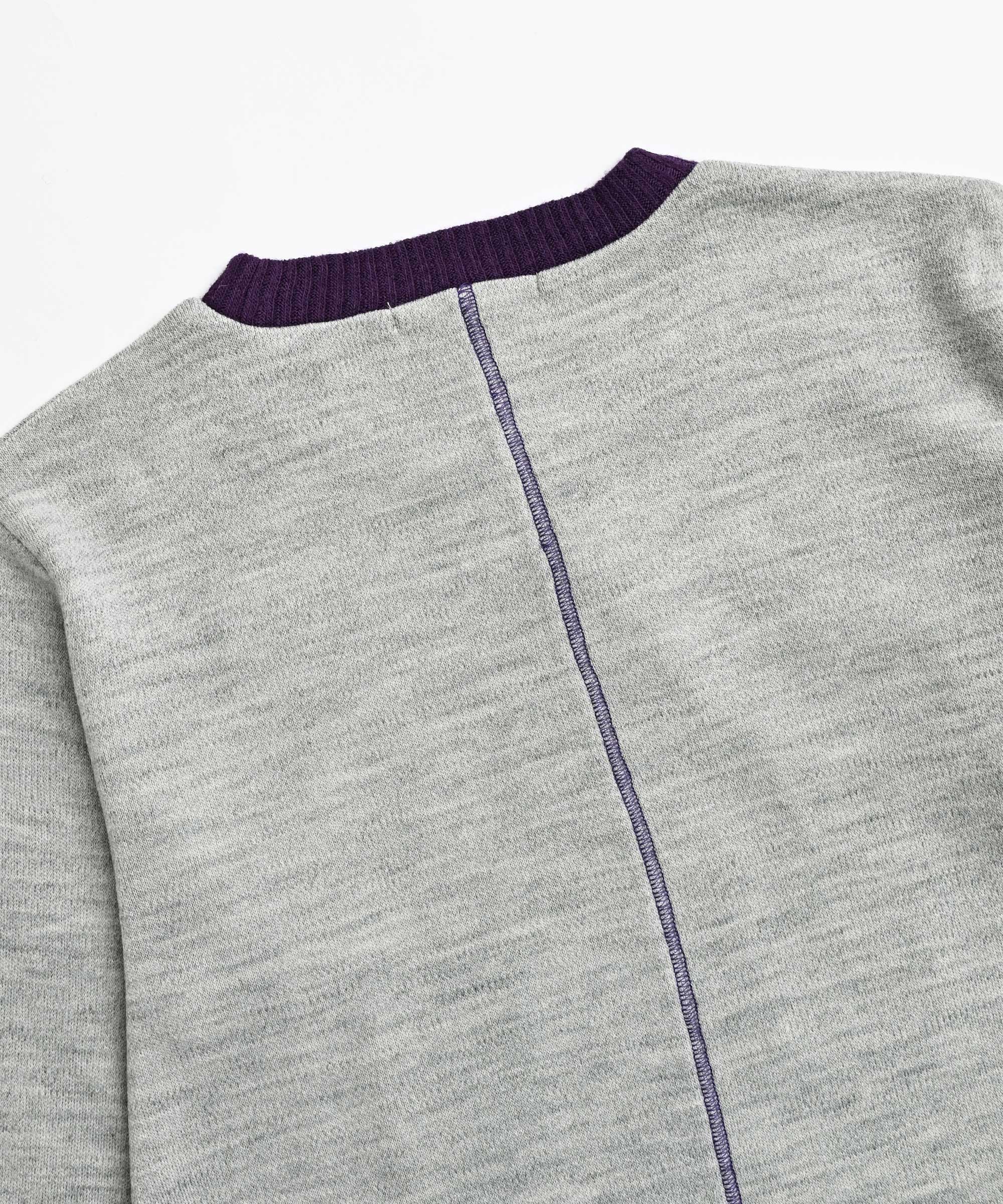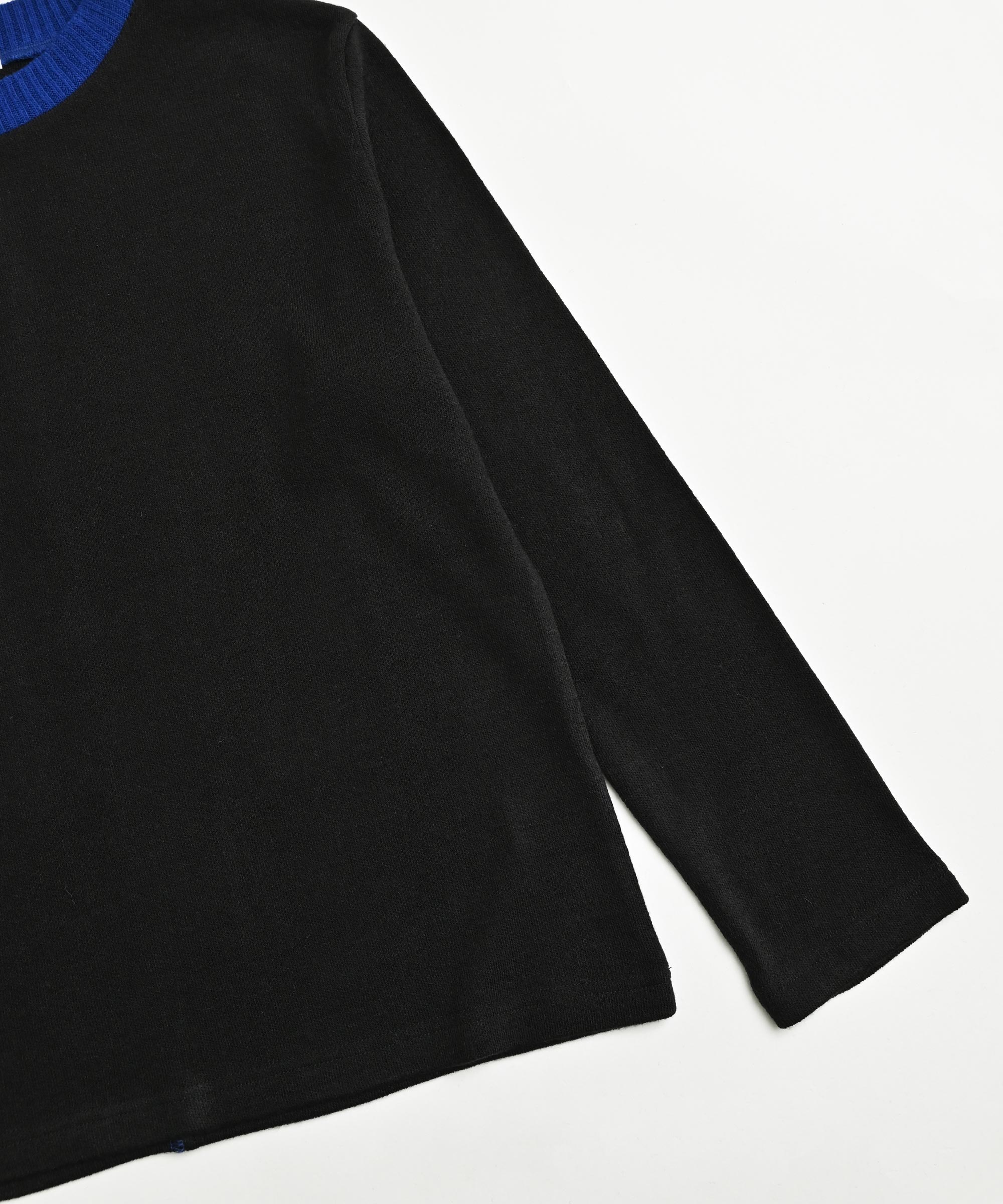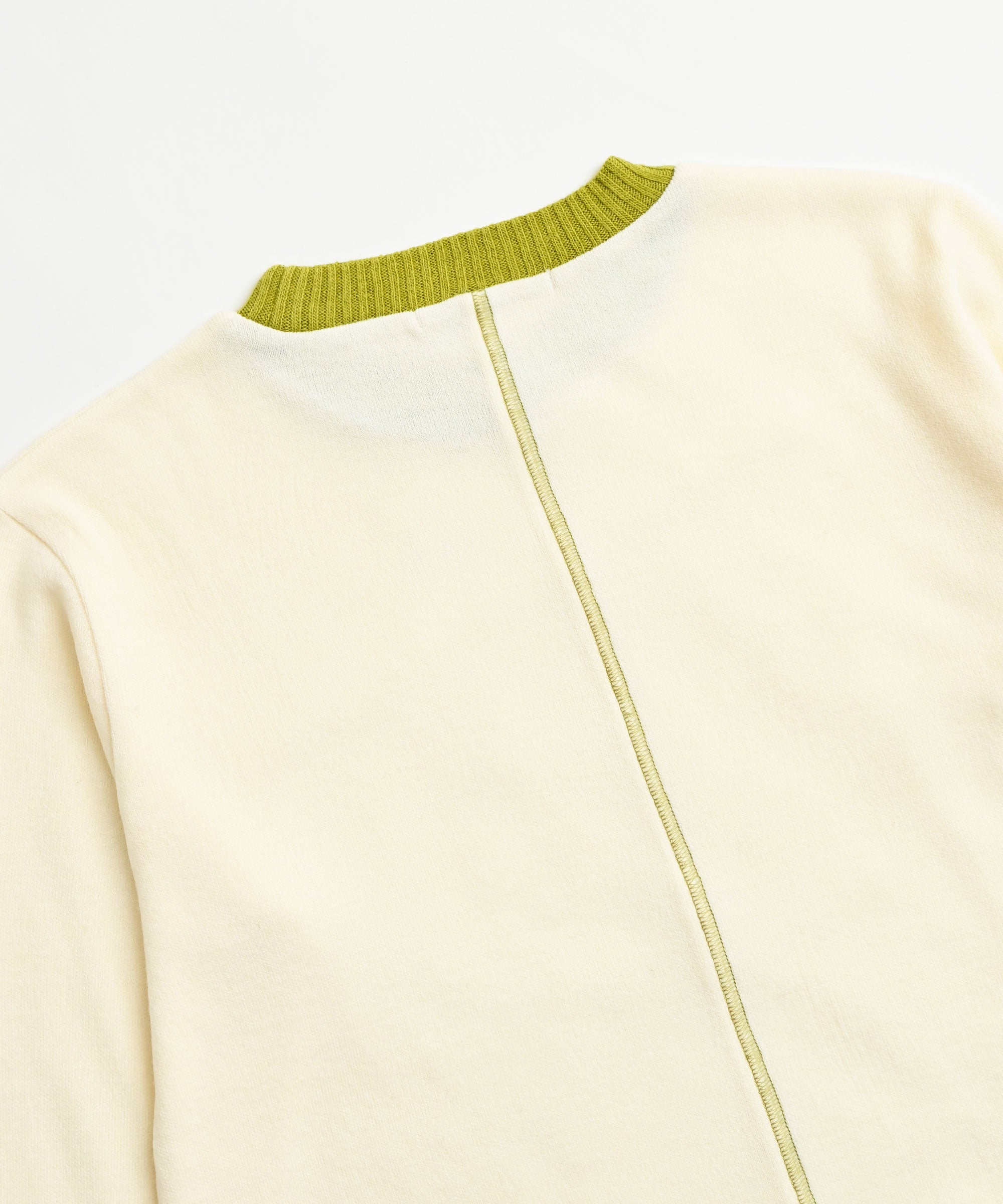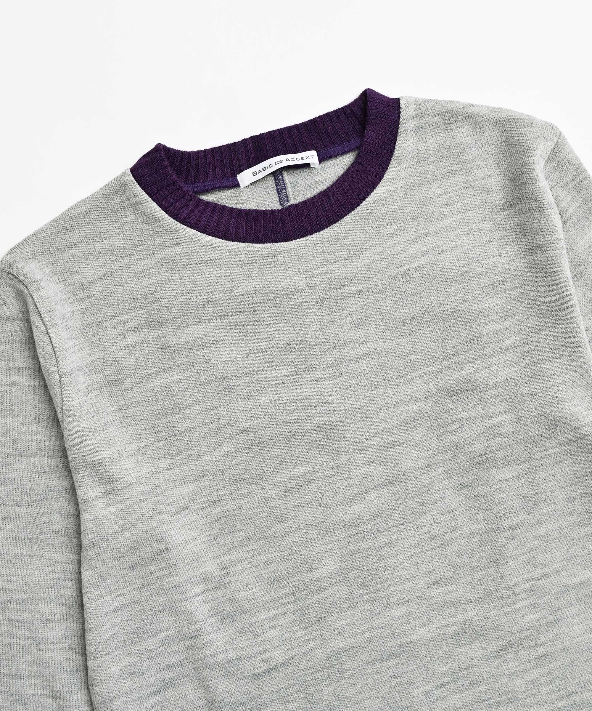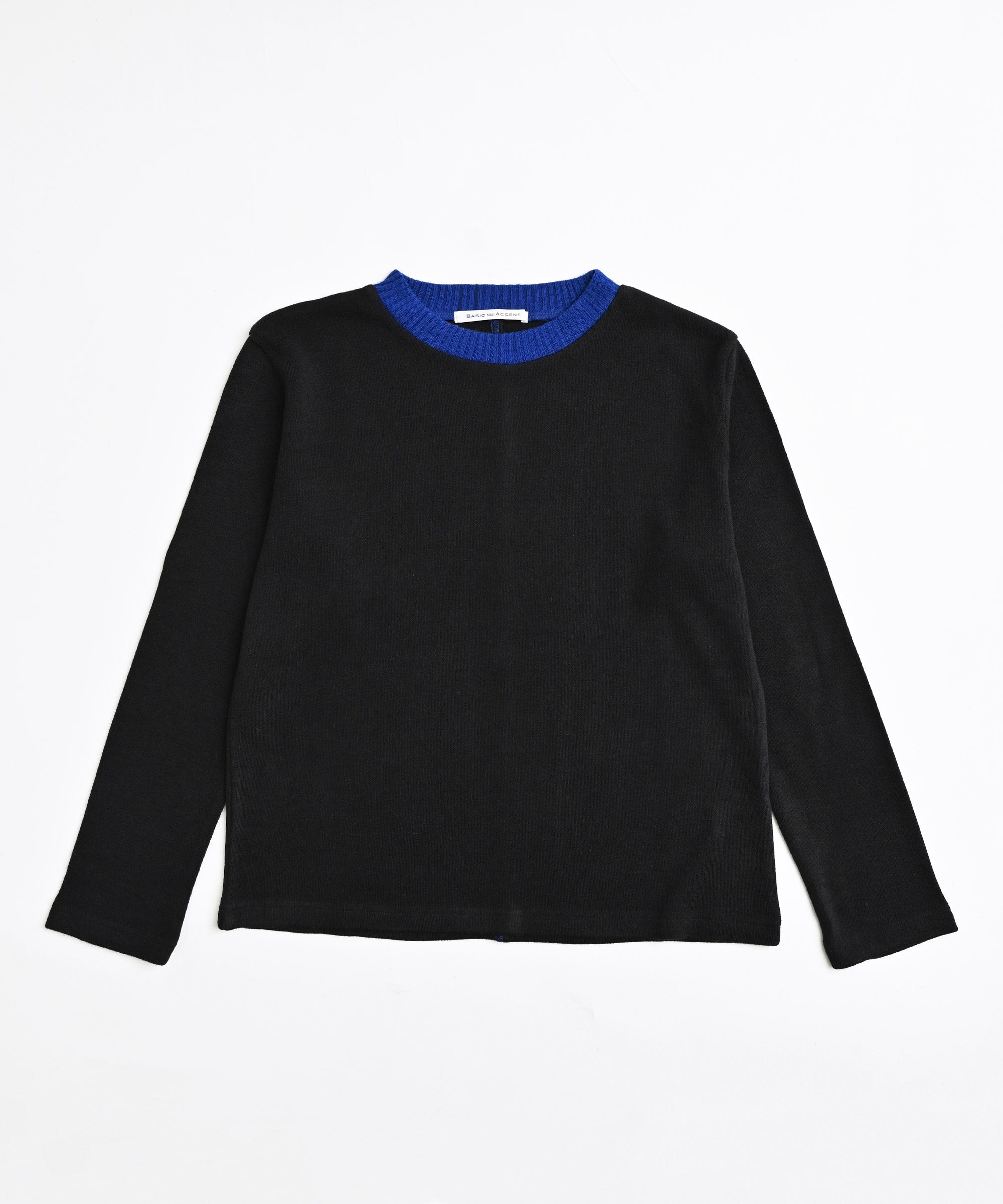 リブの配色と、バッグステッチがアクセントになった、軽く程よいボリューム感のあるニットソー。