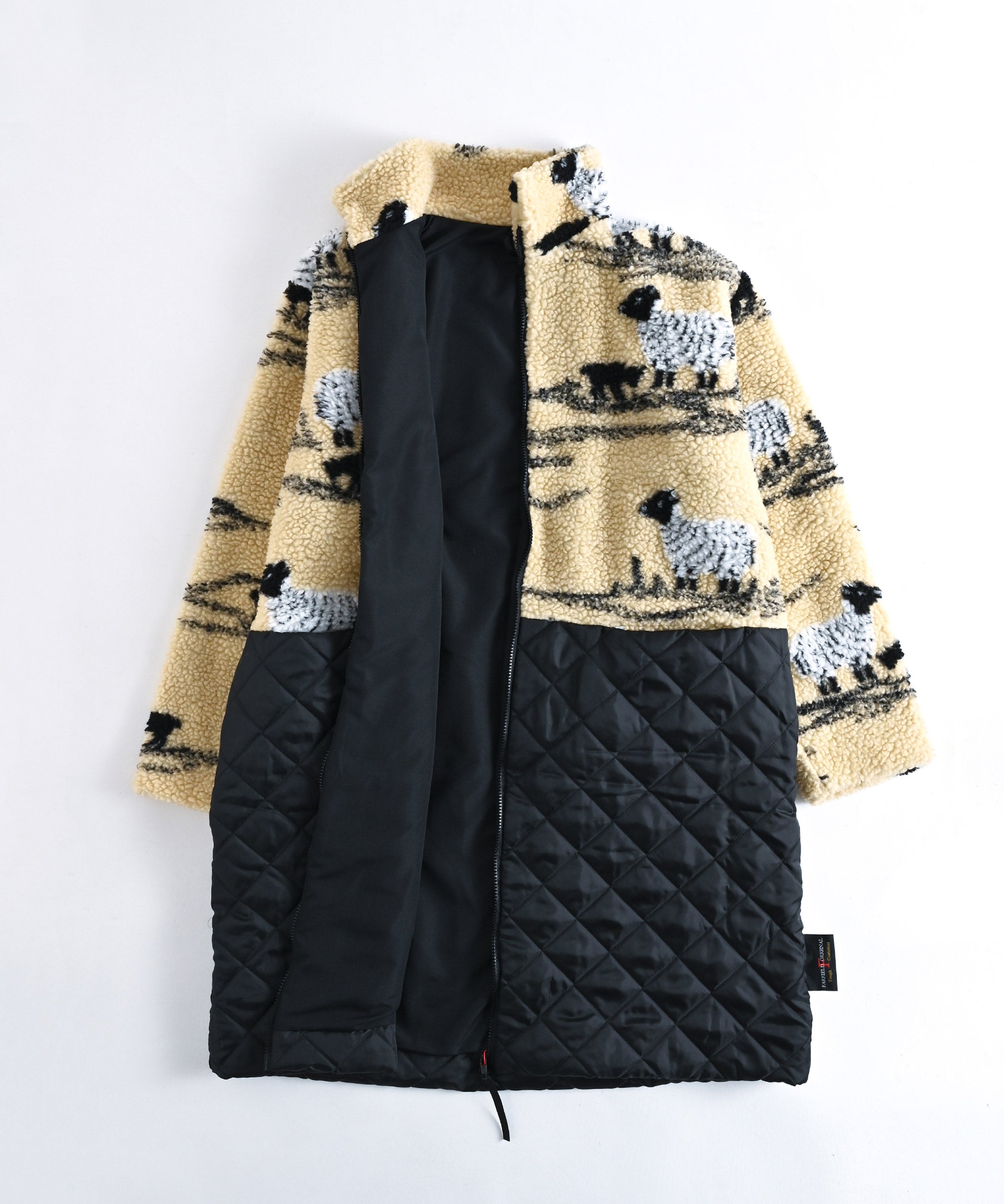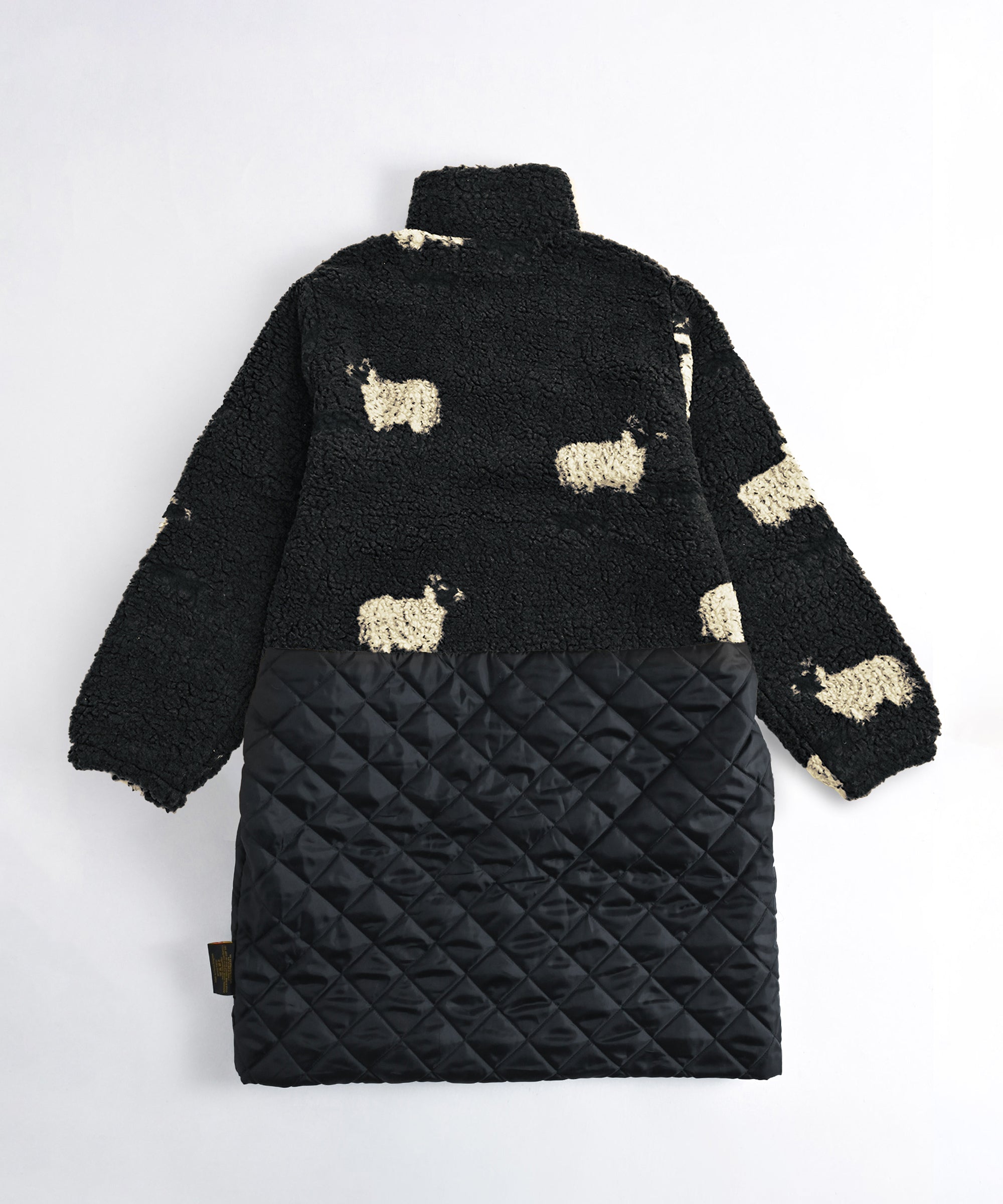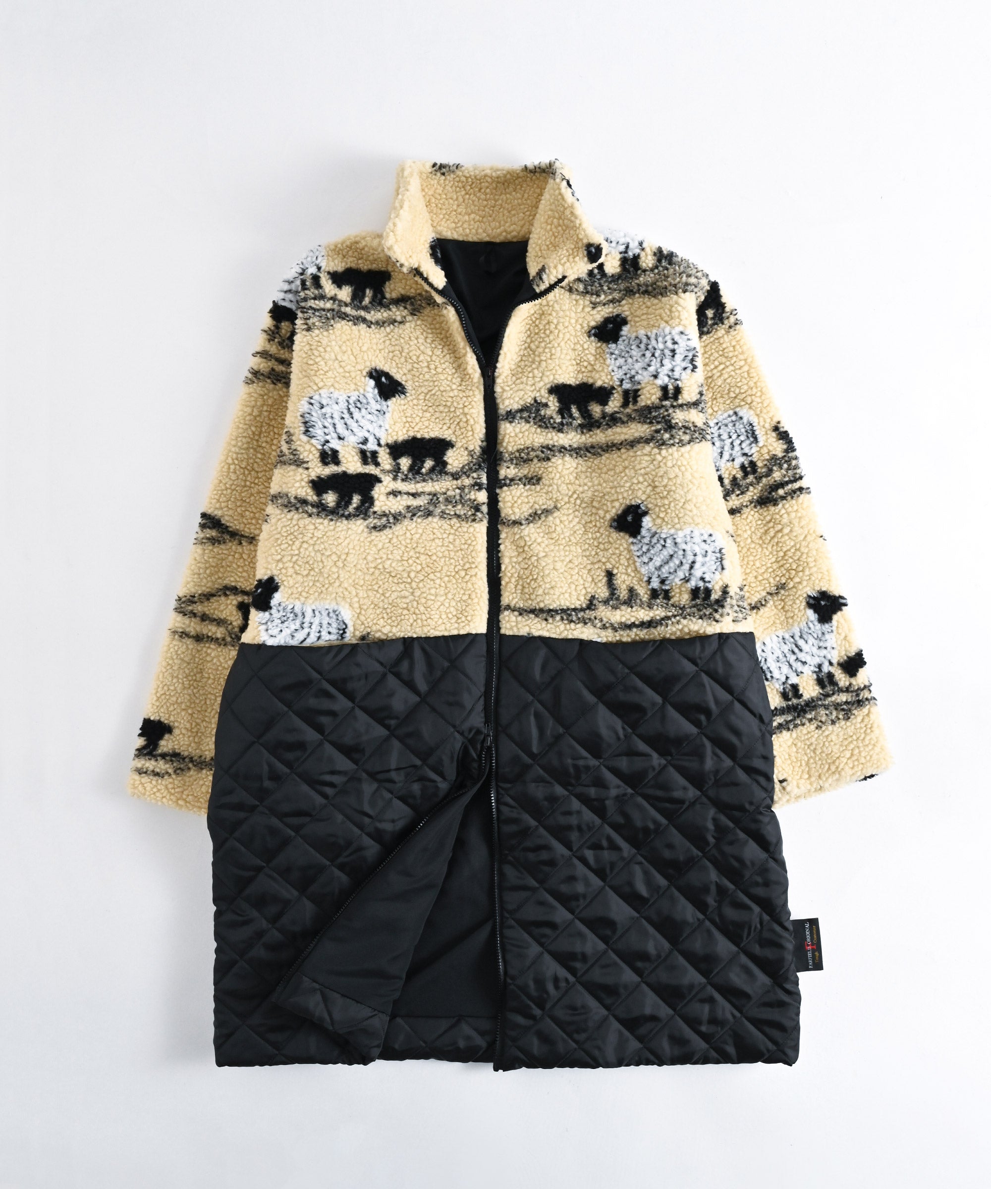 ”羊と子羊”の柄がユニークなフリース素材とキルティング生地がコンビになったミドルコート。