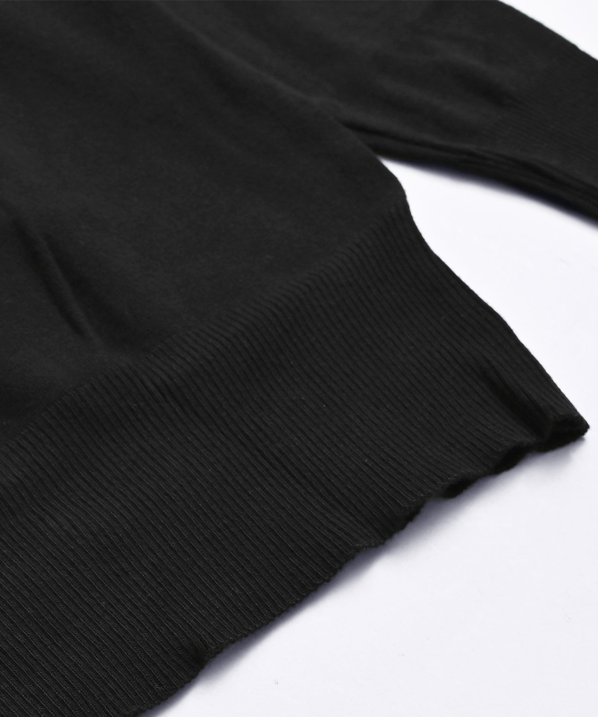 袖先、裾ともに8cm幅のシームレス2×2のリブ仕様で上品な仕上がりに。