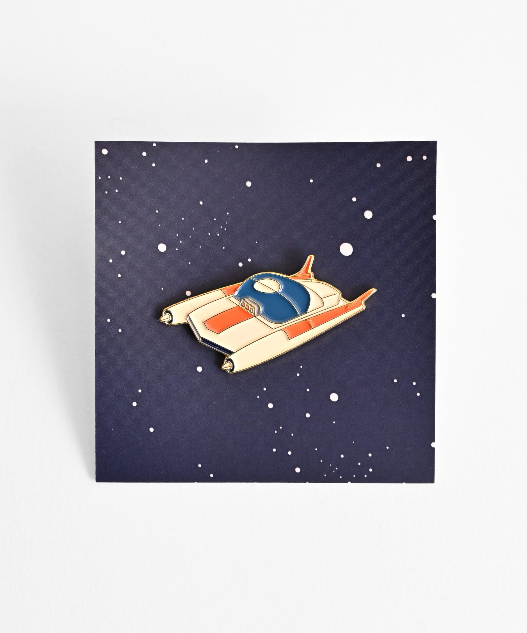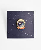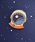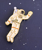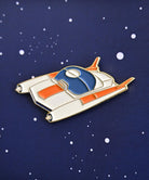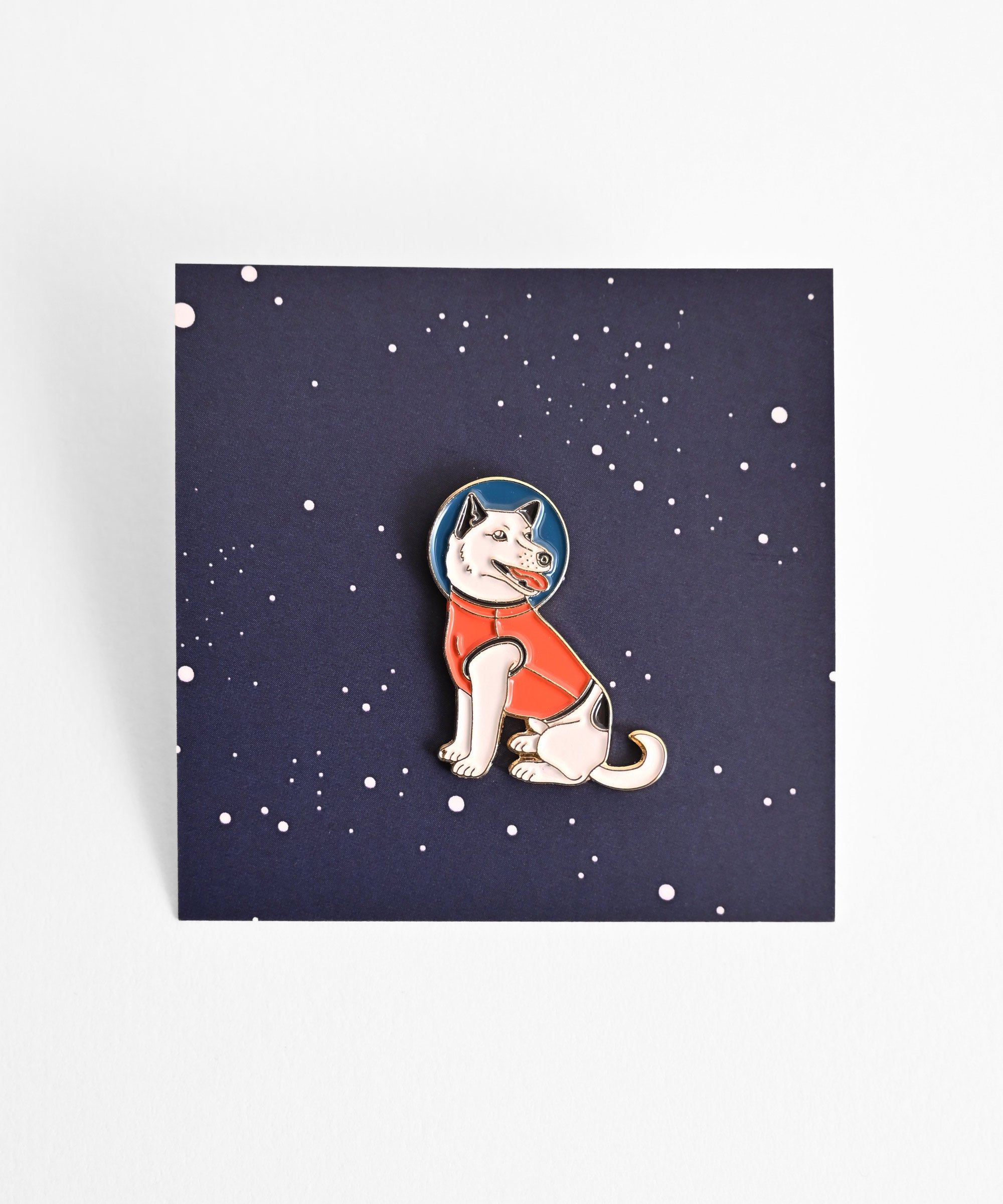 宇宙服を着た犬の形をしたピンバッジ。