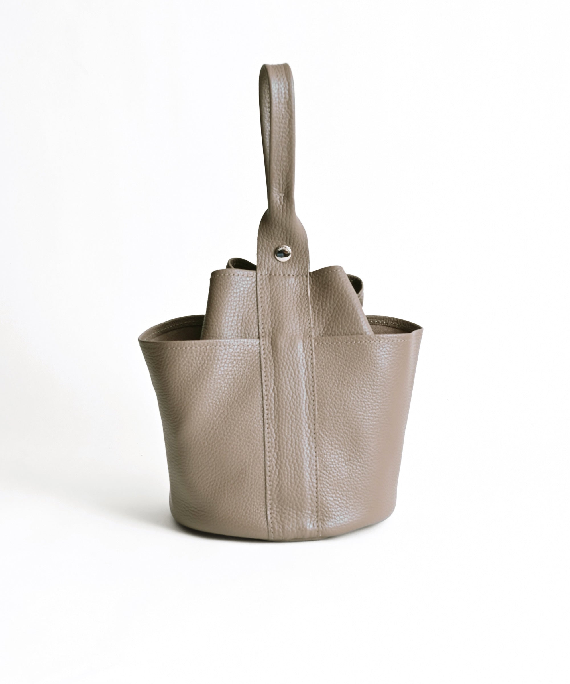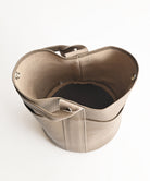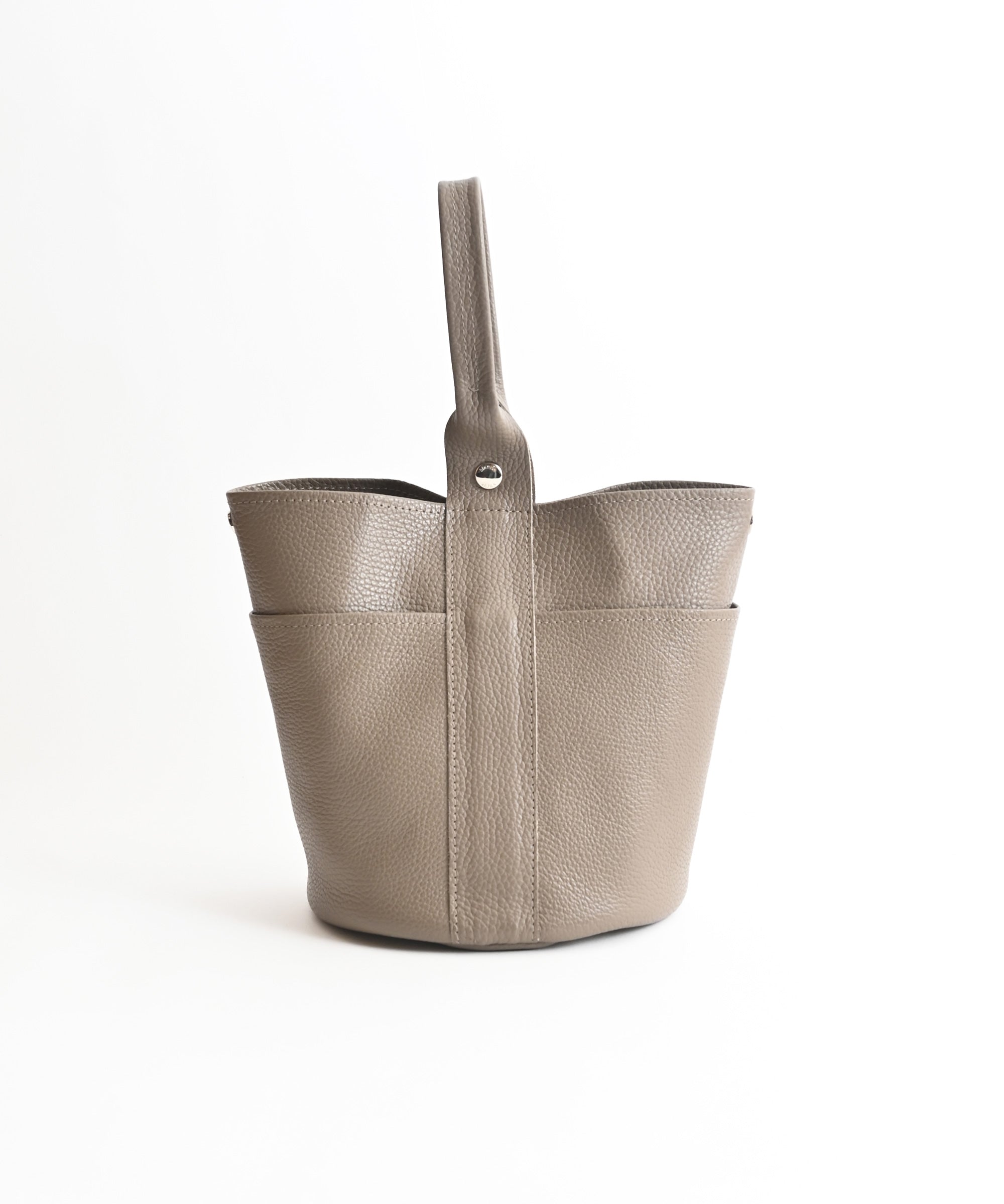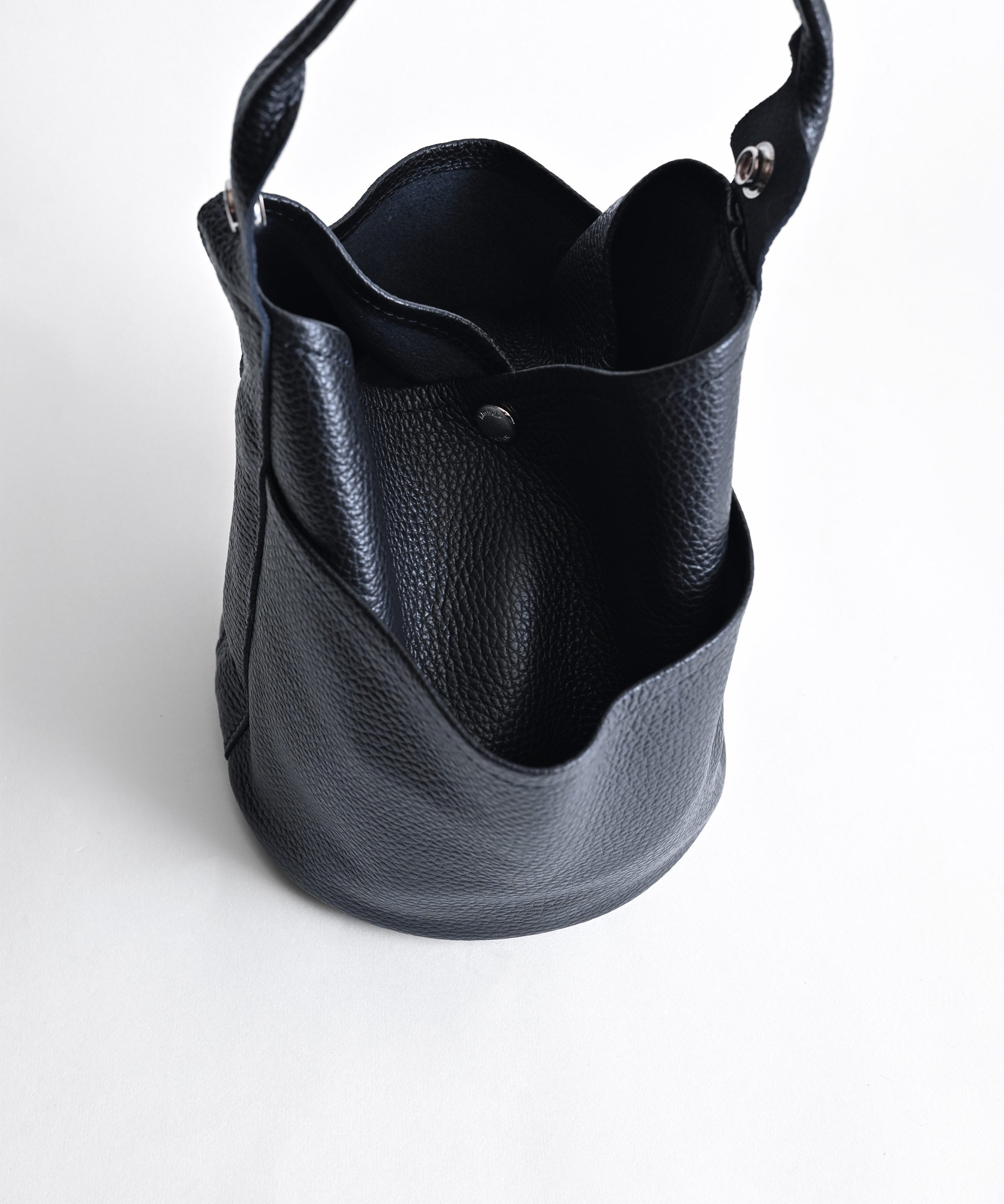 ワンハンドルの持ち手が特長で、荷物が少し多い場合はハンドルの根元のホックを留め、荷物が少ない時は口元のホックも留めてフォルムの印象を変えられます。