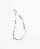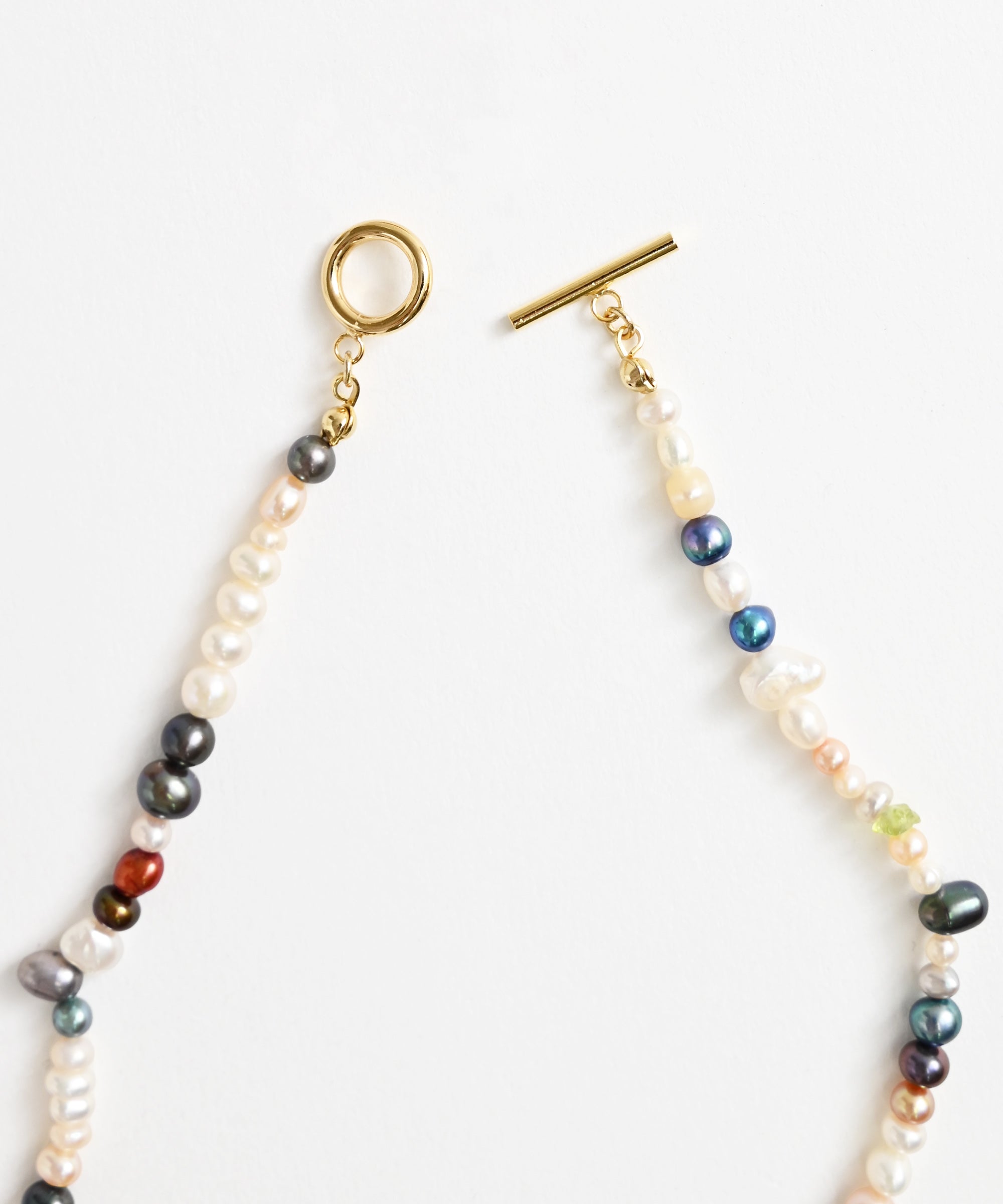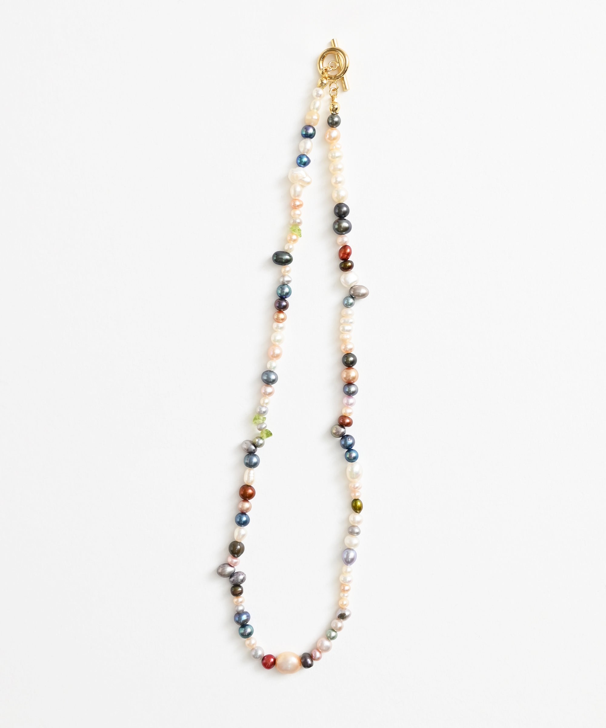 パールとミックスストーンがランダムで組み合わせられたネックレス。鮮やかなカラーの組み合わせが目を引く、コーディネートのアクセントになるアイテムです。