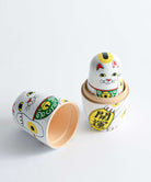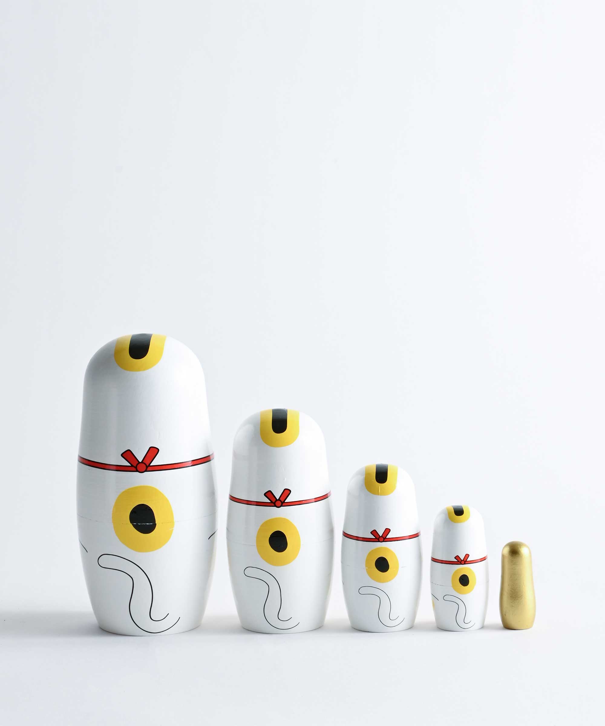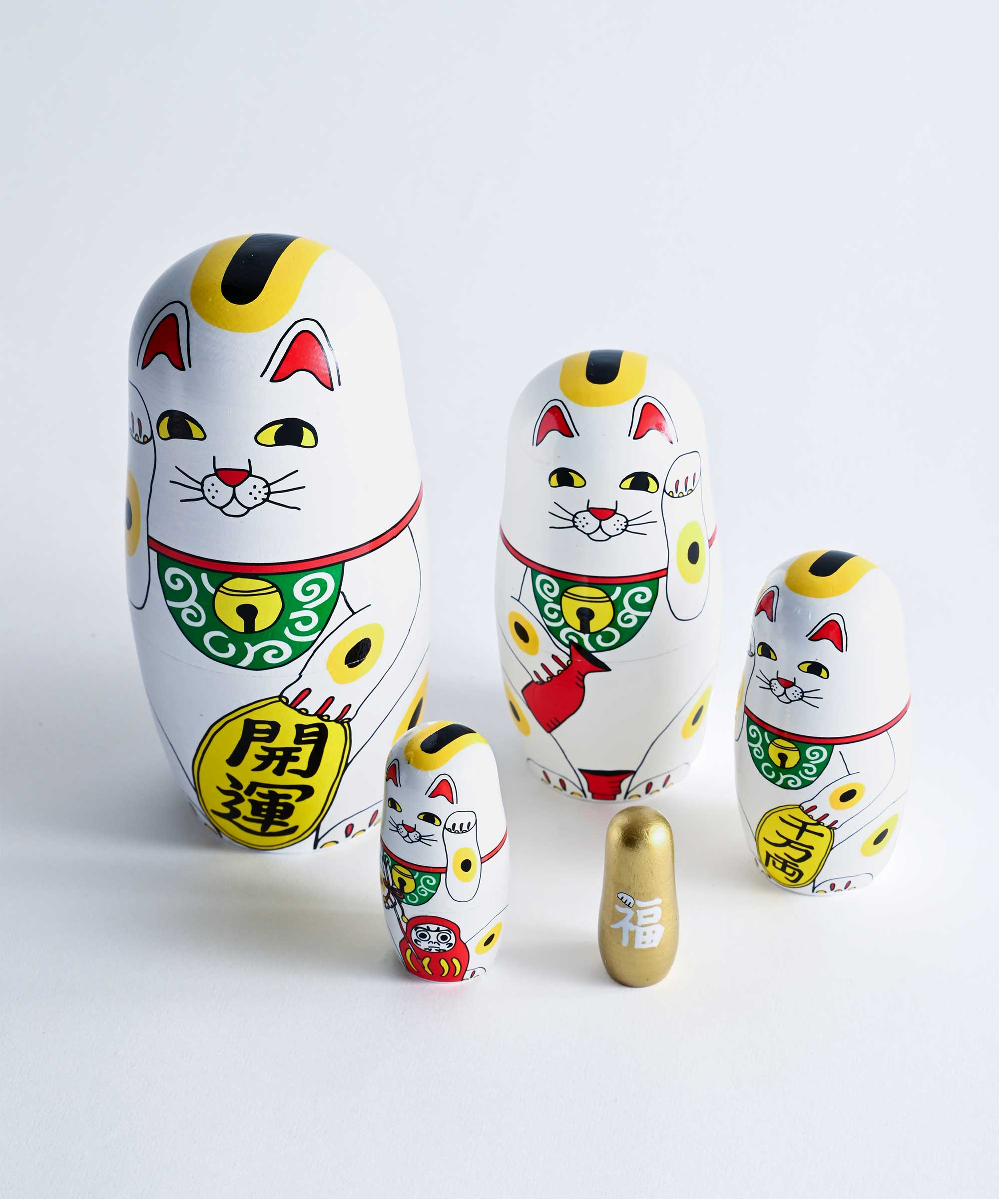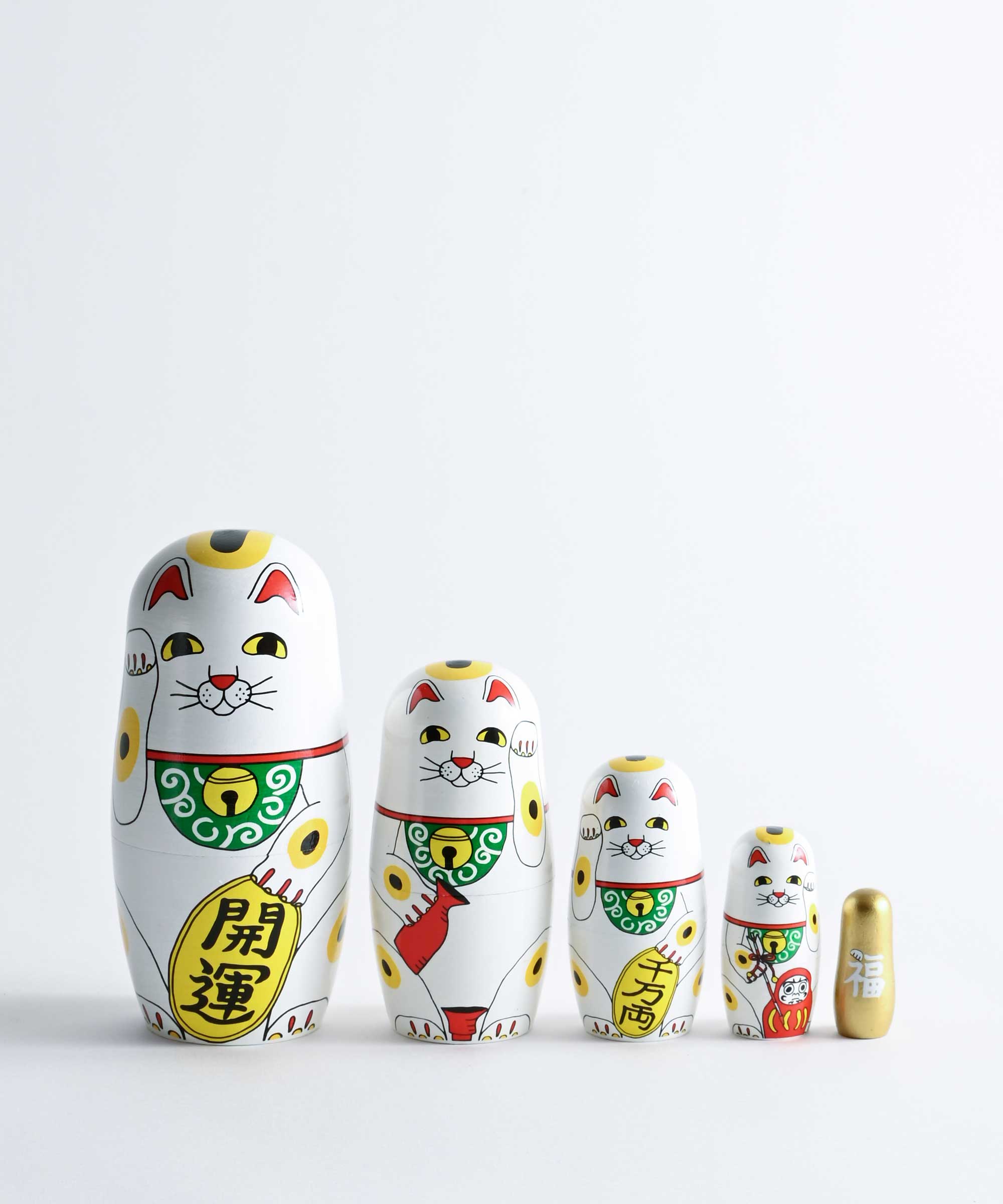 商売繁盛や千客万来などの願いを込めて飾られる縁起物である招き猫を Komatsu Midori デザインでマトリョーシカに。
