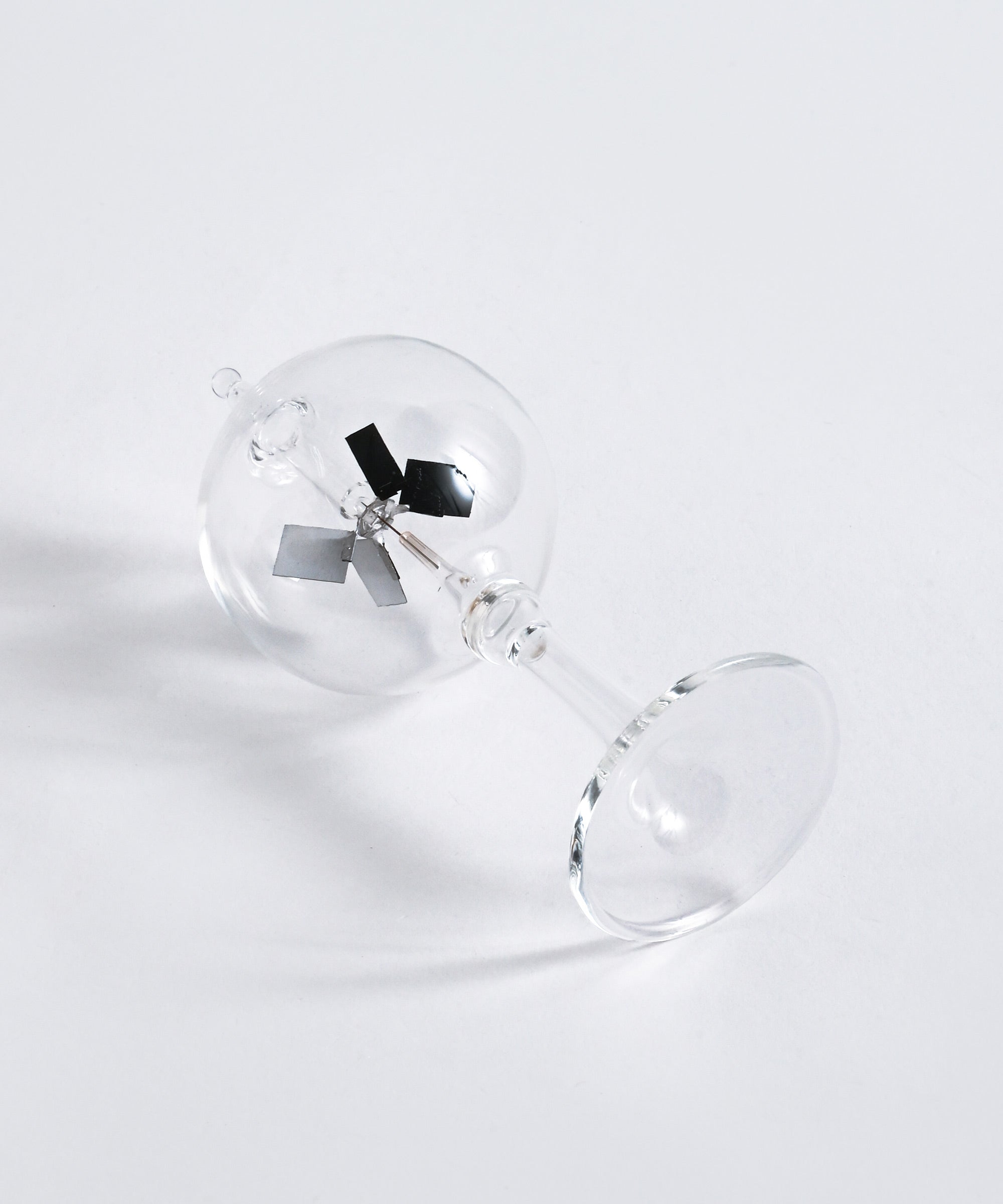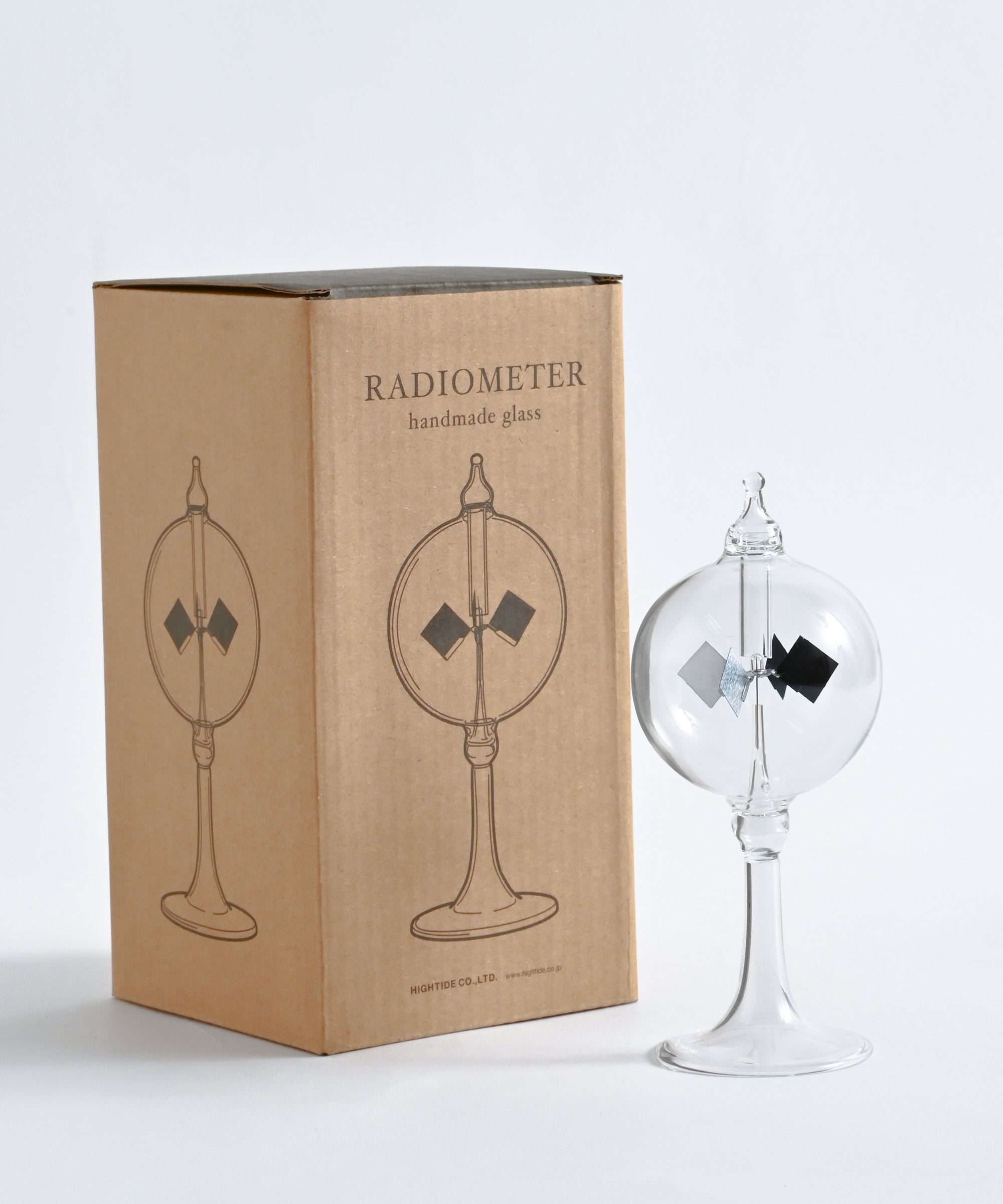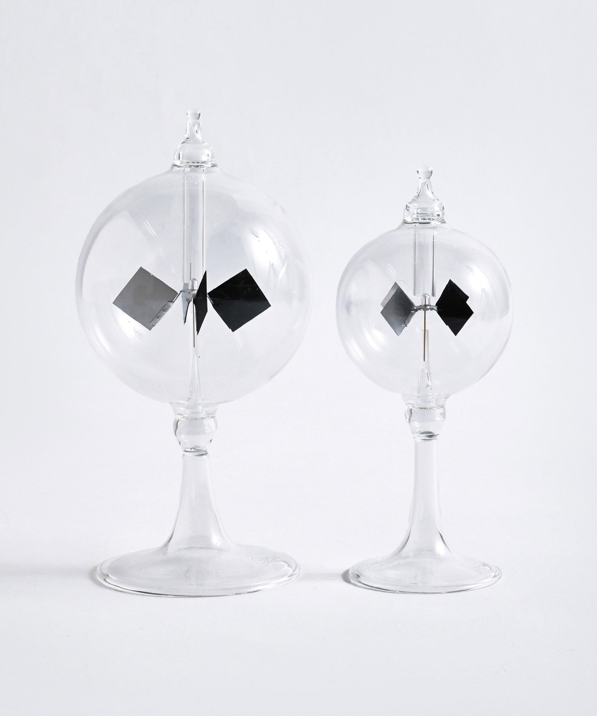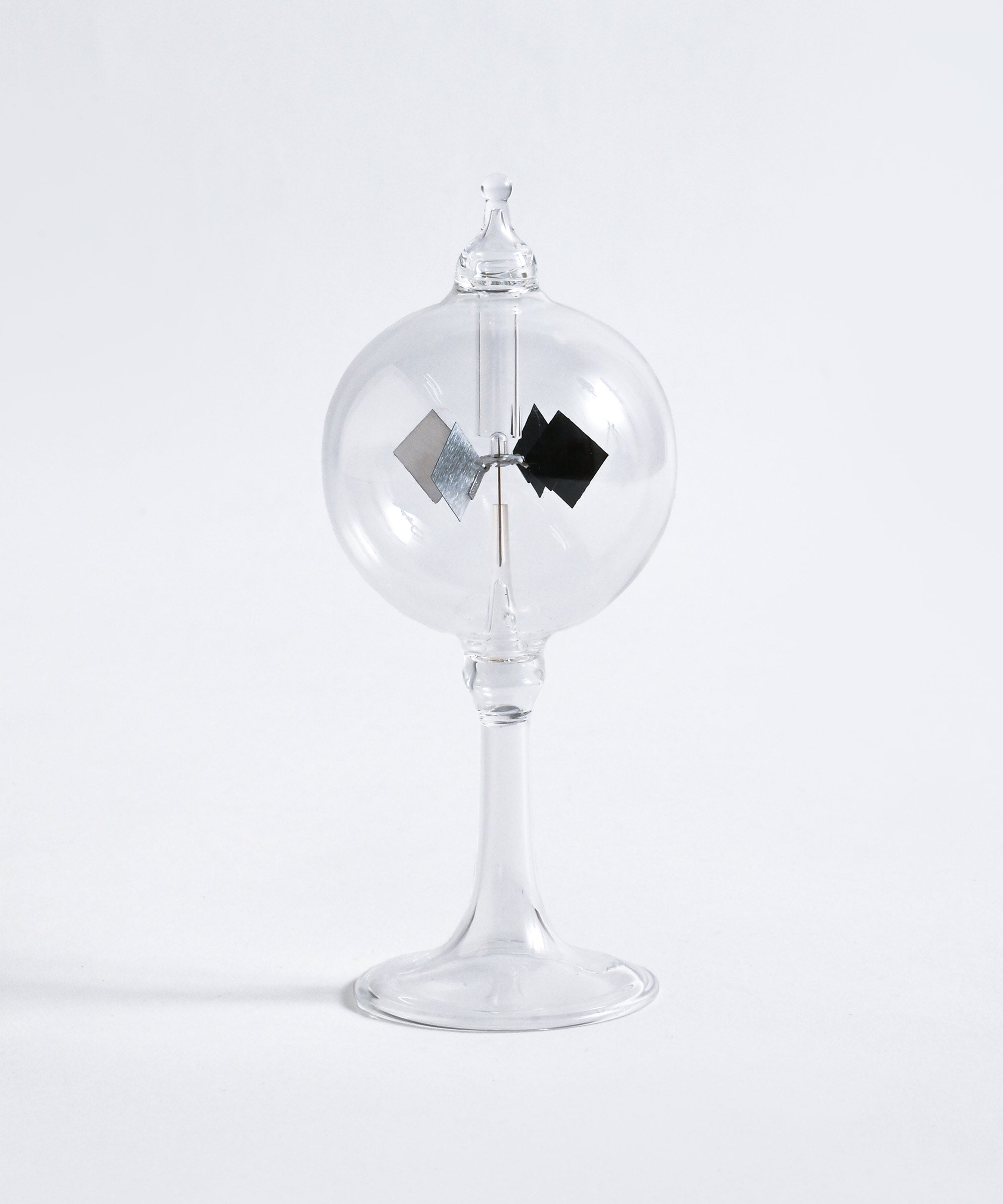 ラジオメーターは光エネルギーを運動エネルギーに変換する実験器具として、イギリスの物理学者ウィリアム・クルックスにより1870年代に考案されました。 ガラス内に羽の片面が黒い羽根車が収められたシンプルな構造ですが、その羽が赤外線を含む光に反応して回る不思議なオブジェです。実験器具でありながらも、その独特な美しい造形はインテリアアイテムとして高い人気を誇ります。