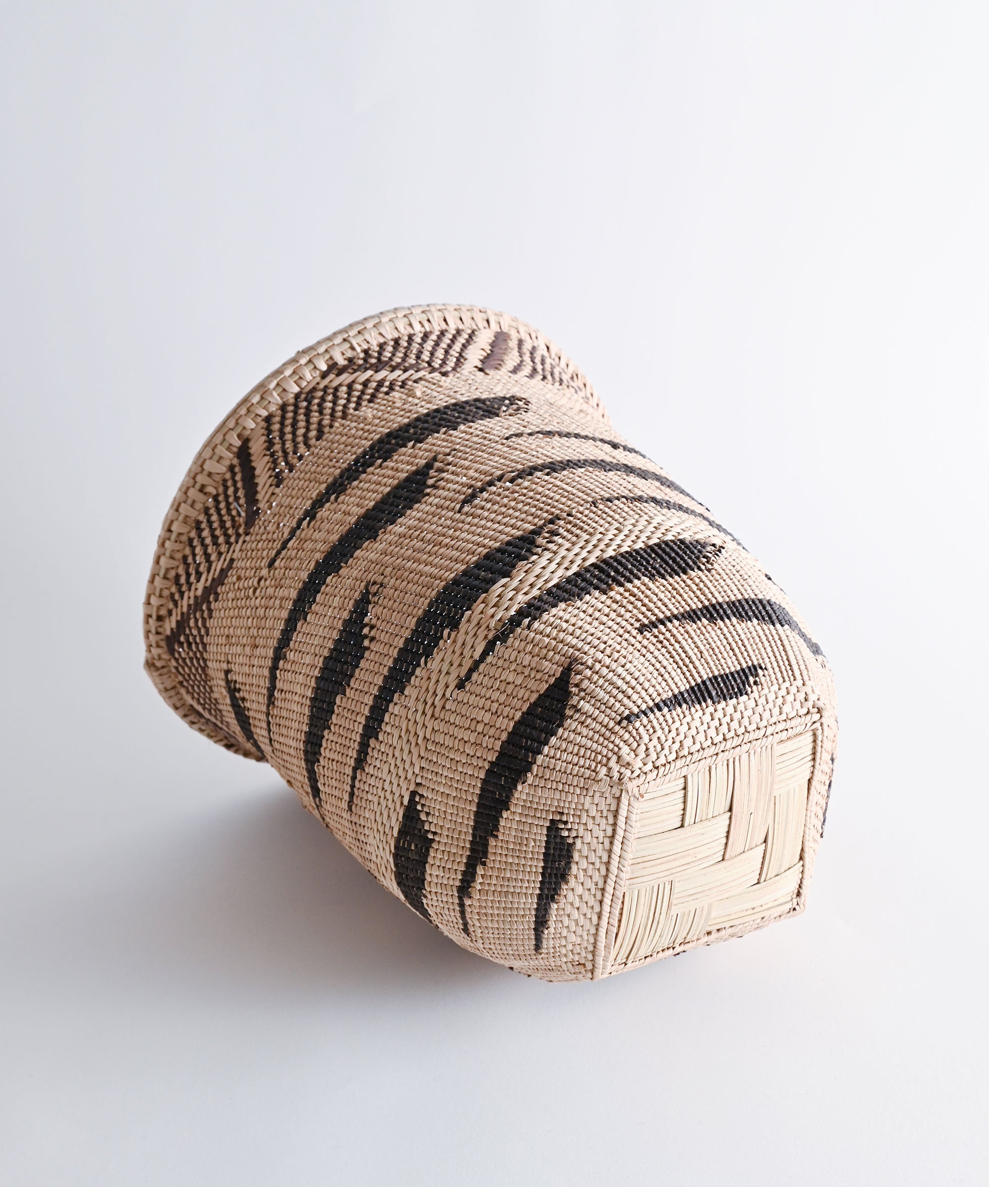 放射状の葛に、ナチュラルなイララの葉と、樹皮や根、泥で染色を繰り返したブラウンの葉の二色が編み込まれ、