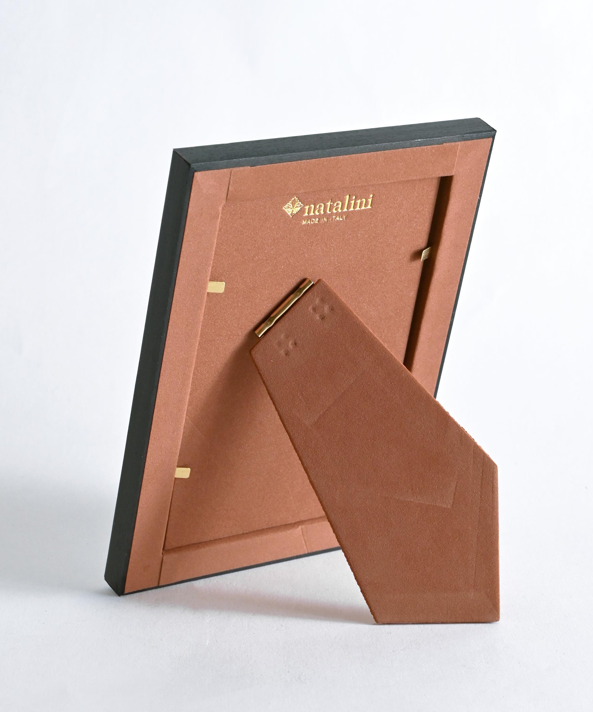 Nataliniのフォトフレームは裏面にも ベルベットペーパーを使用し、Nataliniのロゴが金色に箔押しされた丁寧な作りで、