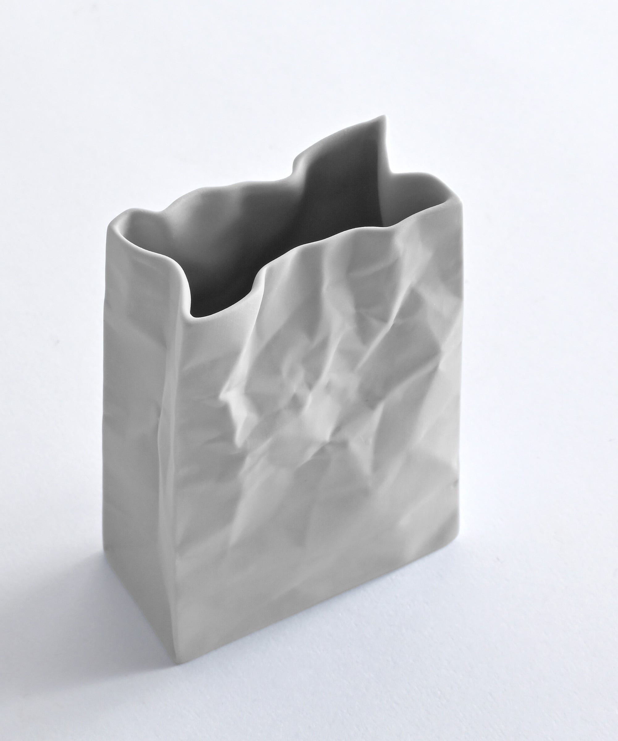 紙袋をそのまま陶磁器に仕立て上げたようなフラワーベース、”クリンクルスーパーバッグ”シリーズ。