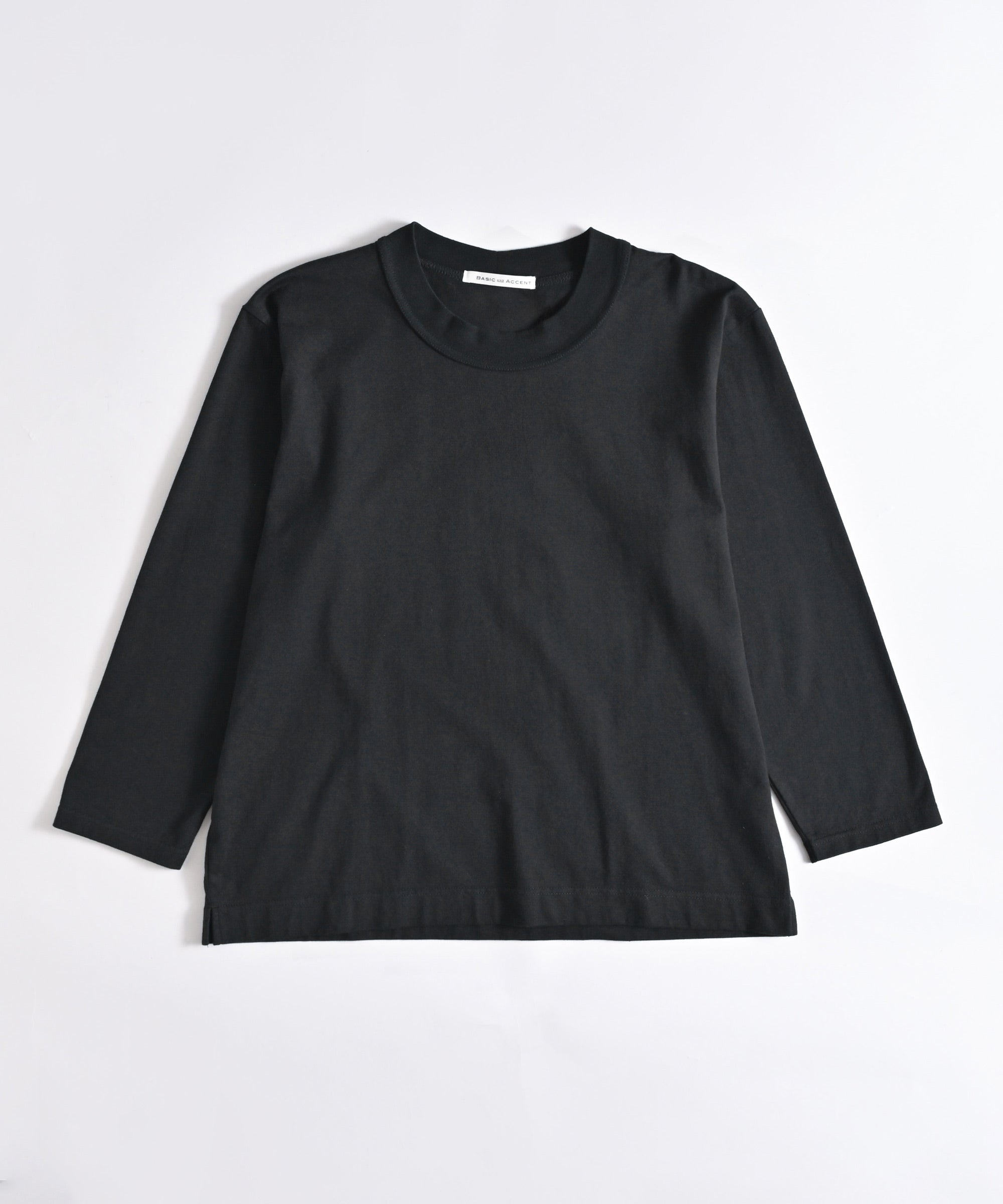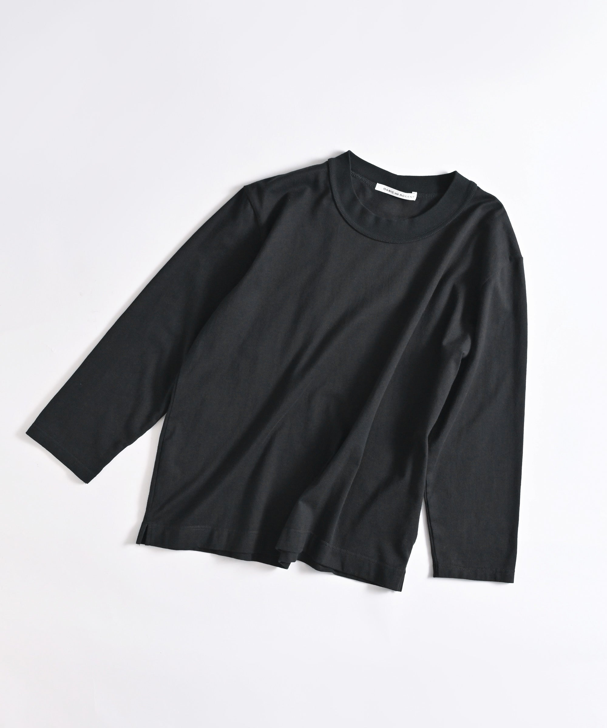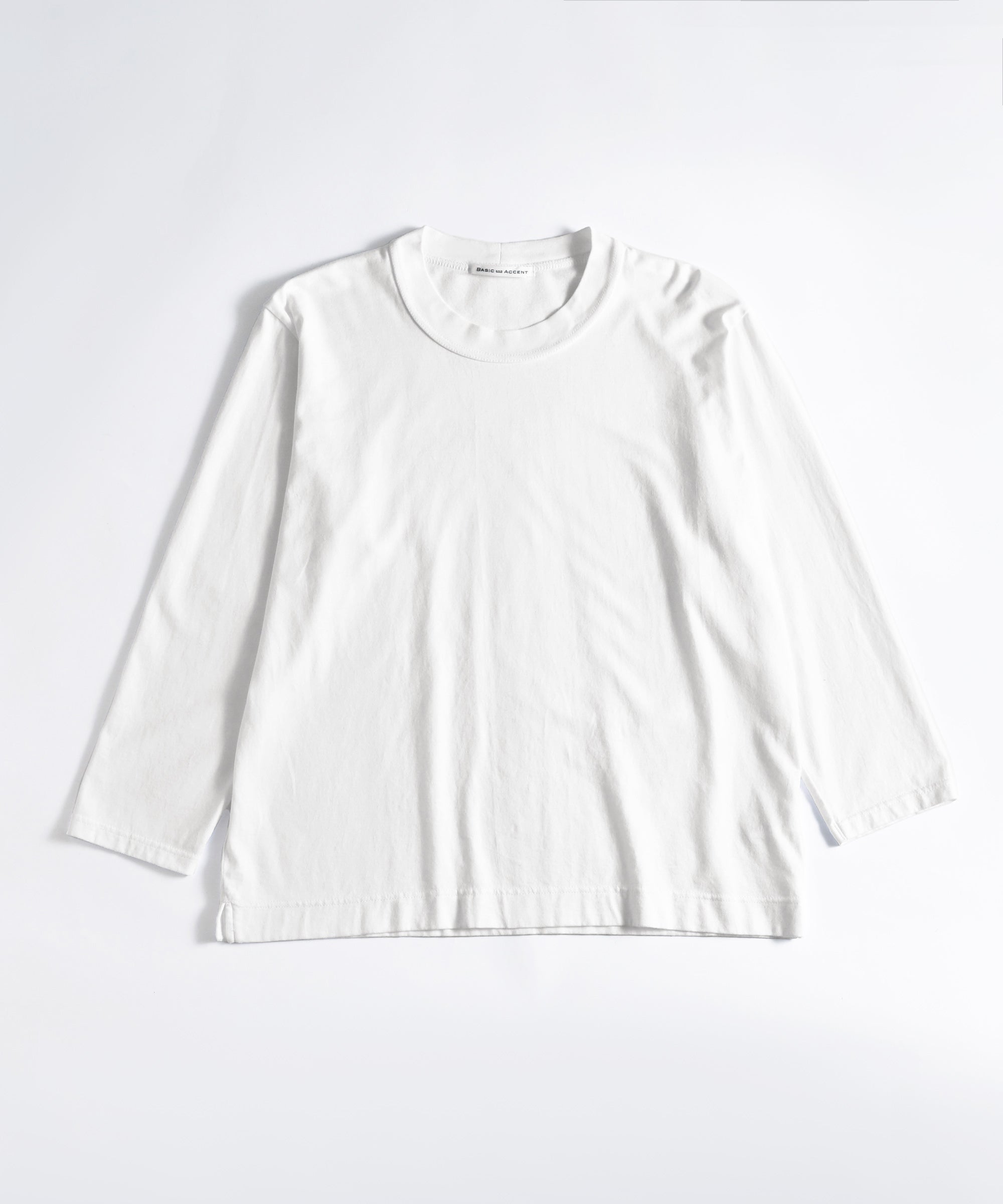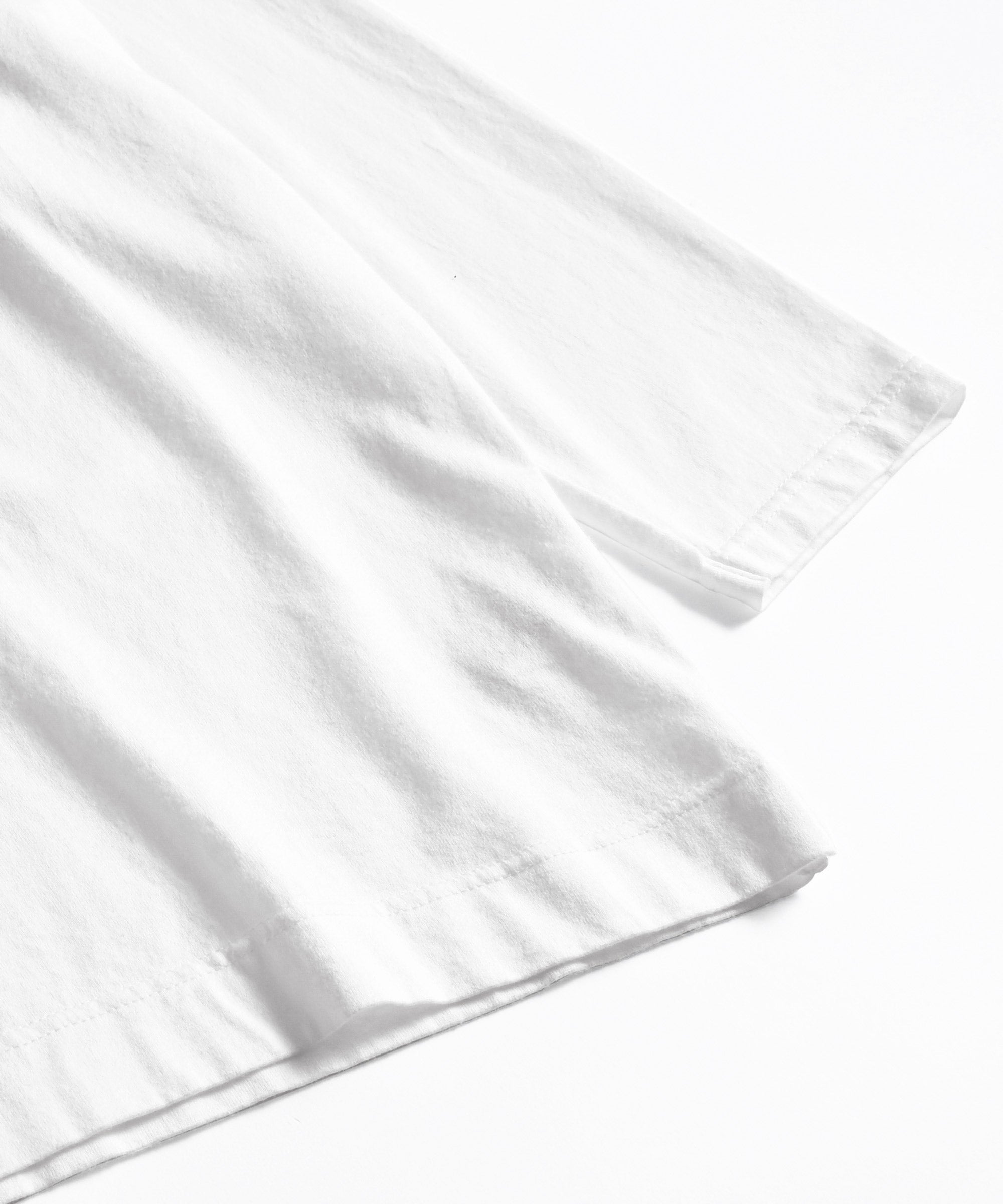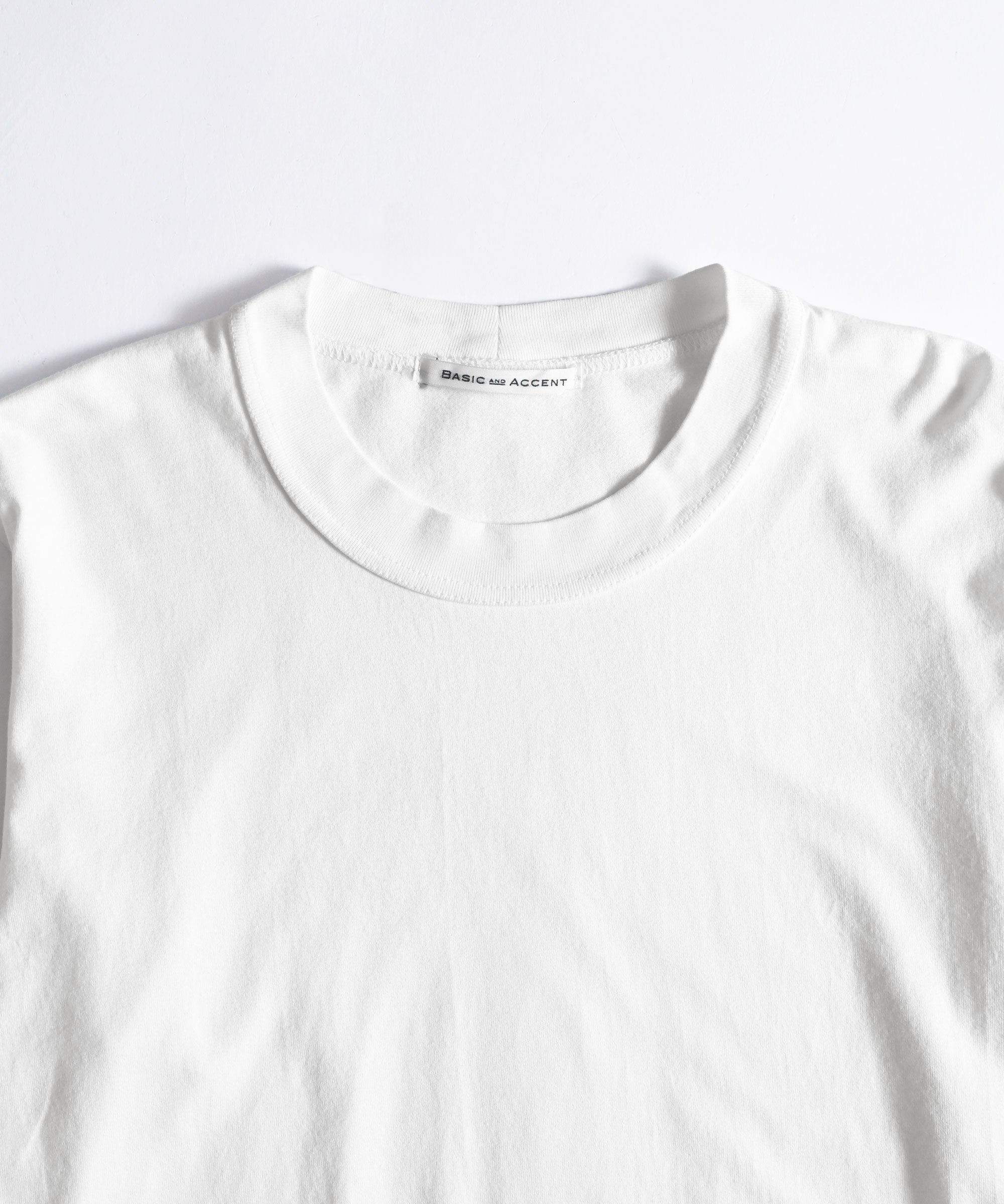 綿100%のふくらみのあるベーシックな天竺素材を使用した、BASIC AND ACCENTではロングセラーの定番Tシャツです。しっかりとした生地感なので透けを気にせず着用いただけます。太めの衿ぐり幅と首の詰まったクルーネックで、カジュアルコーデはもちろん、「きちんと見え」もする、着こなしの幅広いアイテムです。ワンウォッシュ加工を施しているので、洗い上がりのような風合いがあり家庭洗濯での洗い縮みも抑えています。2サイズ展開。
