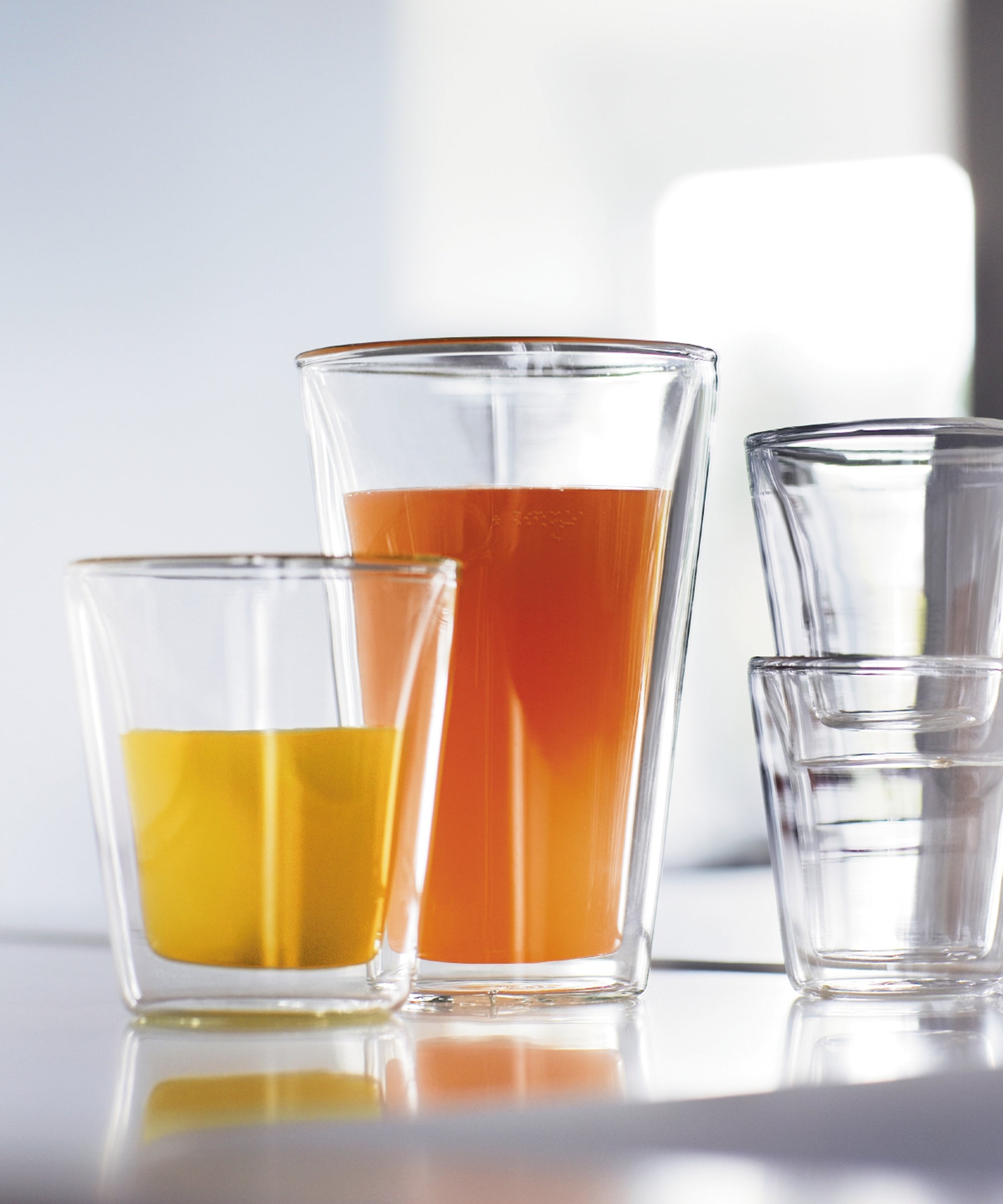 ダブルウォールドリンクグラス。 温かい飲みものは温かく、冷たい飲みものは冷たく保つ、画期的な二重構造。スープや冷たいデザートにも最適。吹きガラス製法、耐熱性ホウケイ酸ガラスを使用。2枚のガラス層の間の空気圧を均等に保つ疎水性シリコンベント。食器洗浄機/乾燥機、電子レンジ、オーブン使用可能。(180℃まで)