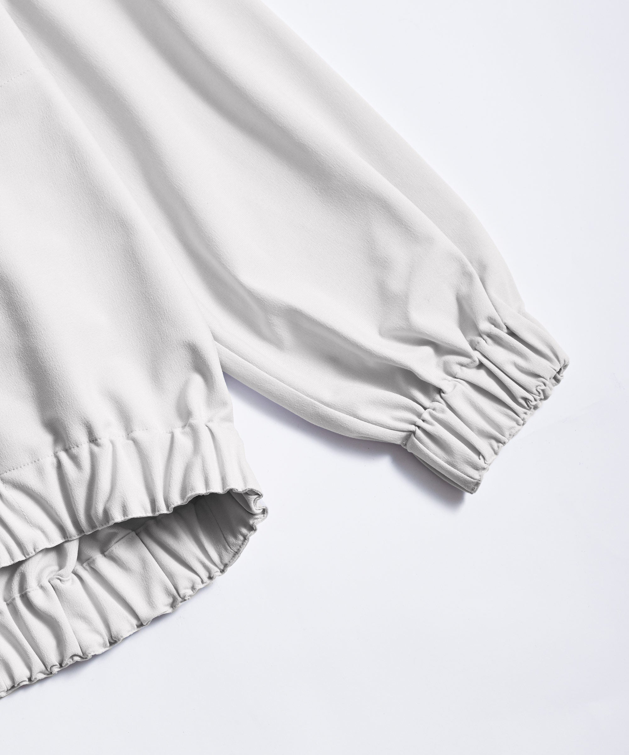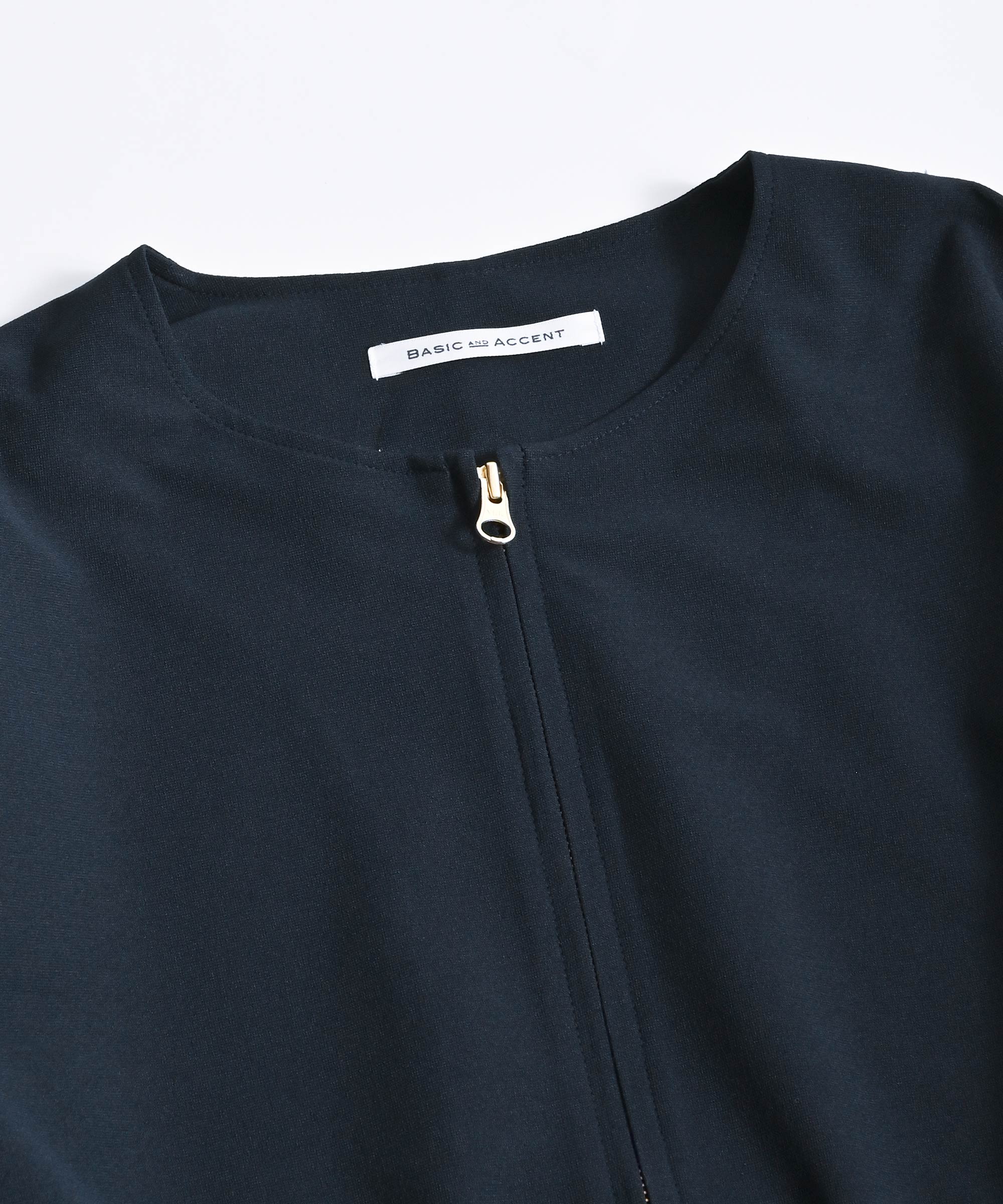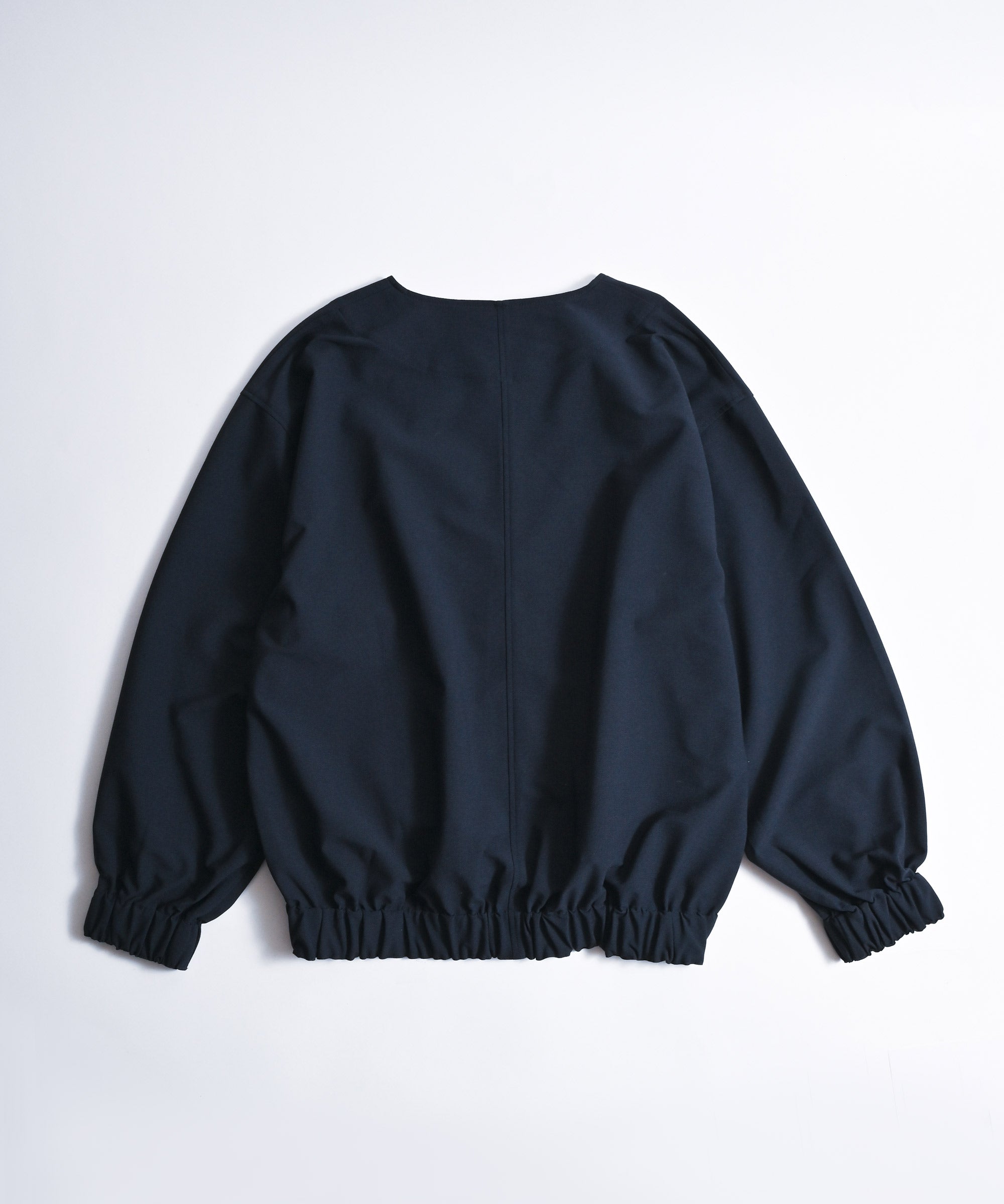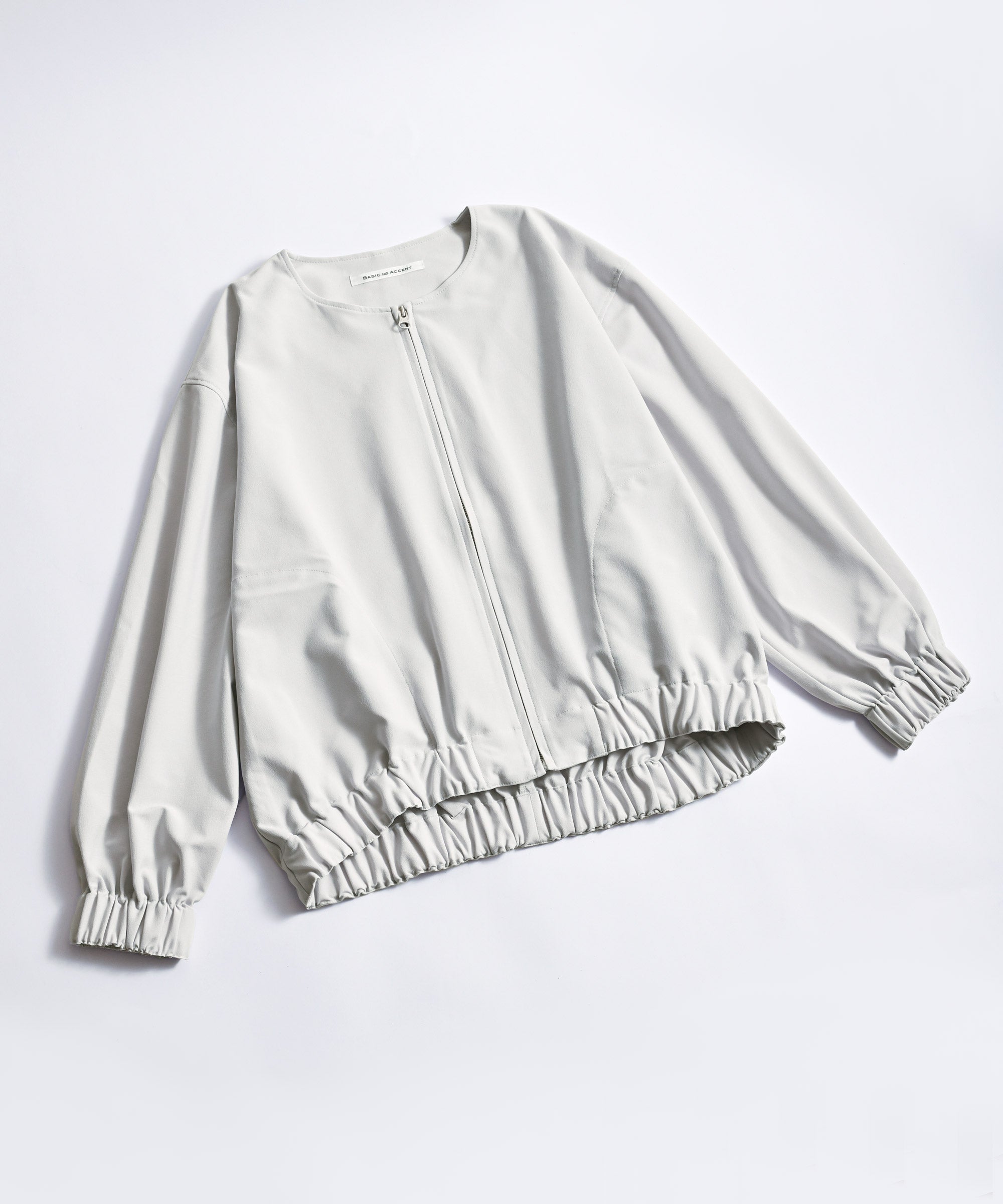 襟なしのスッキリとしたデザインのライトブルゾン。袖と裾にギャザーが入っているので程よいボリューム感があり、どんなボトムスとも相性抜群。薄手のライトアウターとして、まだ寒い時期にはトップスとして着回し抜群で、気温の変化の大きい季節の変わり目に1枚あると便利なアイテムです。