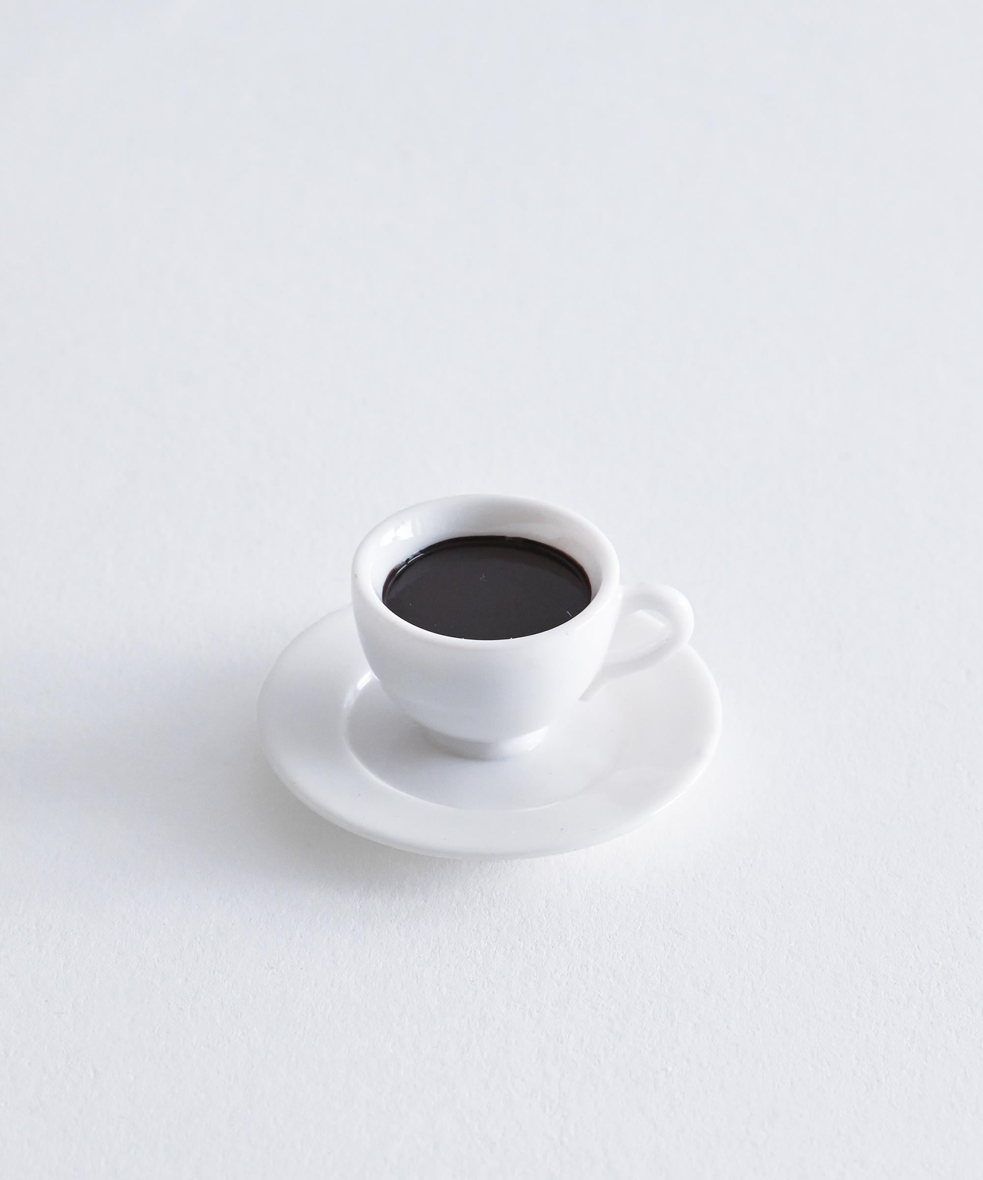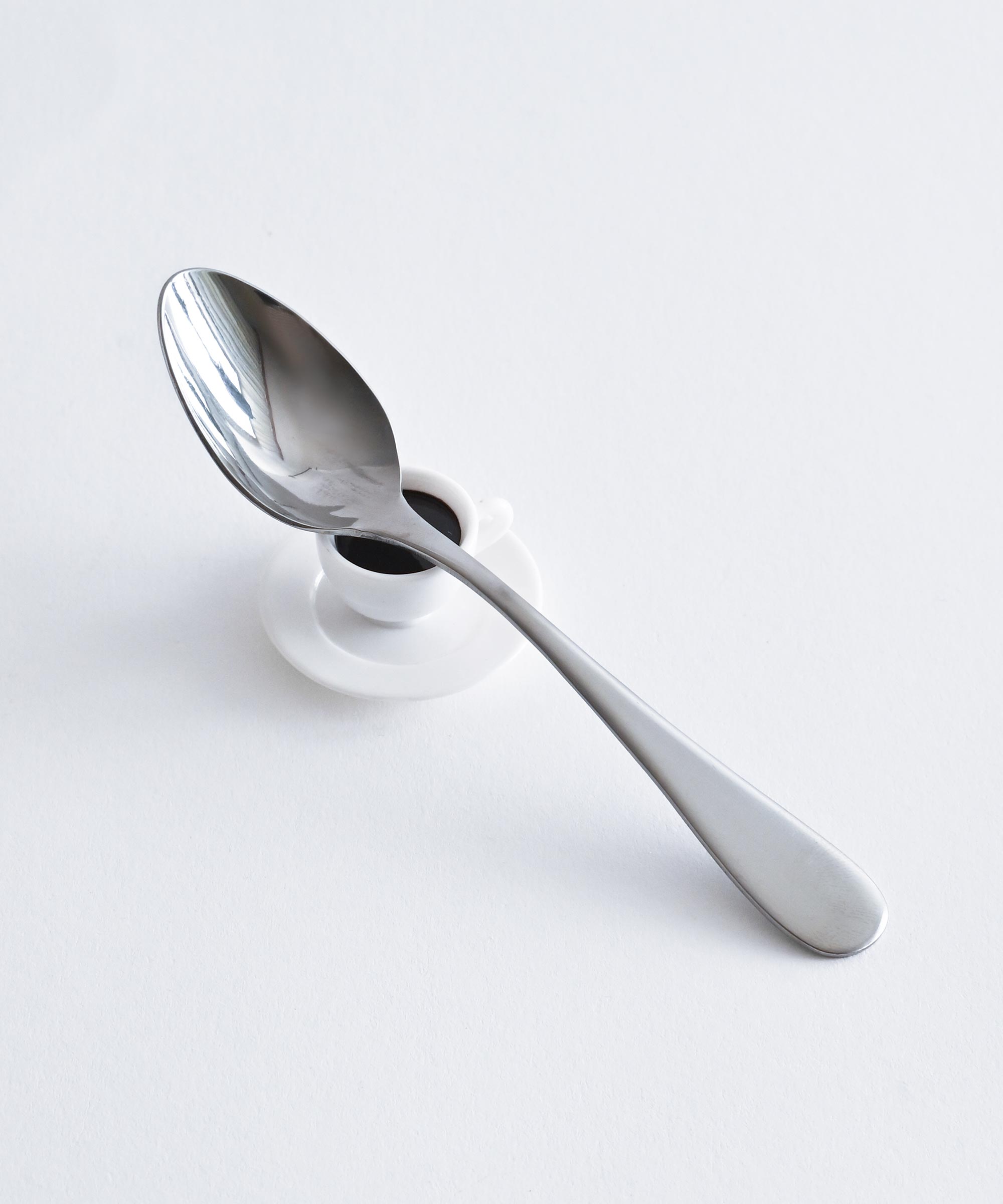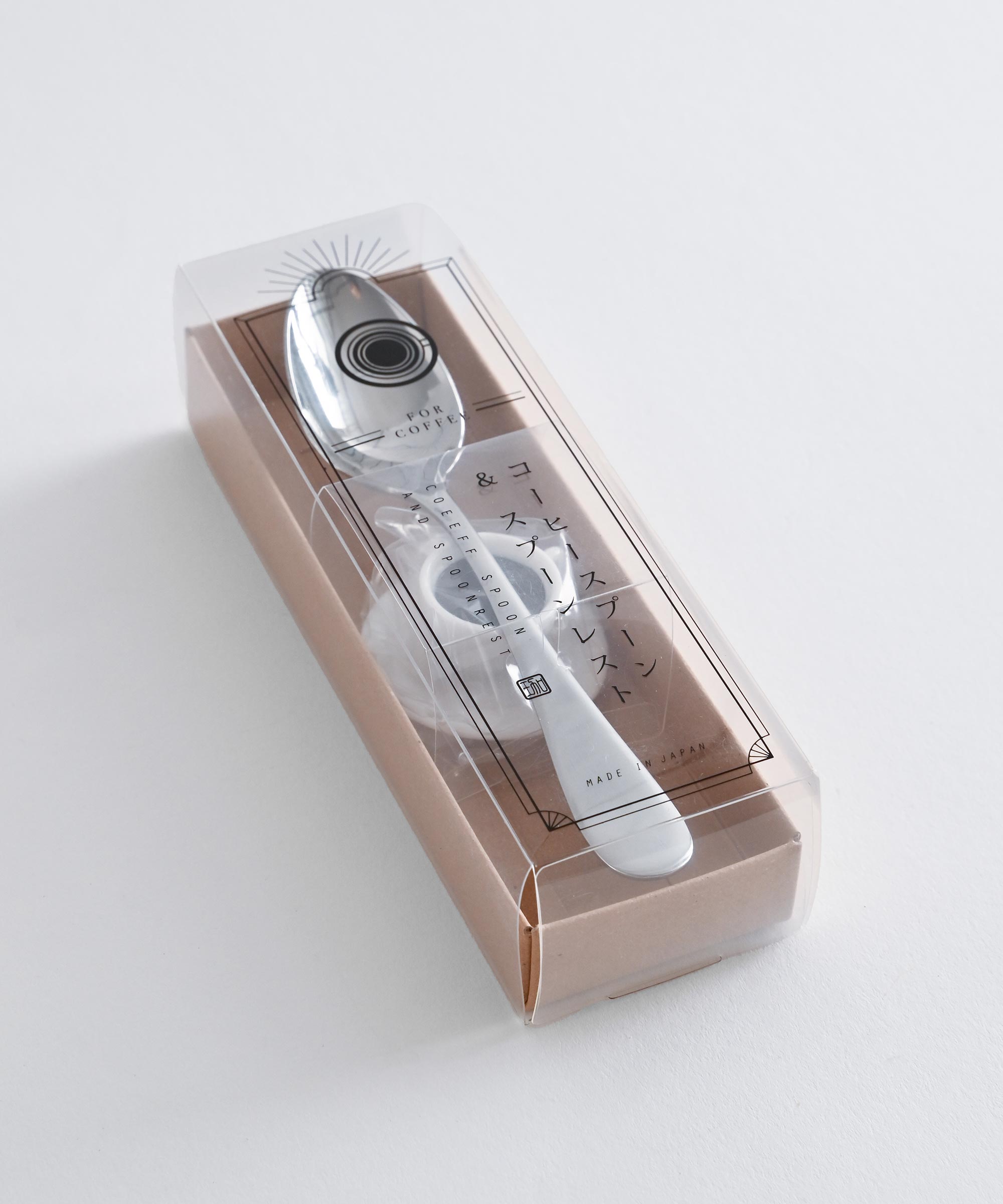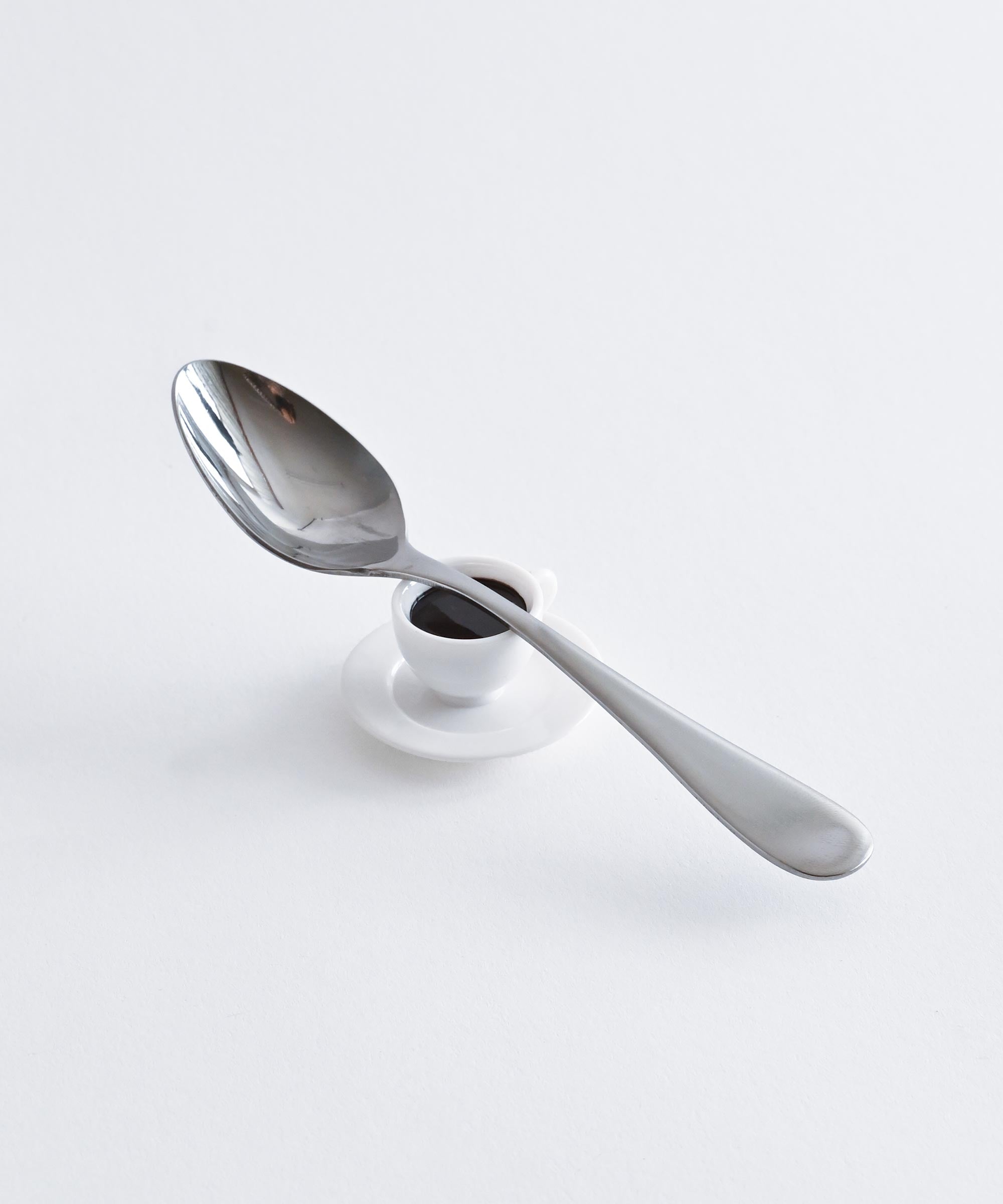 コーヒースプーンにぴったりのスタイリッシュなカトラリーと、食品サンプルのようなミニチュアコーヒーカップ型のカトラリーレストがセットになっています。